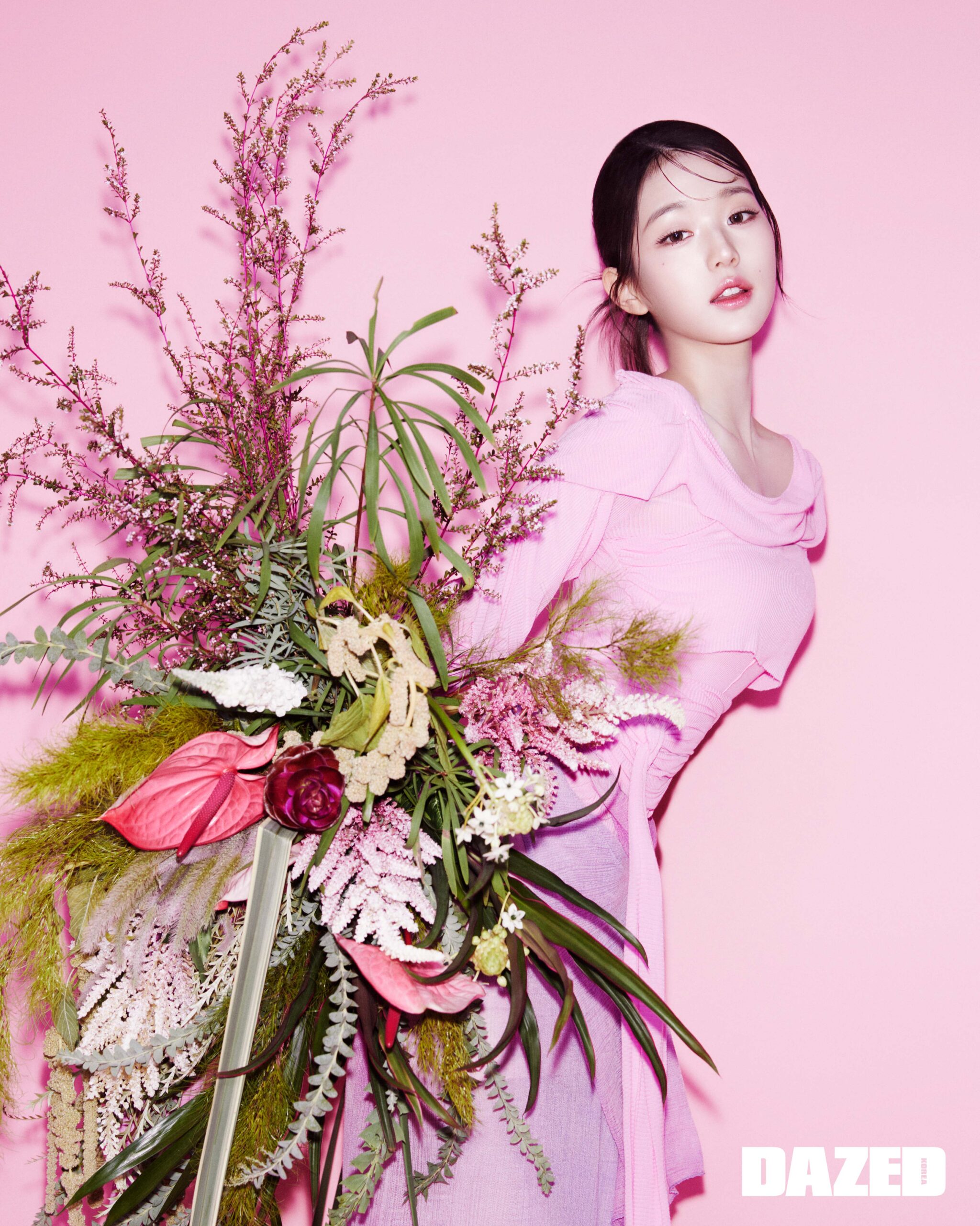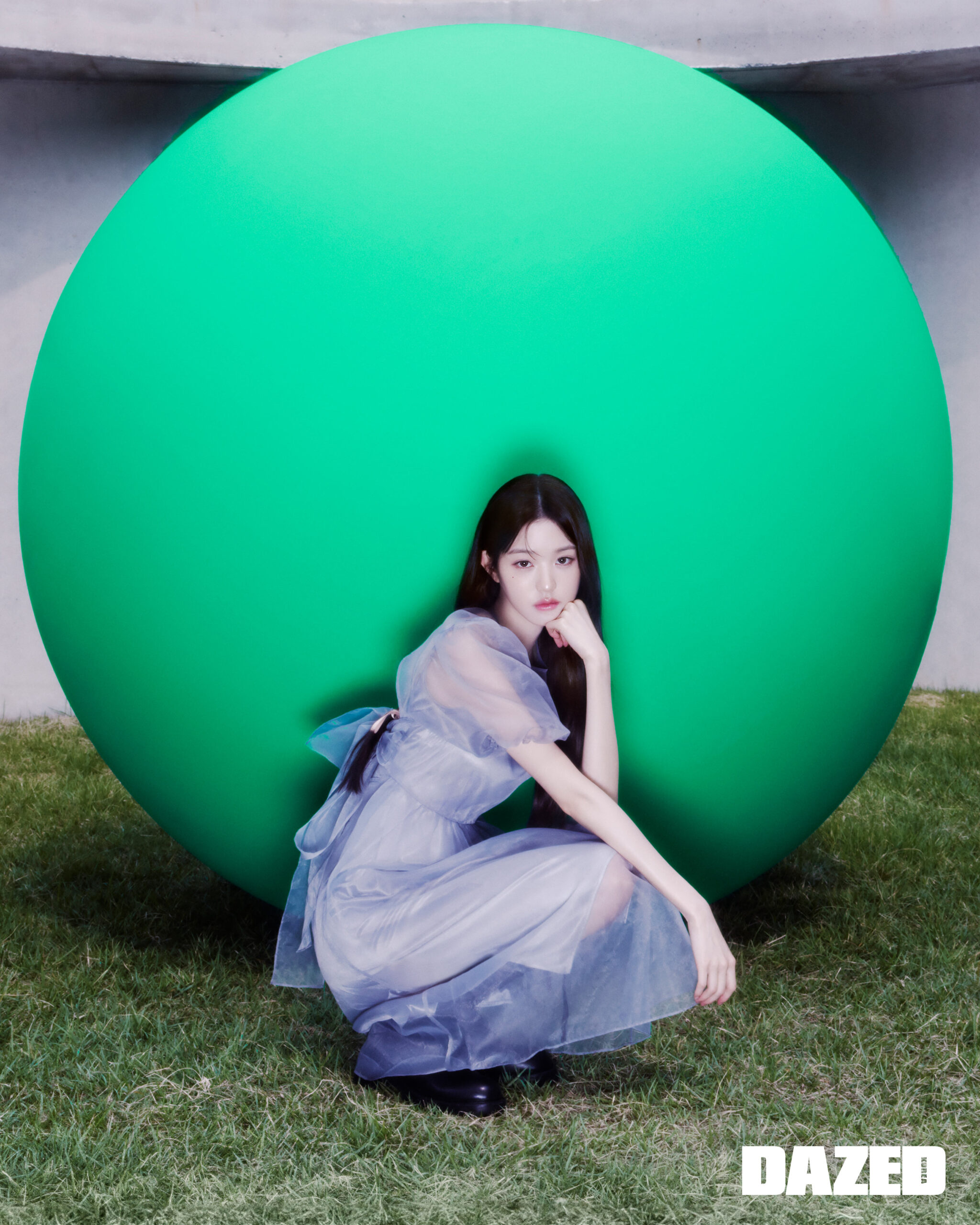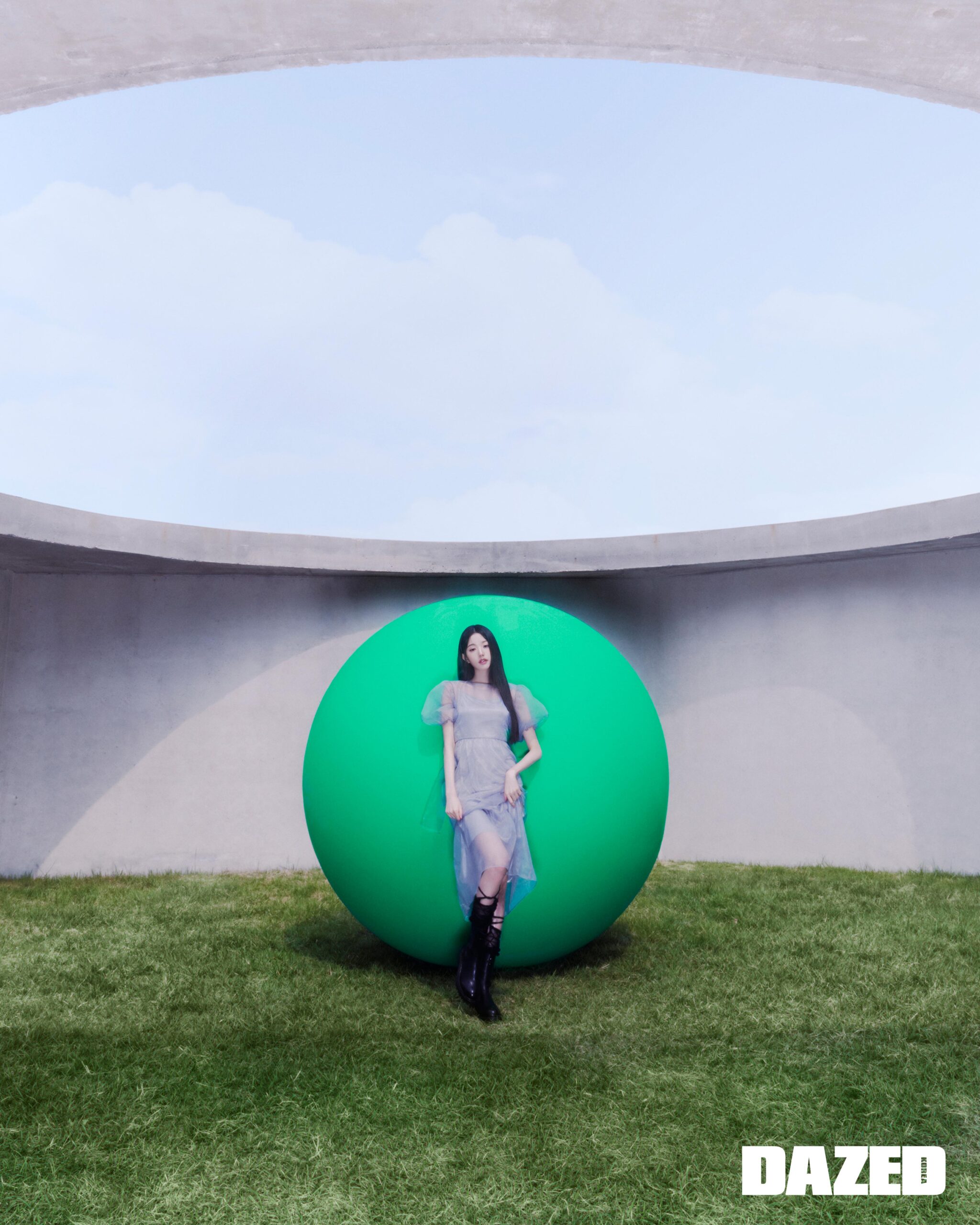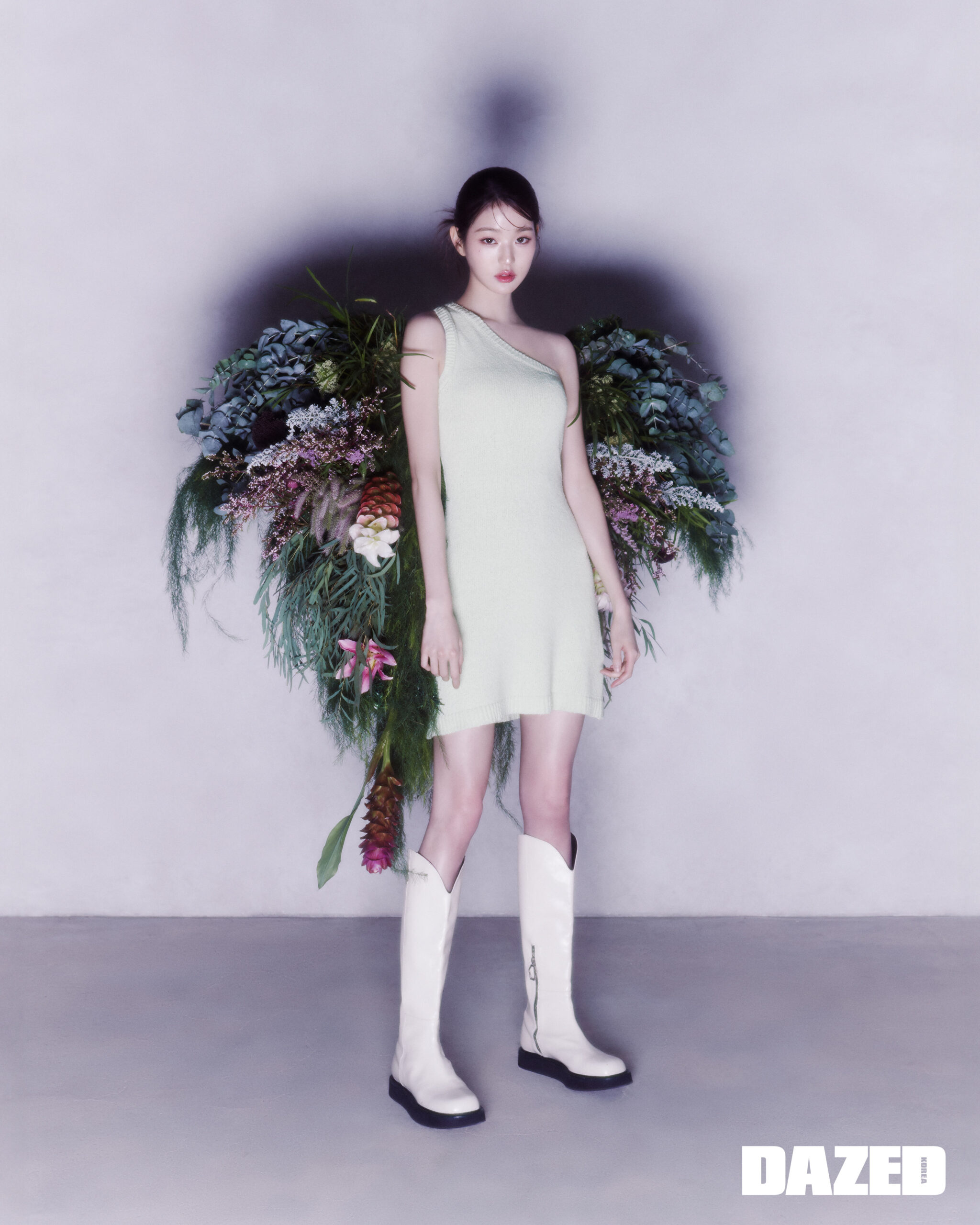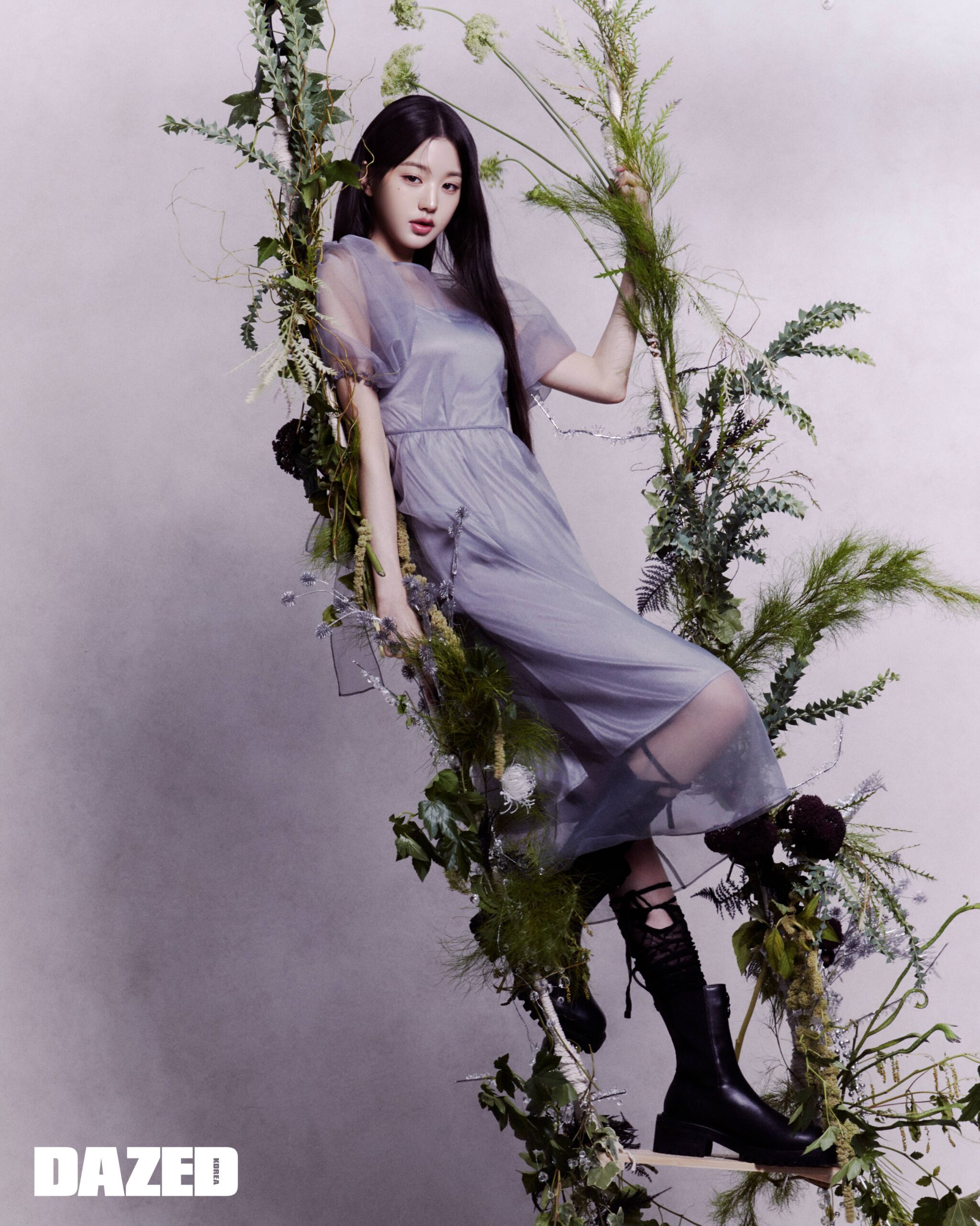 오간자 레이어드 드레스는 오버듀플레어(Overdue Flair), 첼시 부츠는 SMFK, 리본 셔링 레그 워머는 유즈(Yuse).