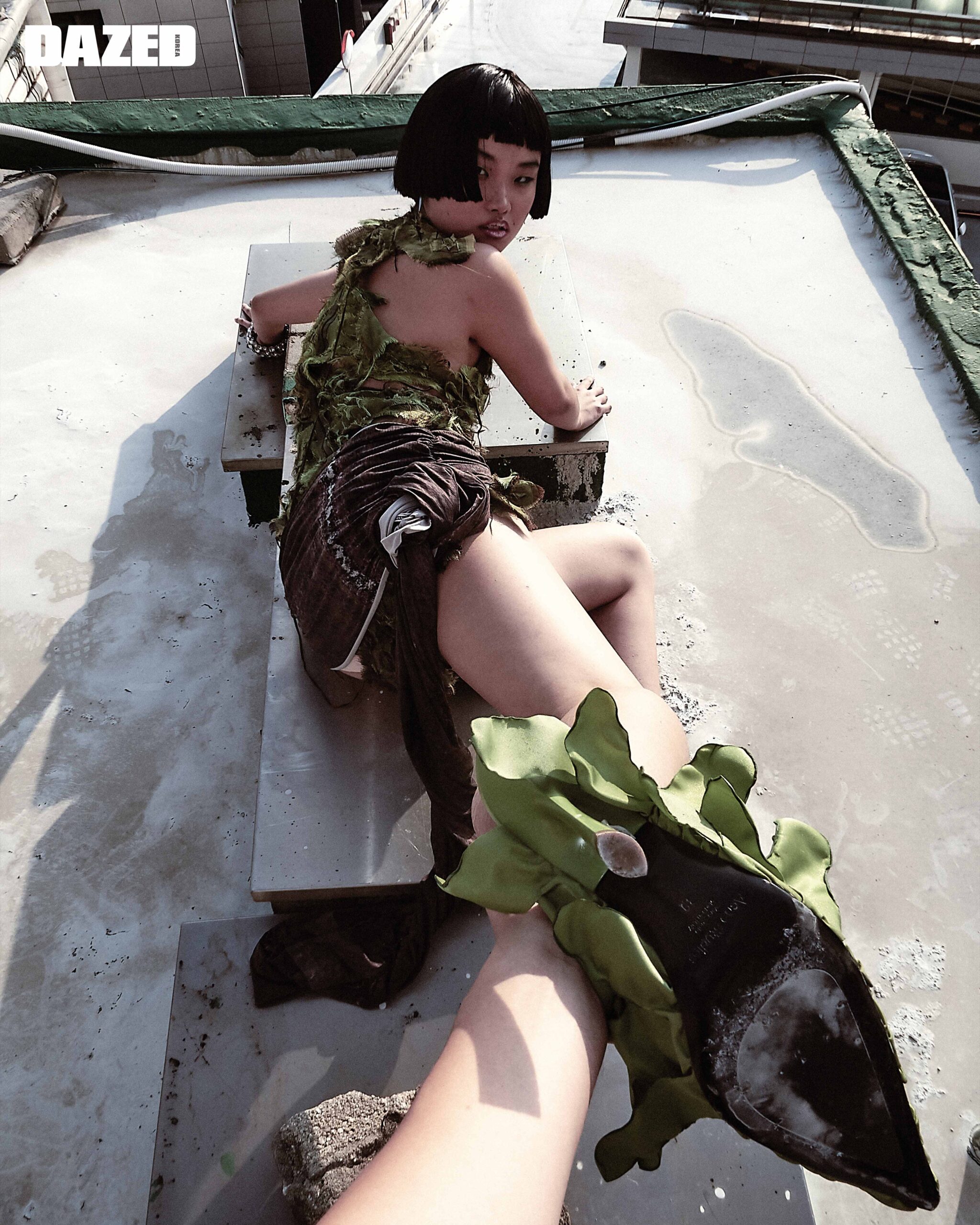 나뭇잎 모티브의 드레스와 슈즈, 이어링은 모두 아크네 스튜디오(Acne Studio),레이어링한 레깅스 팬츠는 604서비스(604service), 브레이슬릿은 에이치엔엠(H&M).