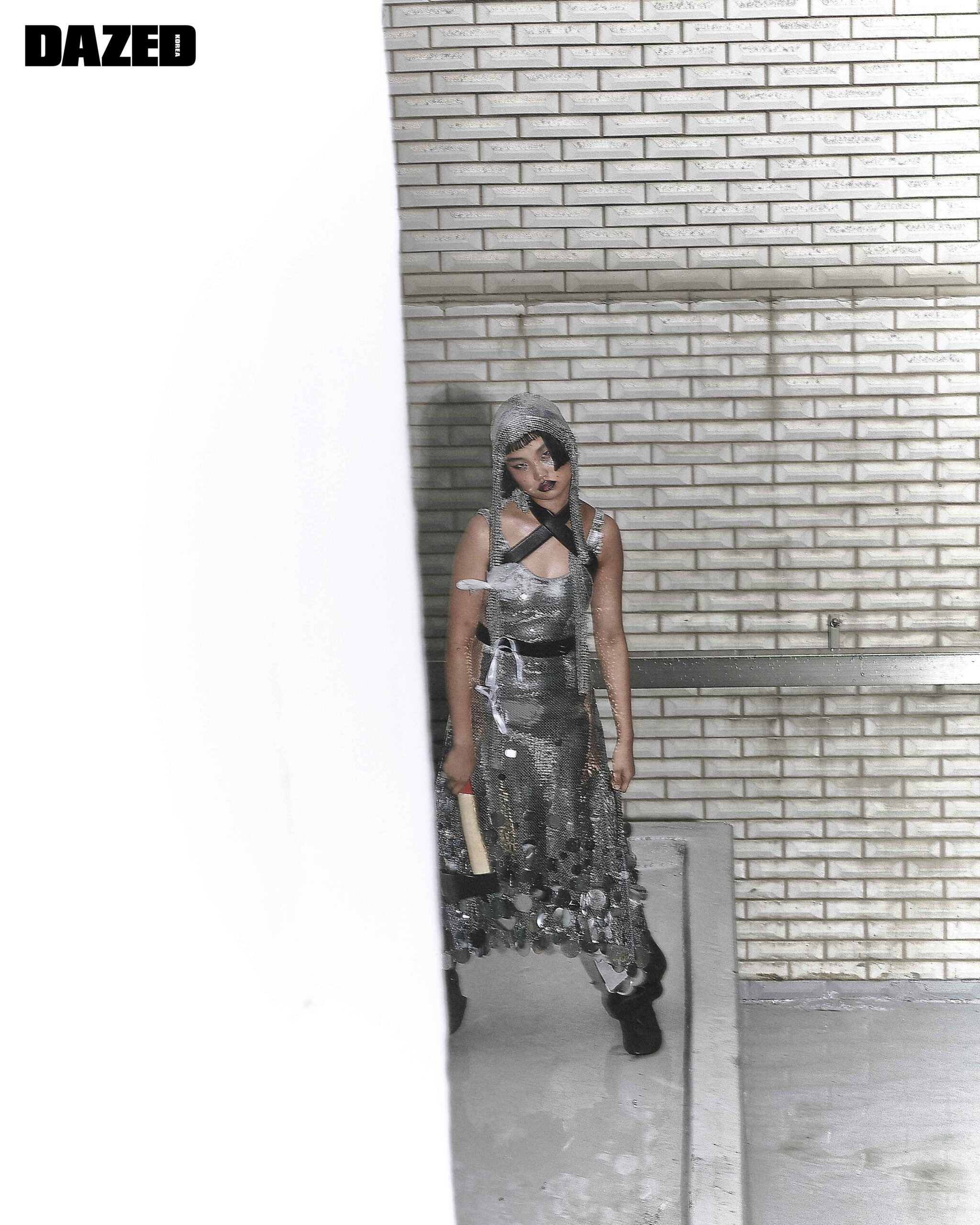 시퀸 드레스와 헤드피스는 라반 에이치엔엠(rabbane H&M), 부츠는 로에베(Loewe), 원피스 벨트는 알라이아(ALAÏA).
