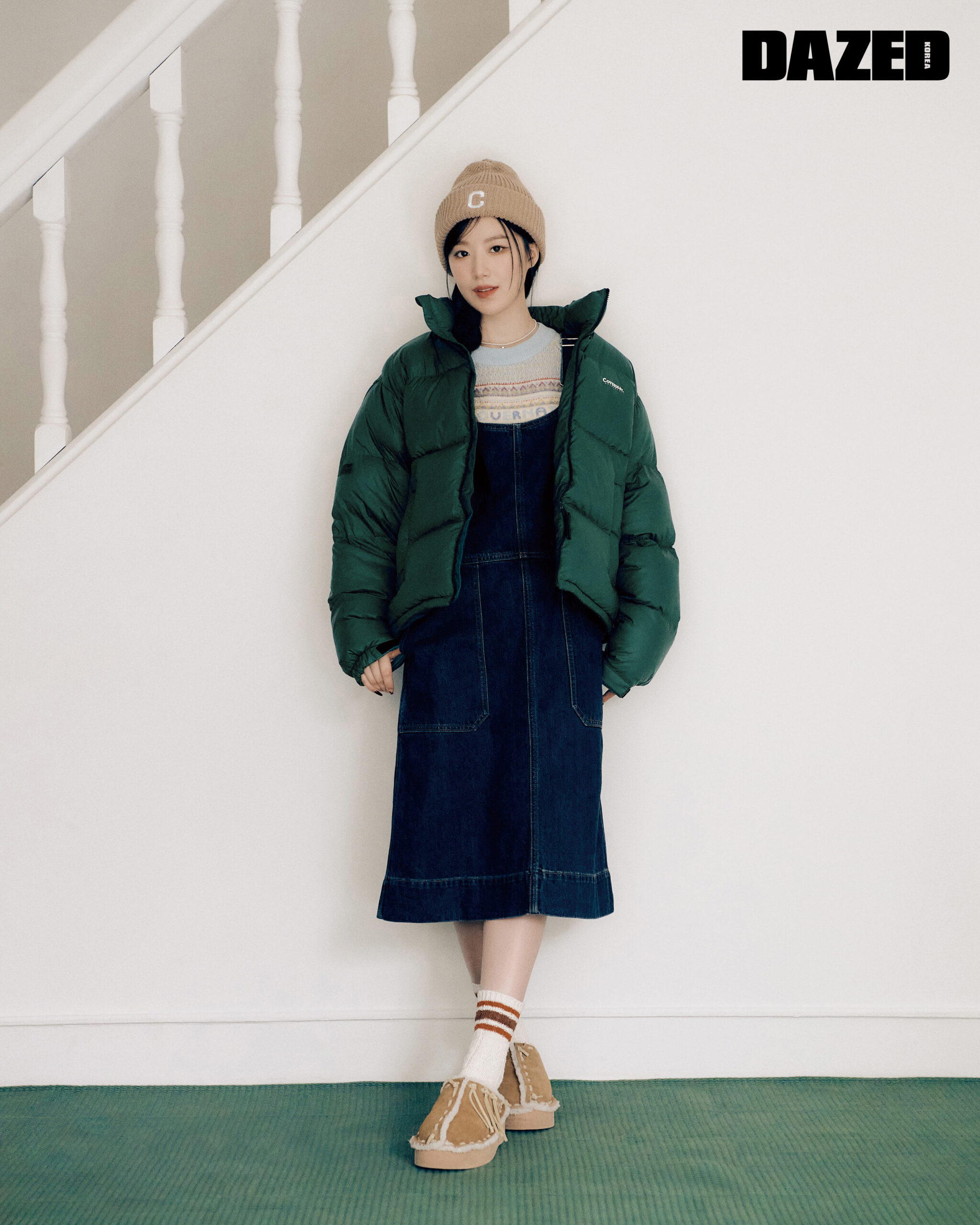 그린 덕다운 쇼트 푸퍼 재킷과 페어아일 패턴의 크루넥 니트 톱, 데님 오버올 드레스, 베이지 C 로고 비니는 모두 커버낫(Covernat), 슈즈와 네크리스, 삭스는 모두 스타일리스트의 것.