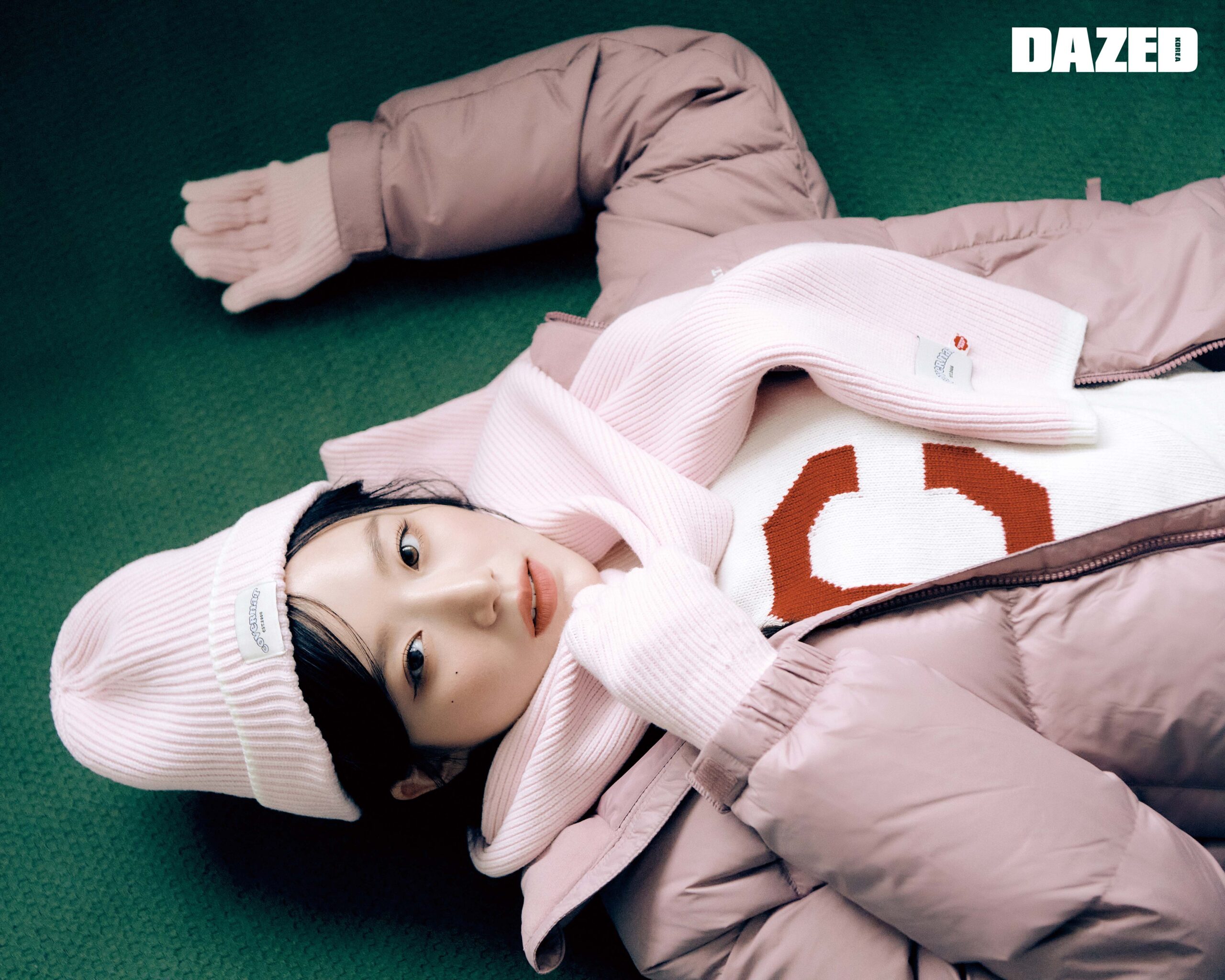 핑크 덕다운 쇼트 푸퍼 재킷과 아이보리 C 로고 크루넥 니트 톱, 핑크 클로버하트 비니, 니트 머플러, 글러브는 모두 커버낫(Covernat).