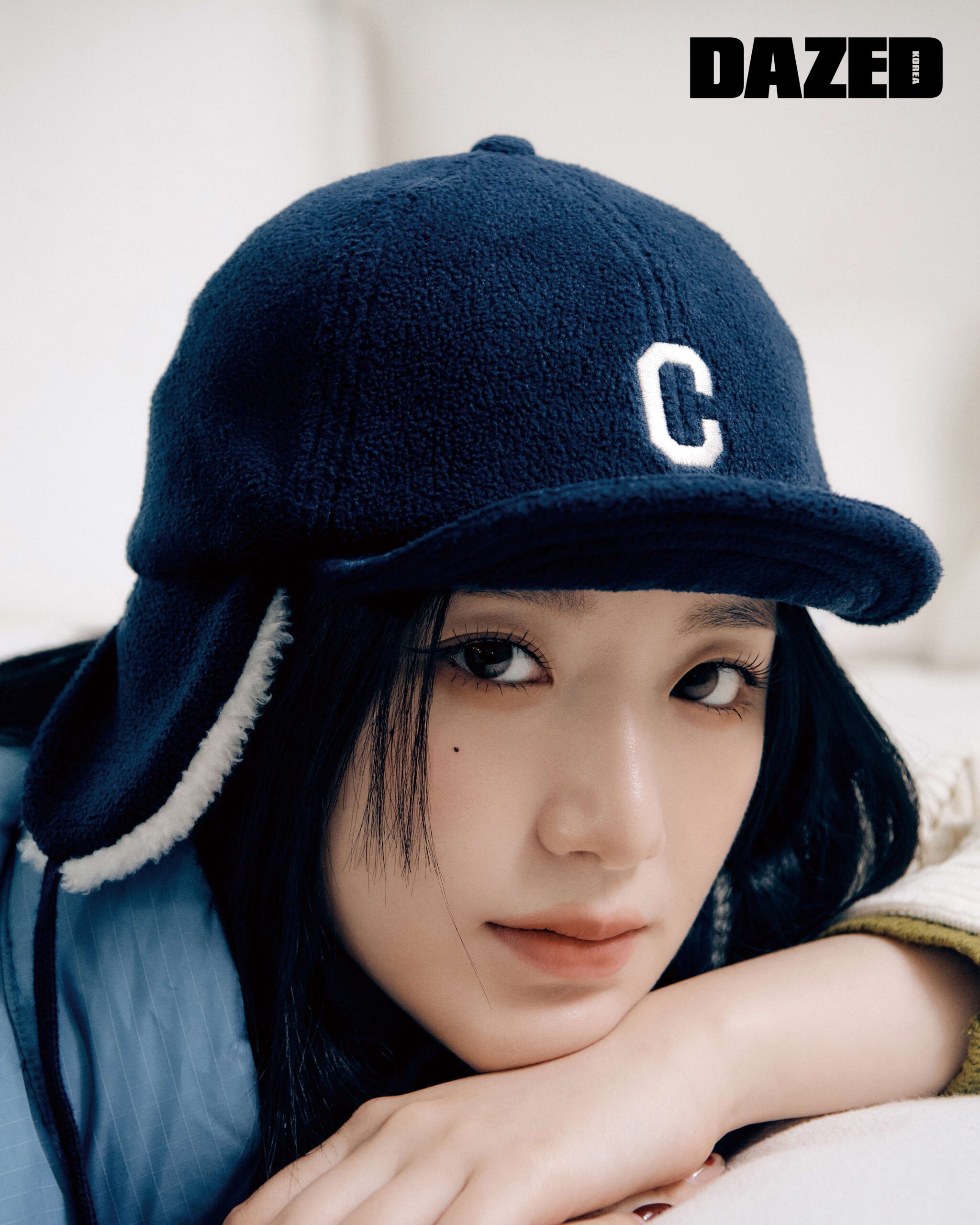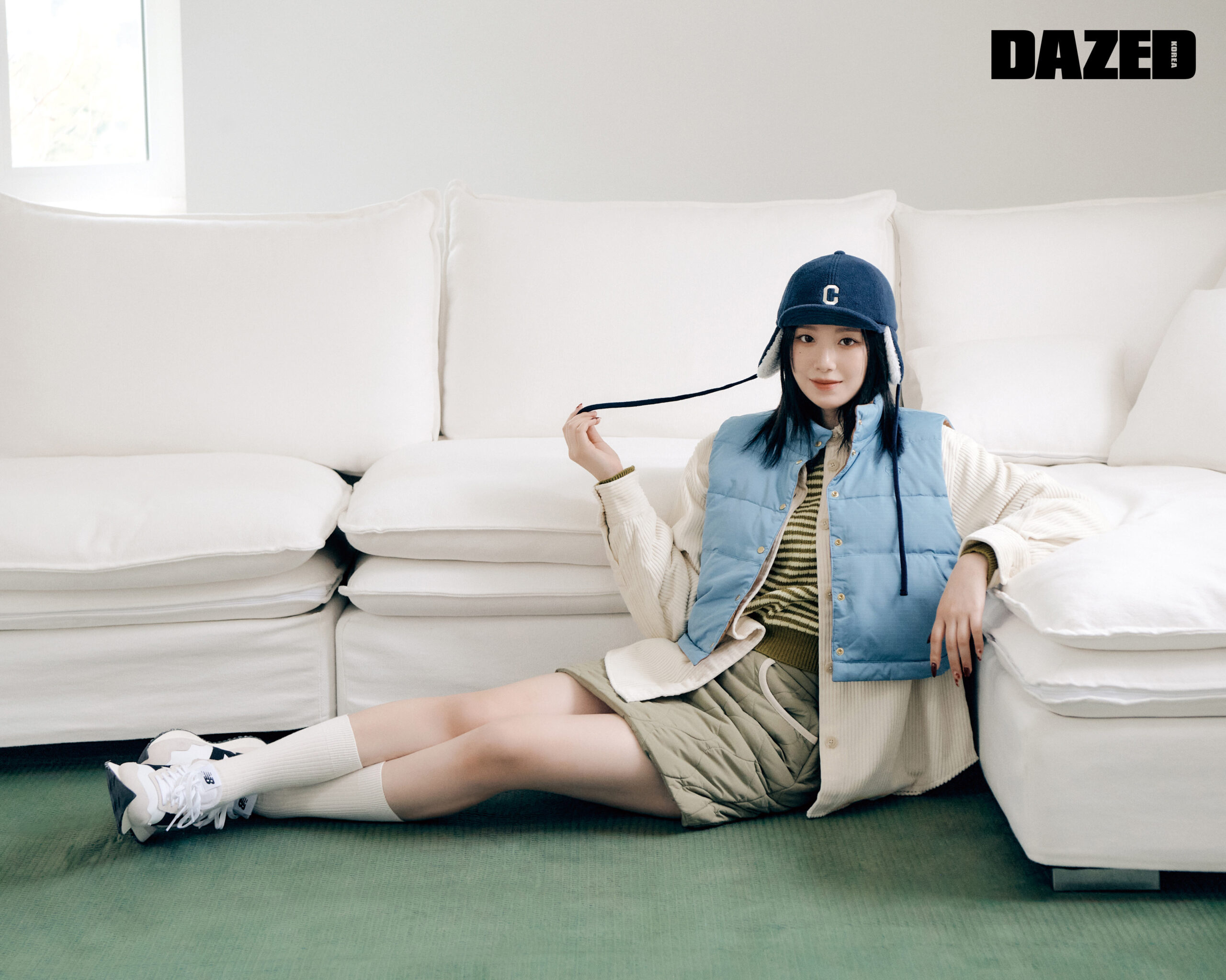 블루 다운 베스트와 아이보리 코듀로이 셔츠, 올리브 캐시미어 크롭트 니트 톱, 올리브 퀼팅 미니스커트, 네이비 C 로고 플리스 트루퍼 해트는 모두 커버낫(Covernat), 스니커즈와 삭스는 스타일리스트의 것.