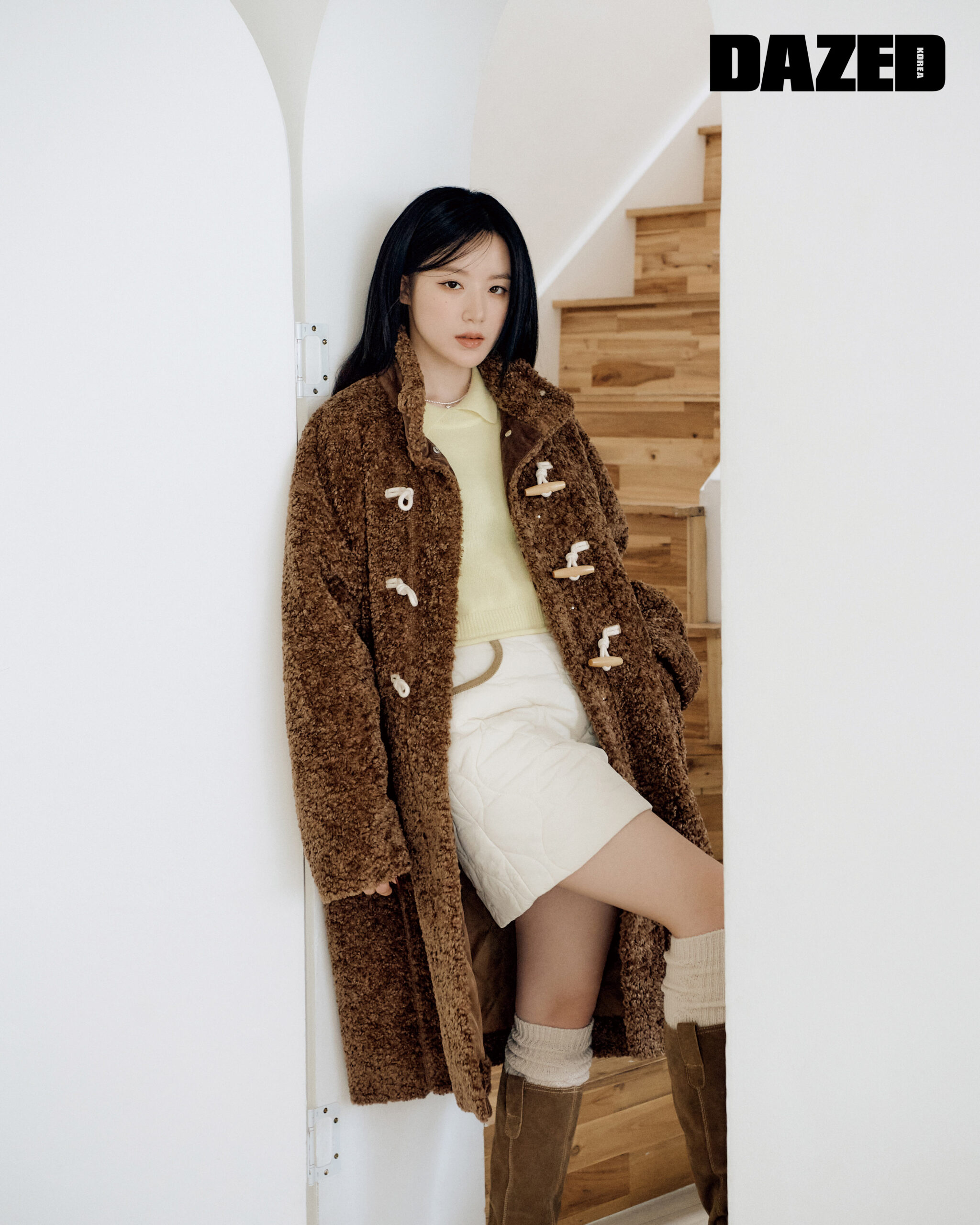 브라운 셰르파 더플코트와 옐로 앙고라 하프 니트 톱, 아이보리 퀼팅 미니스커트는 모두 커버낫(Covernat), 부츠와 네크리스, 삭스는 모두 스타일리스트의 것.