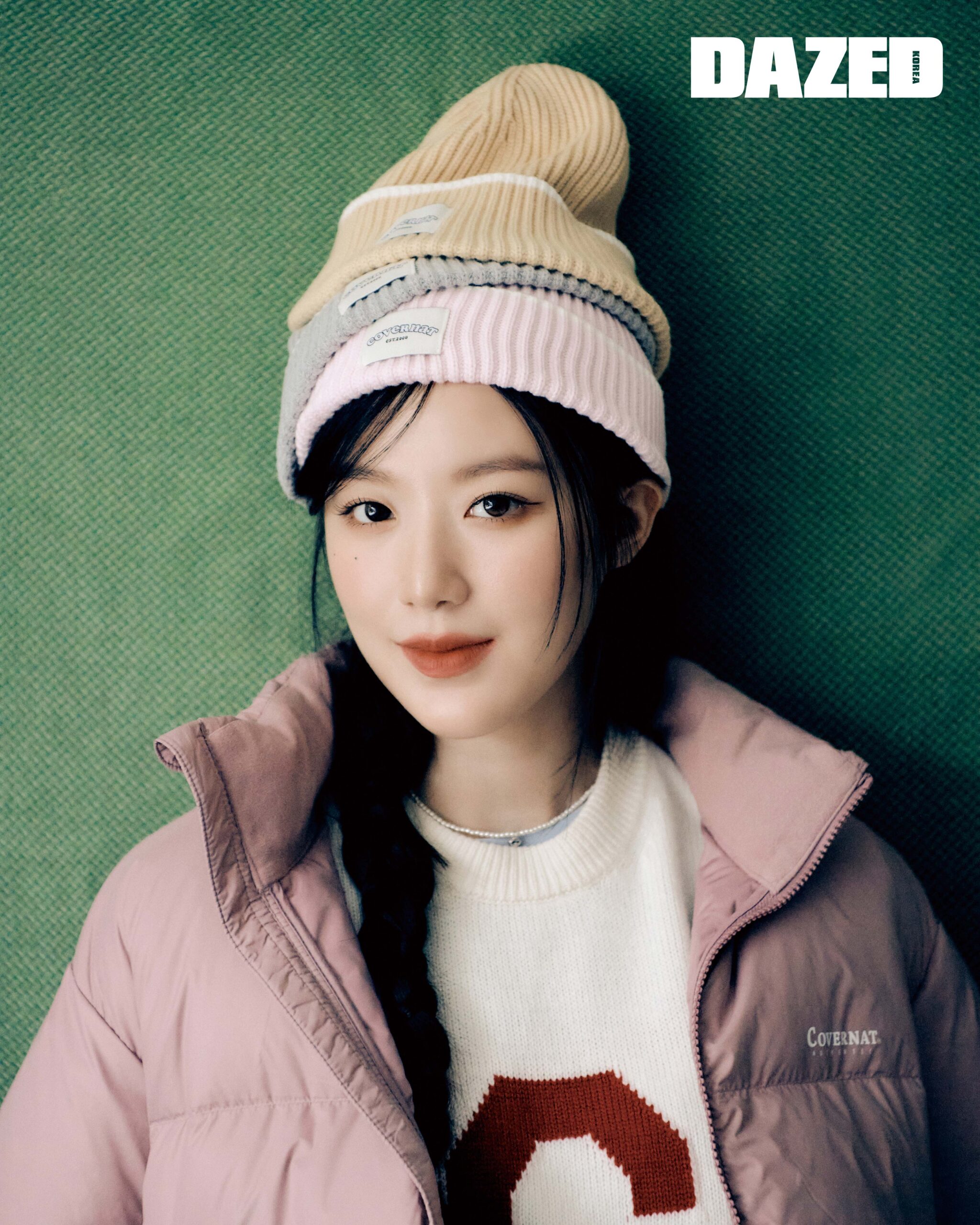 핑크 덕다운 쇼트 푸퍼 재킷과 아이보리 C 로고 크루넥 니트 톱, 레이어링한 클로버하트 비니는 모두 커버낫(Covernat), 네크리스는 스타일리스트의 것.
