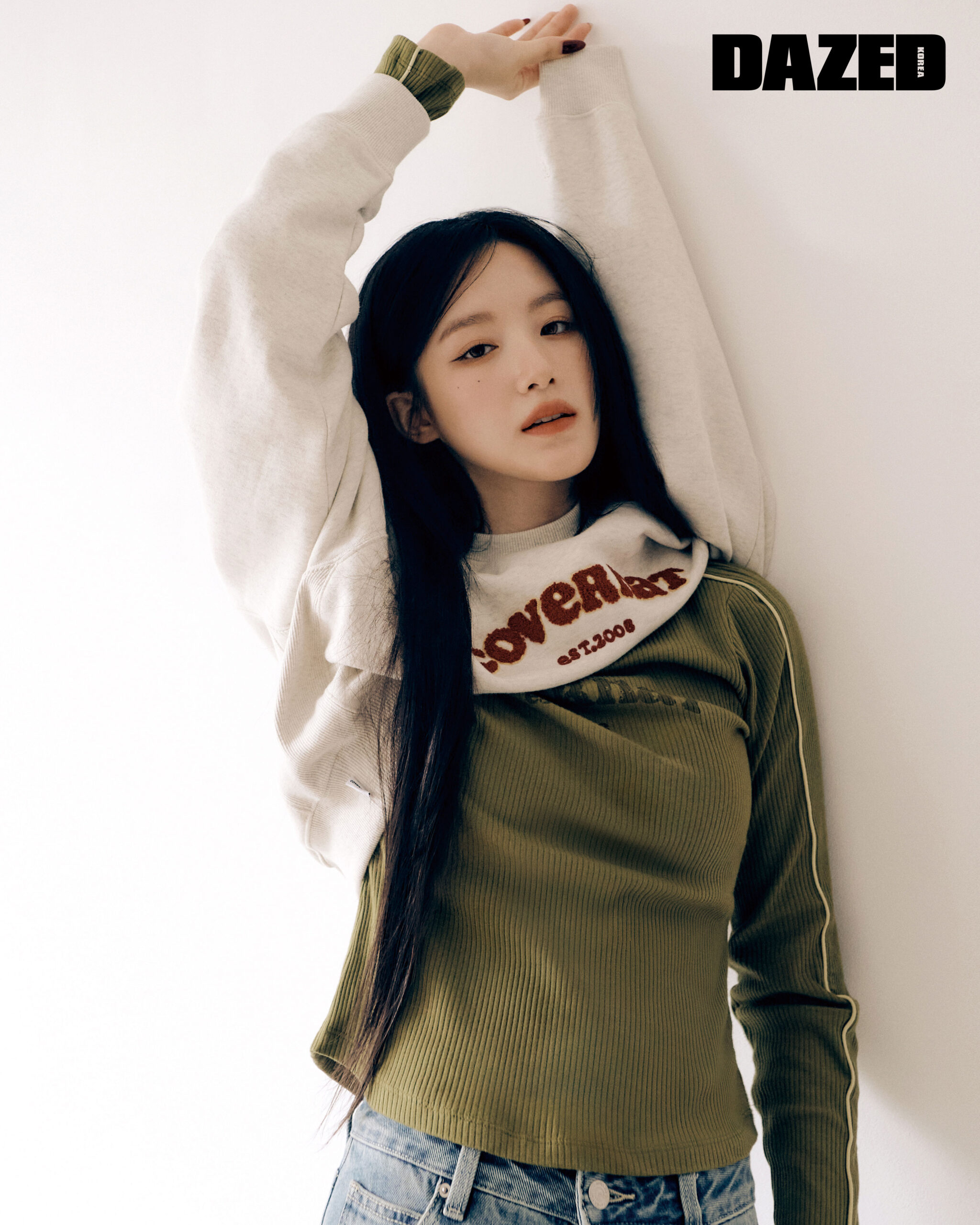 오트밀 아치 로고 맨투맨과 파이핑 배색 디테일의 올리브 롱 슬리브 톱, 데님 팬츠는 모두 커버낫(Covernat)