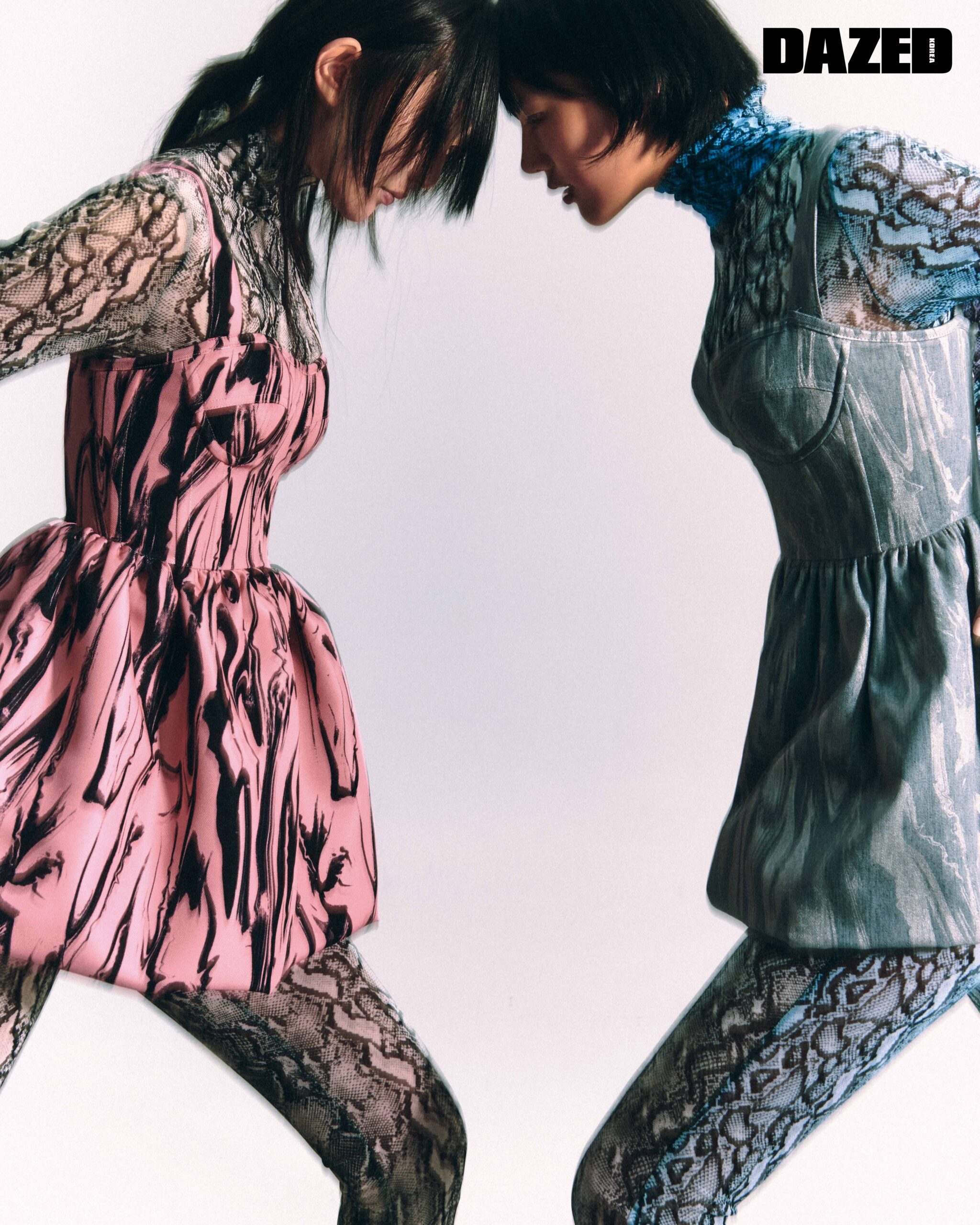 해민이 입는 핑크 드레스와 파이톤 패턴의 보디슈트는 한나신(Hannah Shin). 지원이 입은 블루 드레스와 파이톤 패턴의 보디슈트는 한나신(Hannah Shin).
