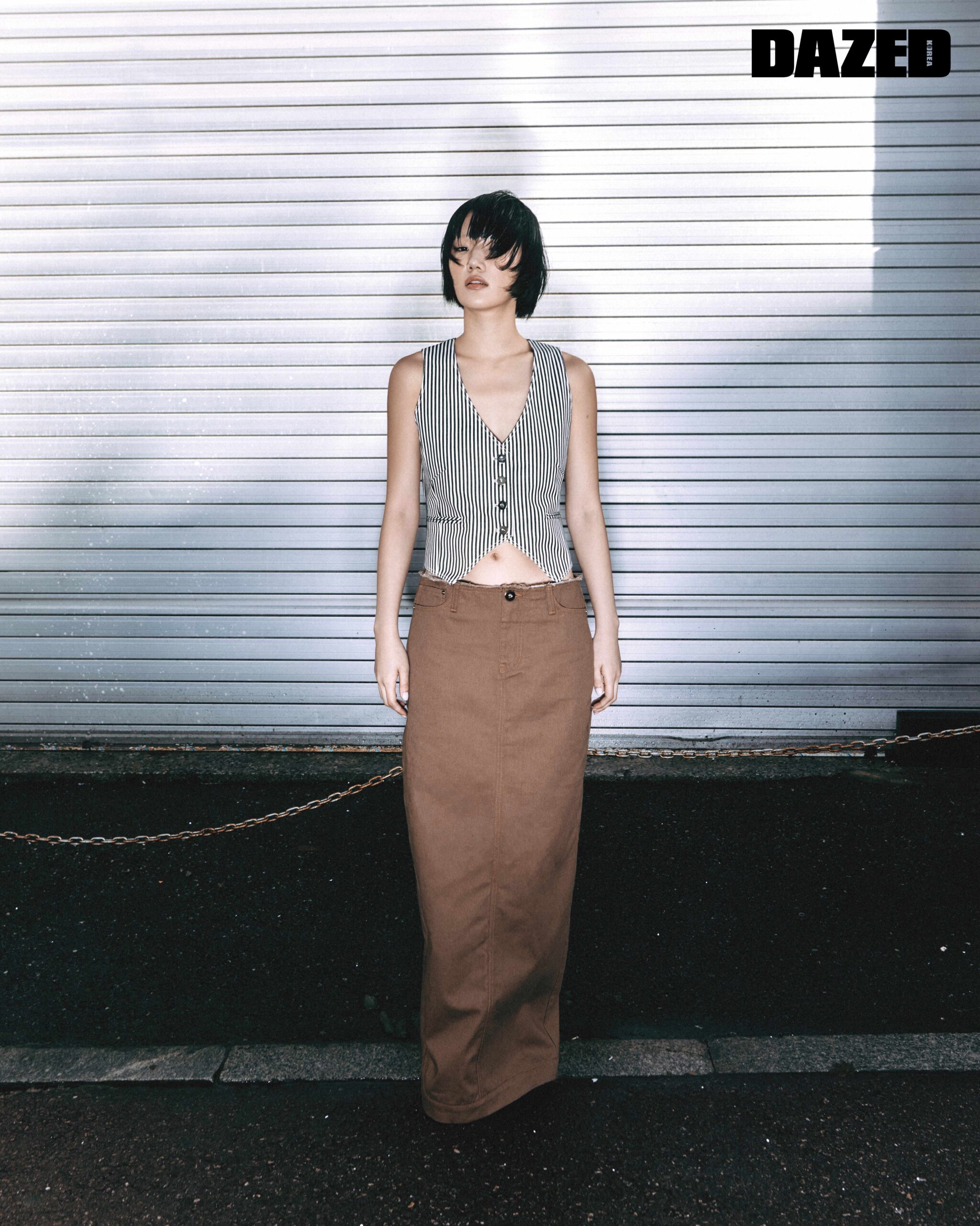 스트라이프 베스트와 브라운 롱스커트는 셀렉(Chelec).