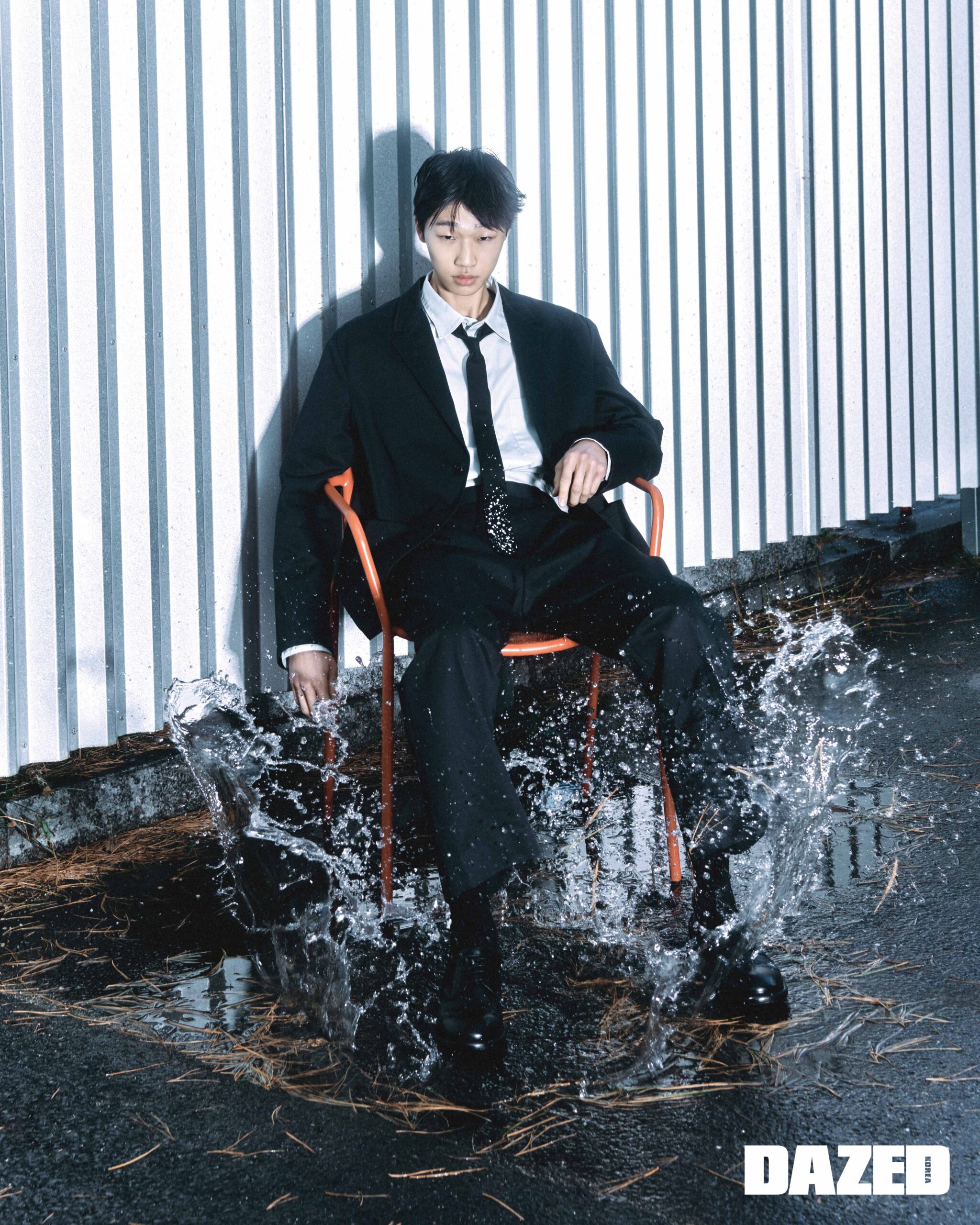 블랙 재킷과 셔츠, 팬츠, 타이는 모두 와기(WHAGI).