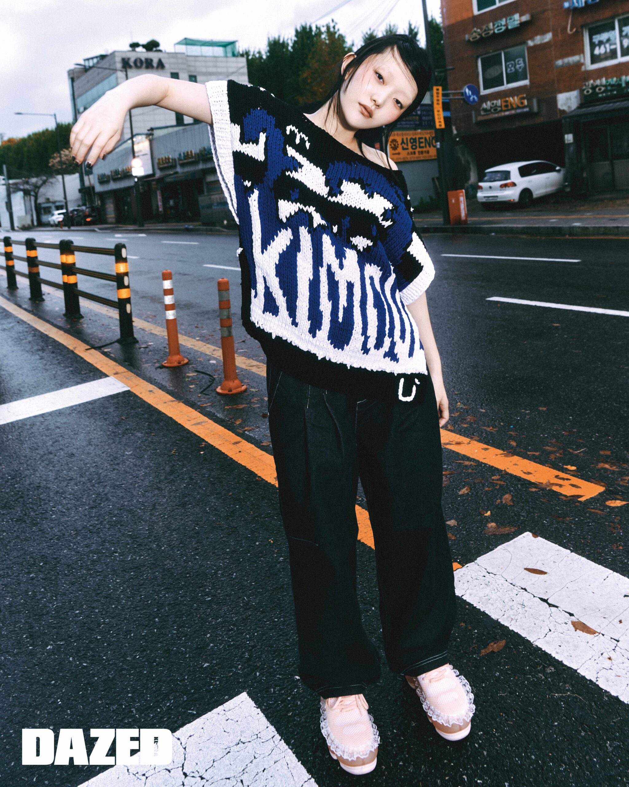 그래픽이 돋보이는 슬리브리스 니트 톱과 데님 팬츠는 키모우이(Kimoui).