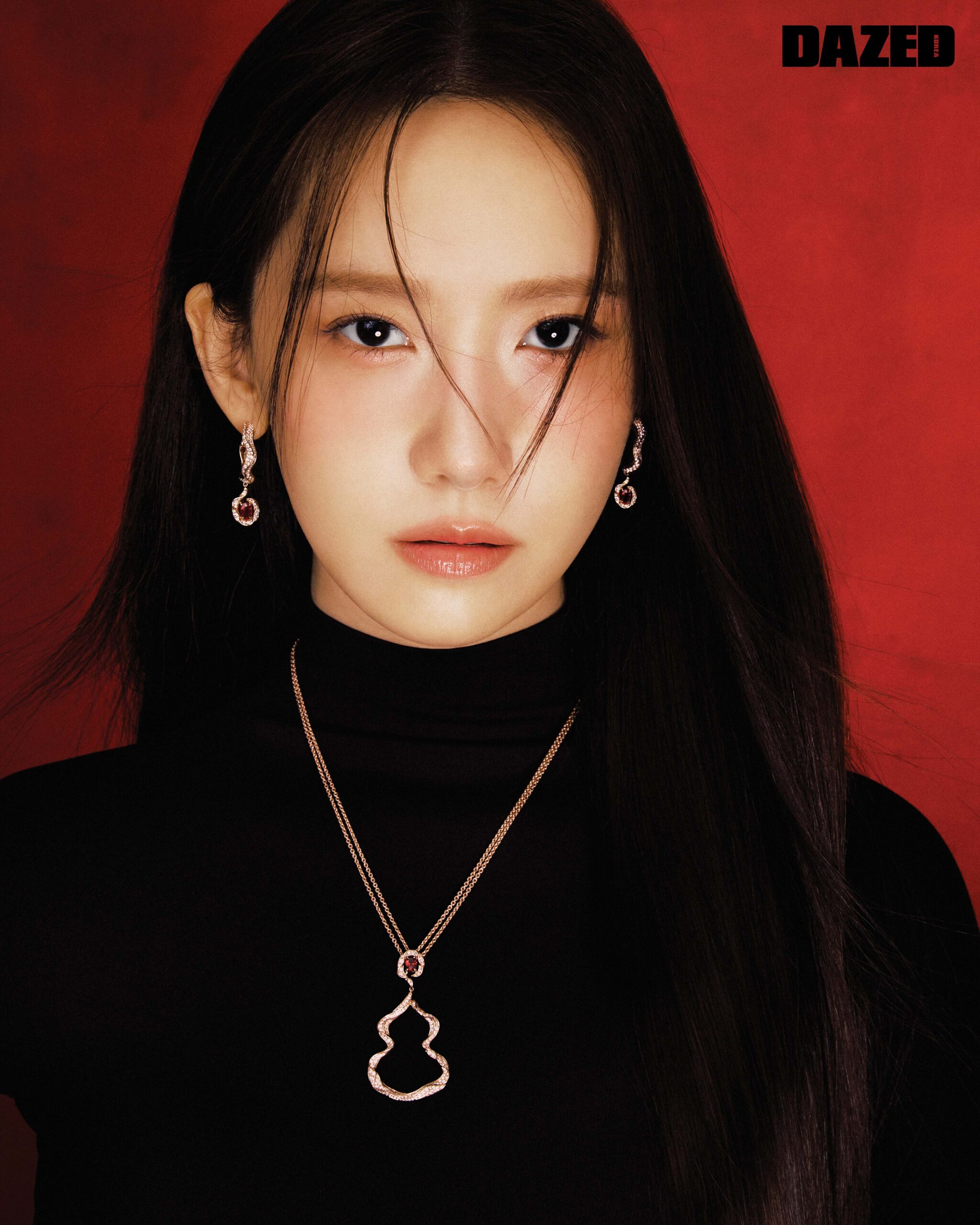 18K 로즈 골드에 181개의 다이아몬드와 0.5캐럿의 오벌 루비를 세팅한 울루 페어리 네크리스, 18K 로즈 골드에 200개의 다이아몬드와 2개의 오벌 루비를 세팅한 울루 페어리 이어링은 키린(Qeelin). 하이넥 드레스는 알라이아(ALAÏA).