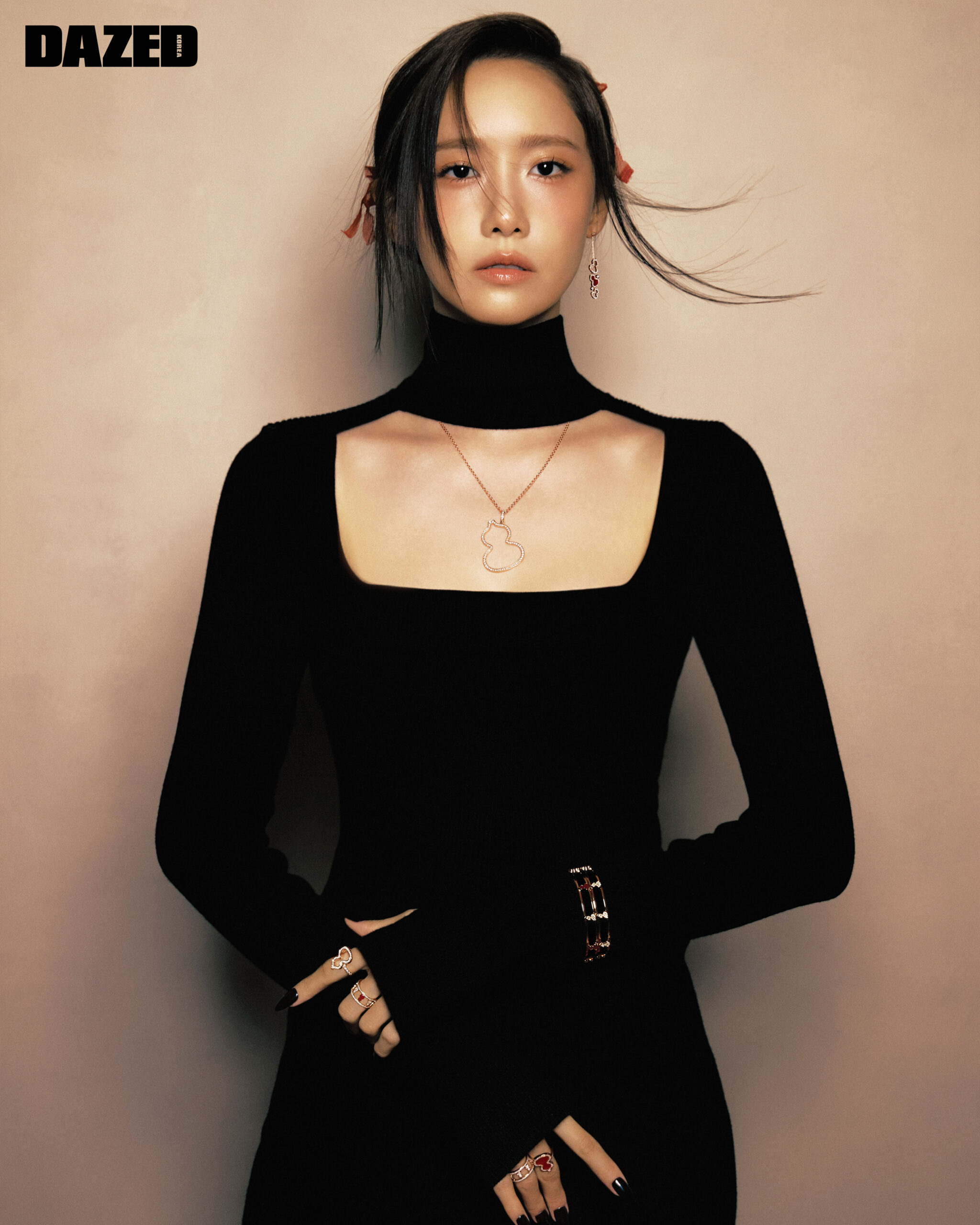 18K 로즈 골드에 다이아몬드를 더한 울루 뱅글(오른쪽), 왼손 검지에 착용한 18K 로즈 골드에 다이아몬드를 더한 스몰 울루 링과 중지에 착용한 18K 로즈 골드에 다이아몬드를 더한 하이세람의 울루 링, 오른손 중지에 착용한 18K 로즈골드에 다이아몬드를 더한 레드 아게이트 스몰 울루 솔리드 링과 약지에 착용한 18K 로즈 골드에 다이아몬드를 더한 울루 링은 모두 키린(Qeelin). 스퀘어 네크라인 하이넥 드레스는 마크 제이콥스(Marc Jacobs).