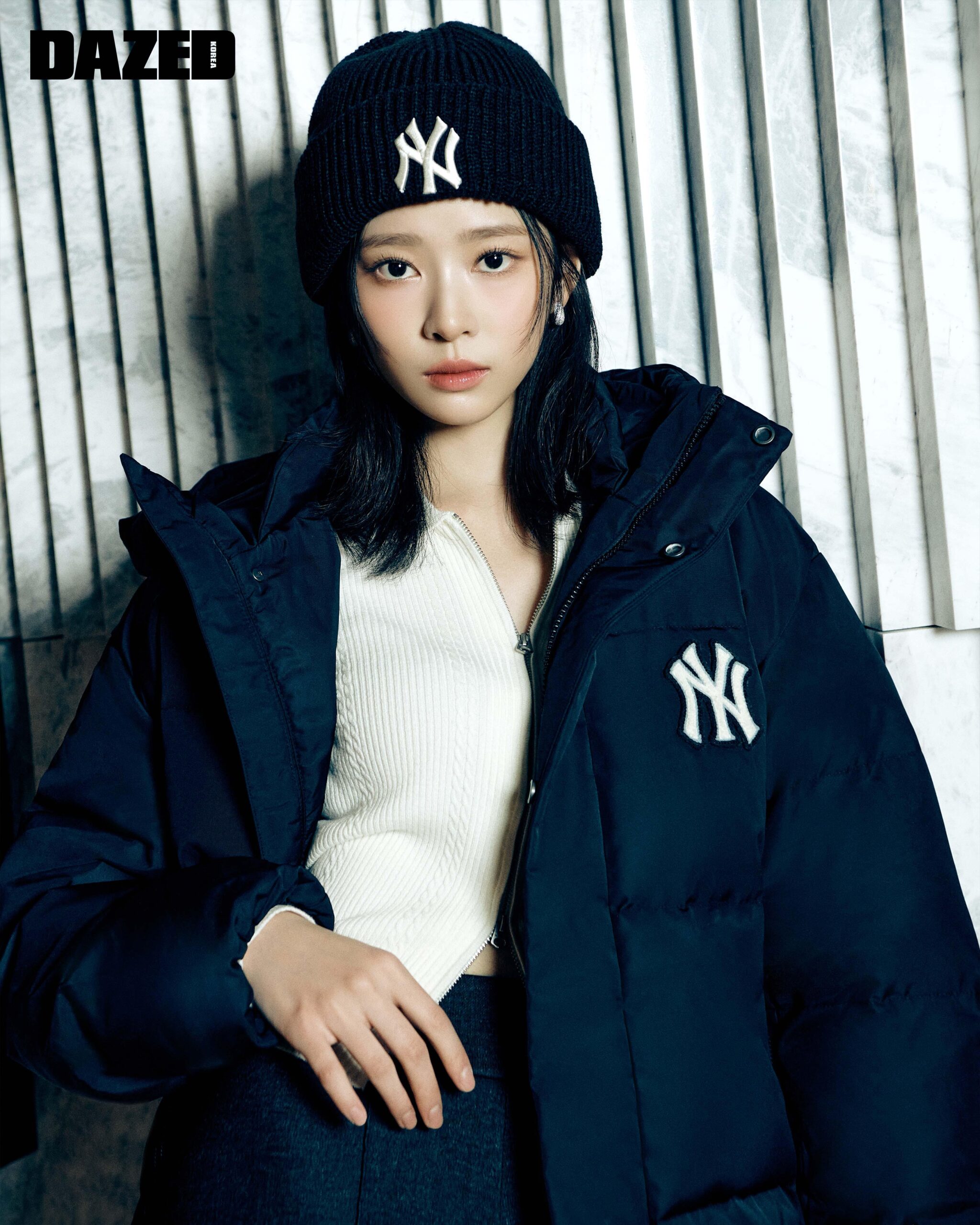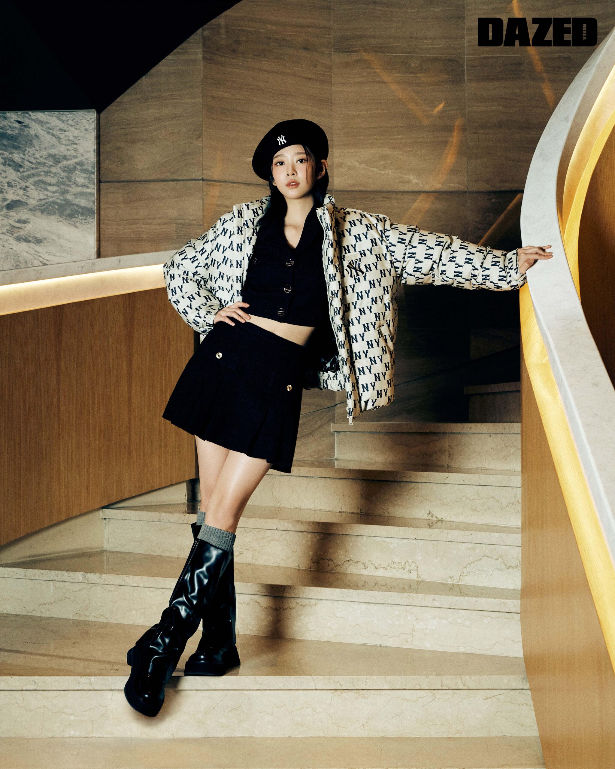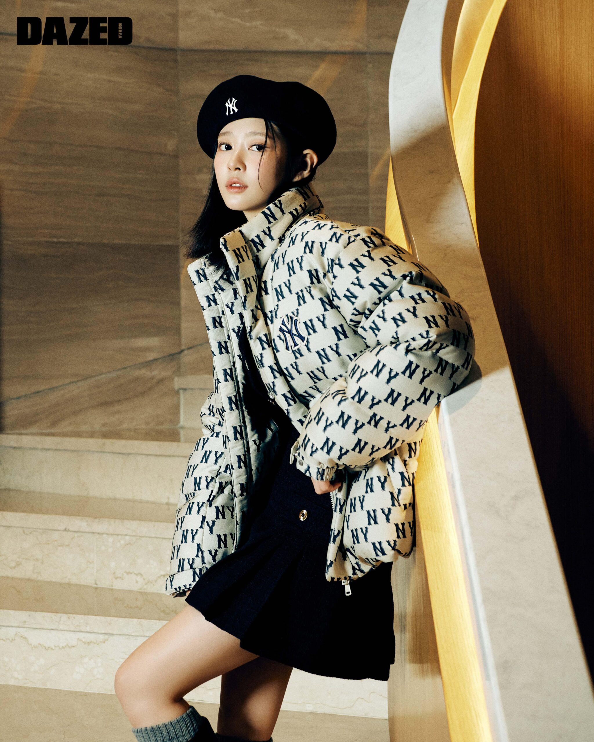 스커트 셋업과 롱부츠 룩에 과감하게 매치한 클래식 모노그램패딩 뉴욕양키스, 베이직 무봉제 베레모 모두 MLB.