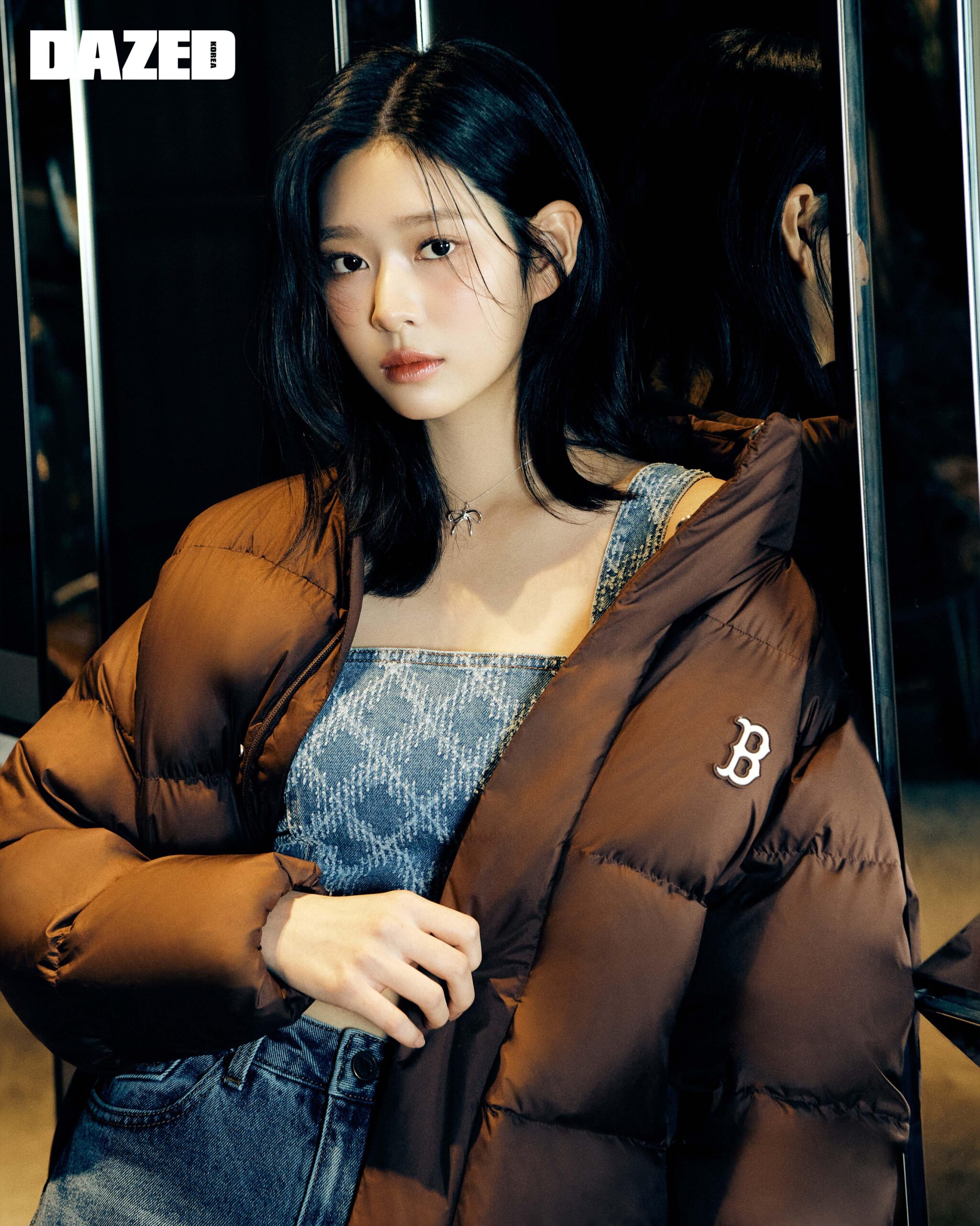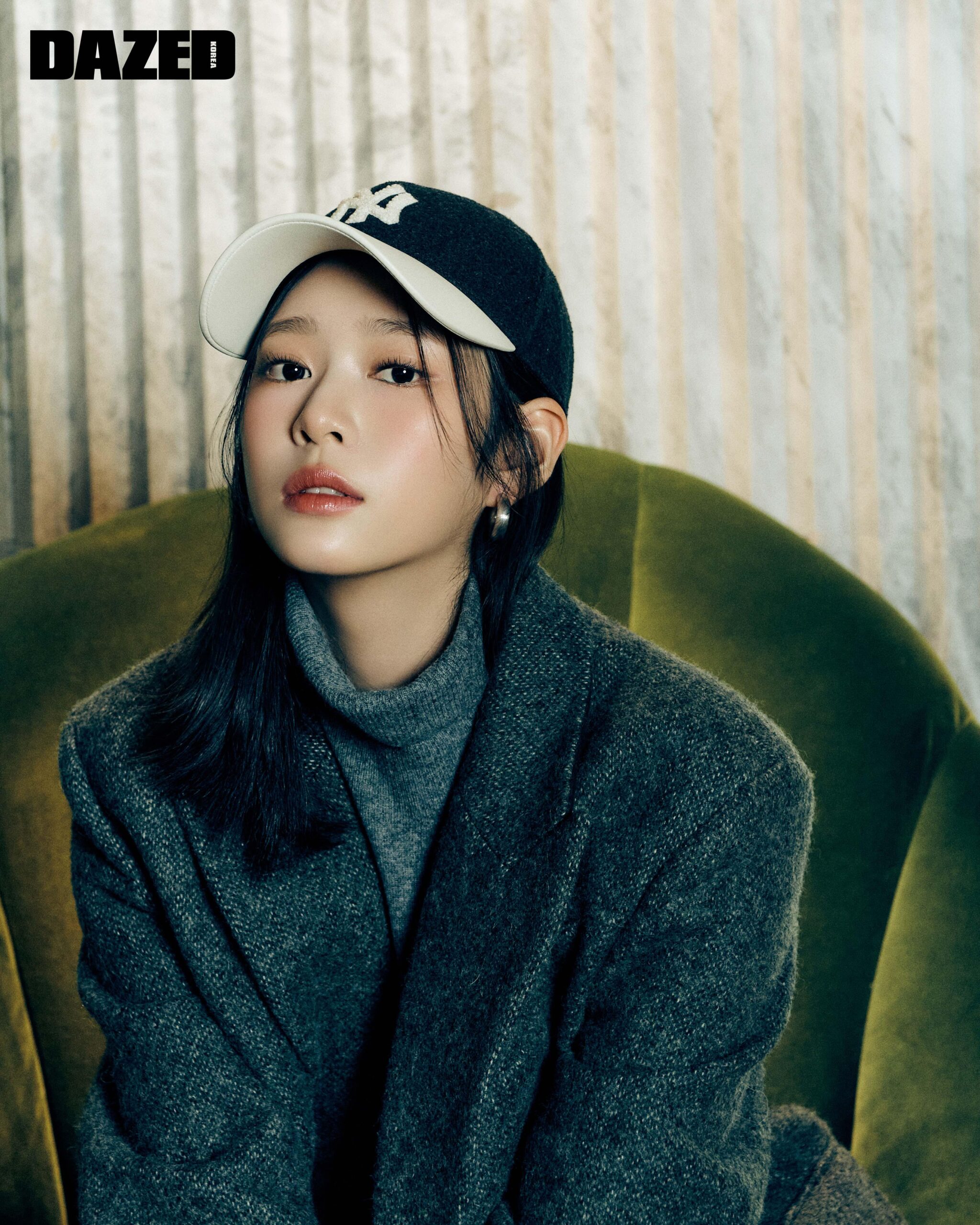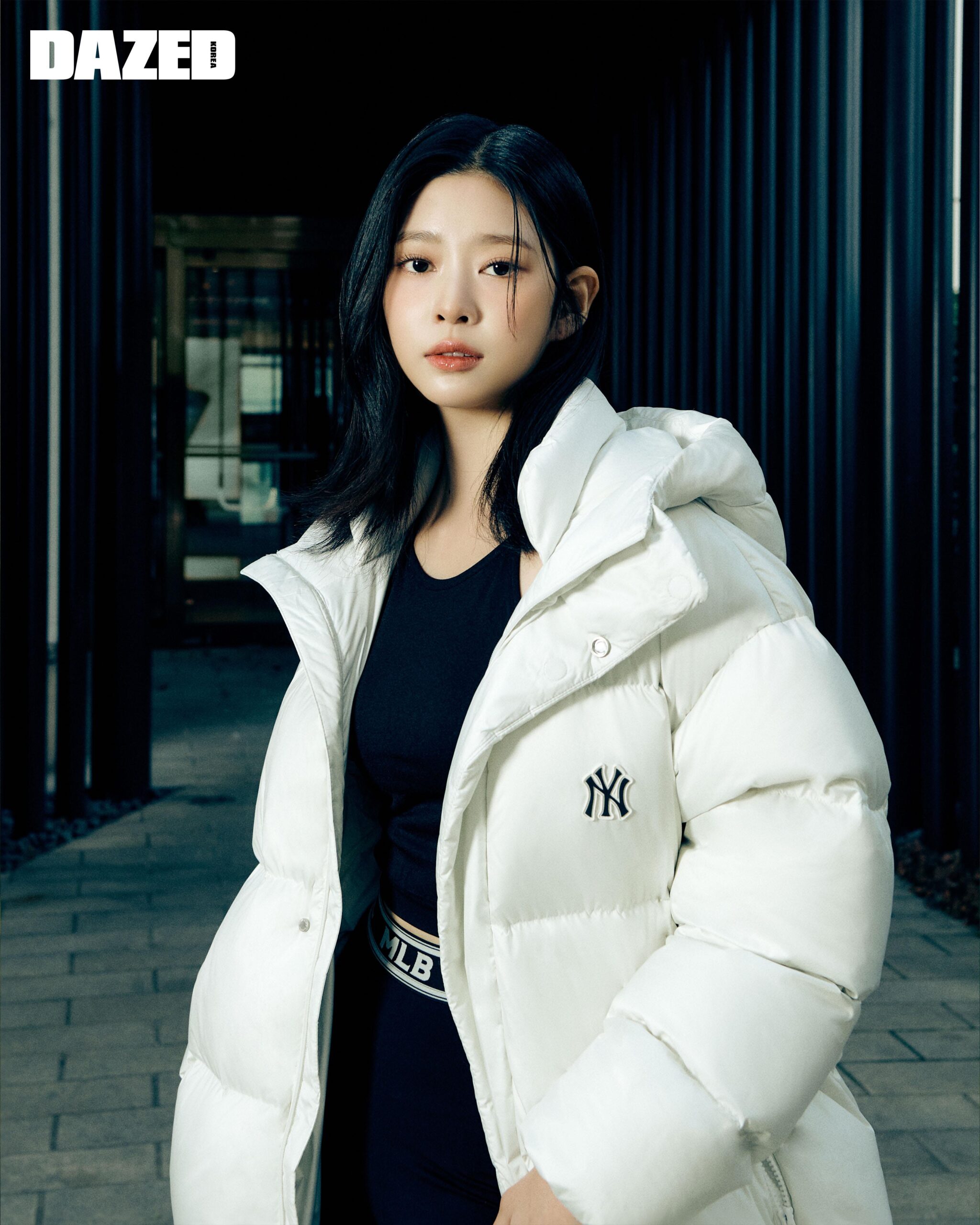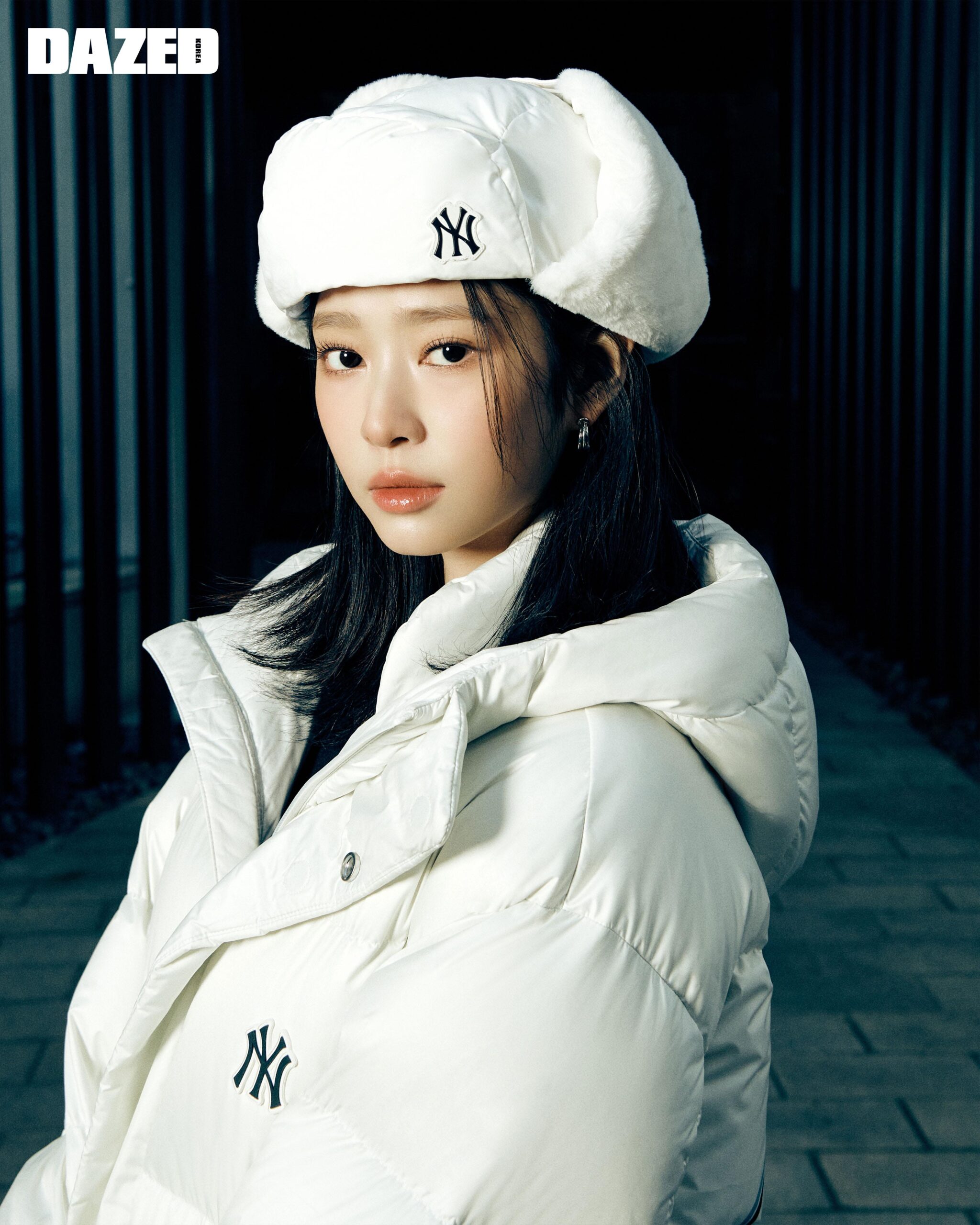 스커트 셋업과 롱부츠 룩에 과감하게 매치한 클래식 모노그램패딩 뉴욕양키스, 베이직 무봉제 베레모 모두 MLB.