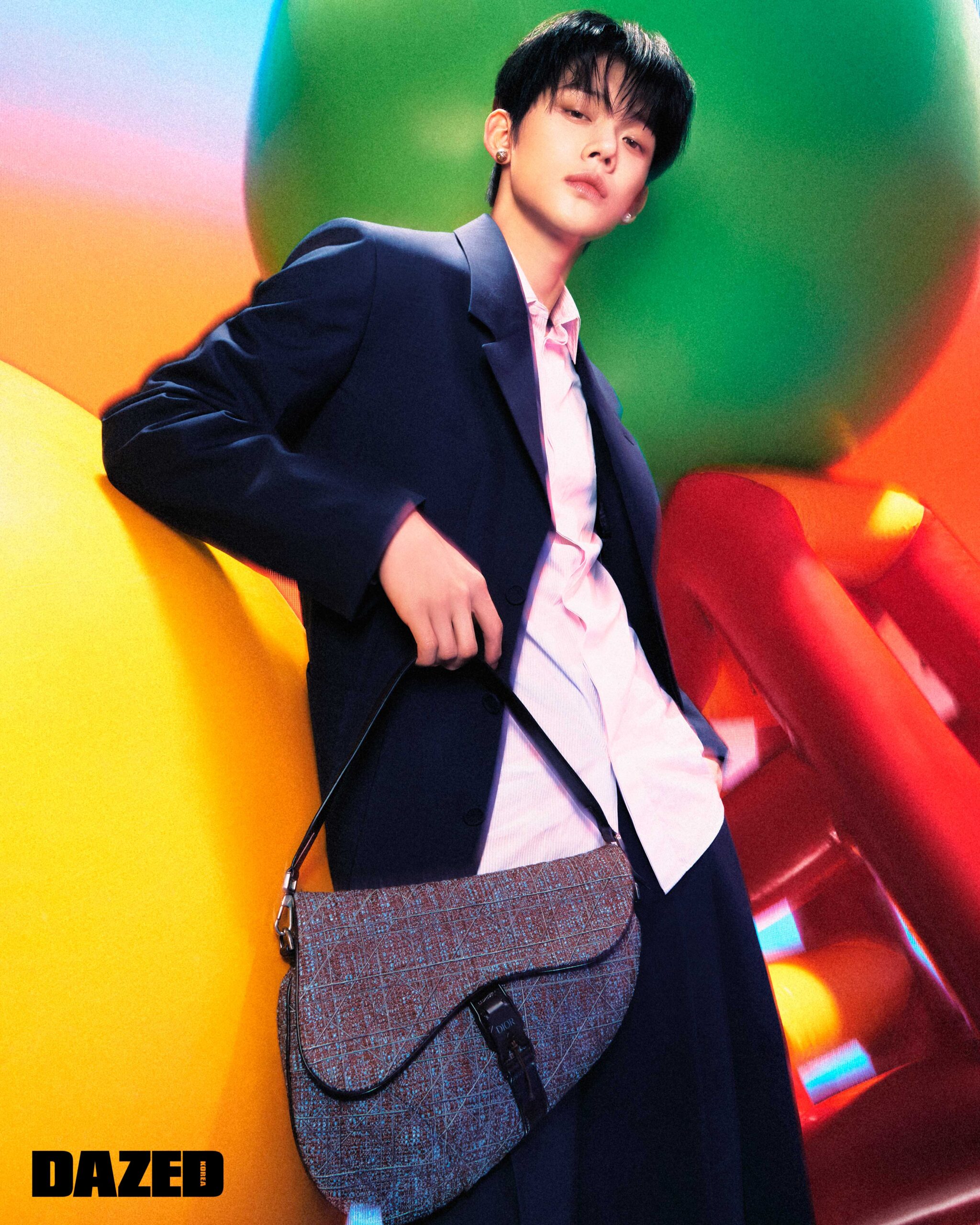 노치트라펠이 돋보이는 프렌치 심 기법의 네이비 드라이 버진 울 캔버스 노티드 재킷과 CHRISTIAN DIOR COUTURE 프린트와 패브릭 레이어링 칼라 & 커프스가 돋보이는 핑크 스트라이프 코튼 포플린 셔츠, 네이비 울 & 모헤어 트윌 라지 에시메트릭 플리티드 팬츠, 실버 피니시 브라스 기법의 프레시 워터 펄 & 마블 스톤 위프트 까나쥬 디올 트라이벌 에시메트릭 이어링, 브라운 트위드 까나쥬 새들 트윈 백은 모두 디올 맨(Dior Men).
