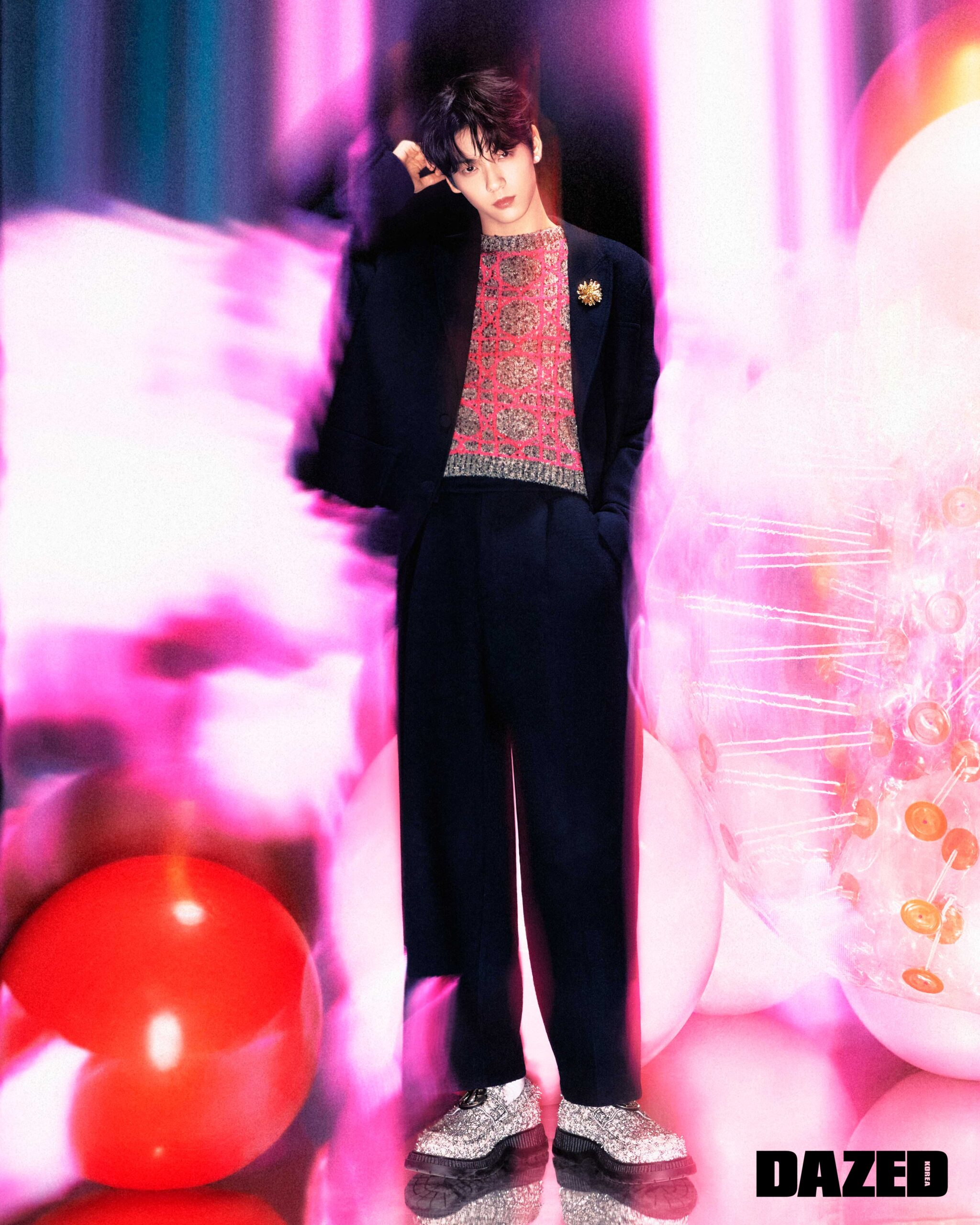 피크트라펠과 패치 포켓이 돋보이는 네이비 컬리 블렌디드 버진 울 크로스 재킷과 핑크 콘트라스티드 까나쥬 자카르 소재의 라이트 그레이 & 메탈릭 스레드 캐시미어 크루넥 톱, 패스 포켓이 돋보이는 네이비 컬러 블렌디드 버진 울 크로스 라지 팬츠, 그레이 레오퍼드 소재와 루테늄 디올 참 버클이 돋보이는 버펄로 로퍼, 실버 피니시 브라스 기법의 프레시 워터 펄 & 마블 스톤 위프트 까나쥬 디올 트라이벌 에시메트릭 이어링, 골드 피니시 브라스 기법의 브라운 크리스털 랩트 까나쥬 플라워 브로치, CHRISTIAN DIOR COUTURE 엠브로이더리 화이트 코튼 포멀 롱 삭스는 모두 디올 맨(Dior Men).