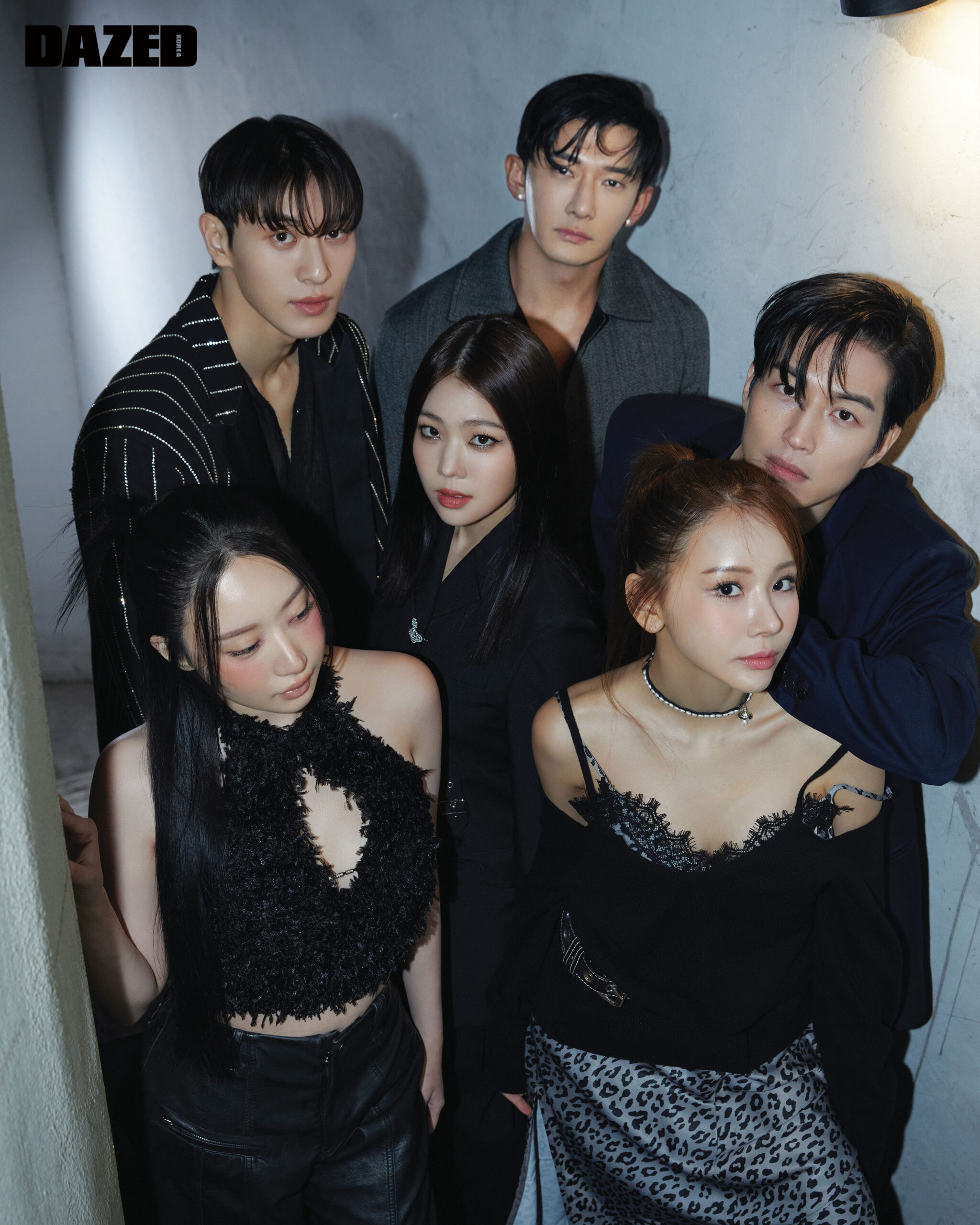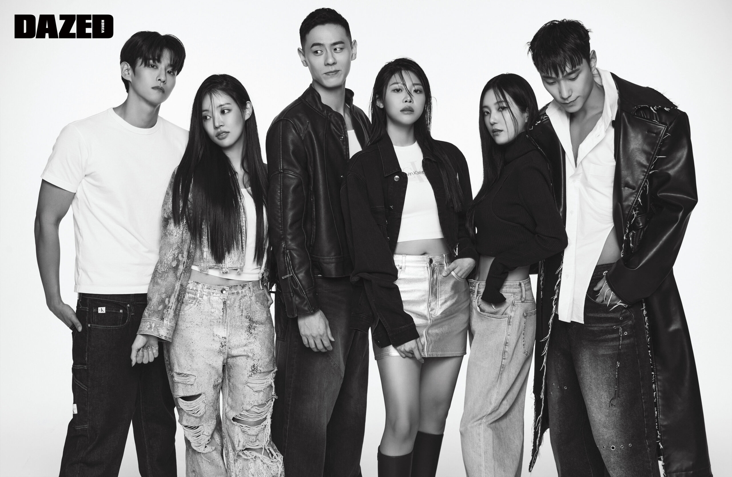 민우가 입은 시스루 셔츠는 쿠메(Kume), 재킷은 에디터의 것. 진석이 입은 그레이 싱글 맥코트는 페라가모(Ferragamo), 이어링은 에디터의 것. 민지가 입은 버클 디테일 블랙 재킷은 비뮈에트(Bmuet(te)), 브로치로 연출한 헤어핀은 비비안 웨스트우드(Vivienne Westwood). 하빈이 입은 네이비 재킷은 지민리(Jiminlee). 민영이 입은 퍼 디테일의 홀터넥 톱은 기묘(Kimyo), 레더 팬츠는 나체(Nache). 규리가 입은 컷아웃 니트 톱은 드리스 반 노튼 by 육스(Dries Van Noten by YOOX), 레오퍼드 디테일의 슬리브리스 드레스는 쿠메(Kume), 펄 장식 초커는 비비안 웨스트우드(Vivienne Westwood), 벨트는 에디터의 것.