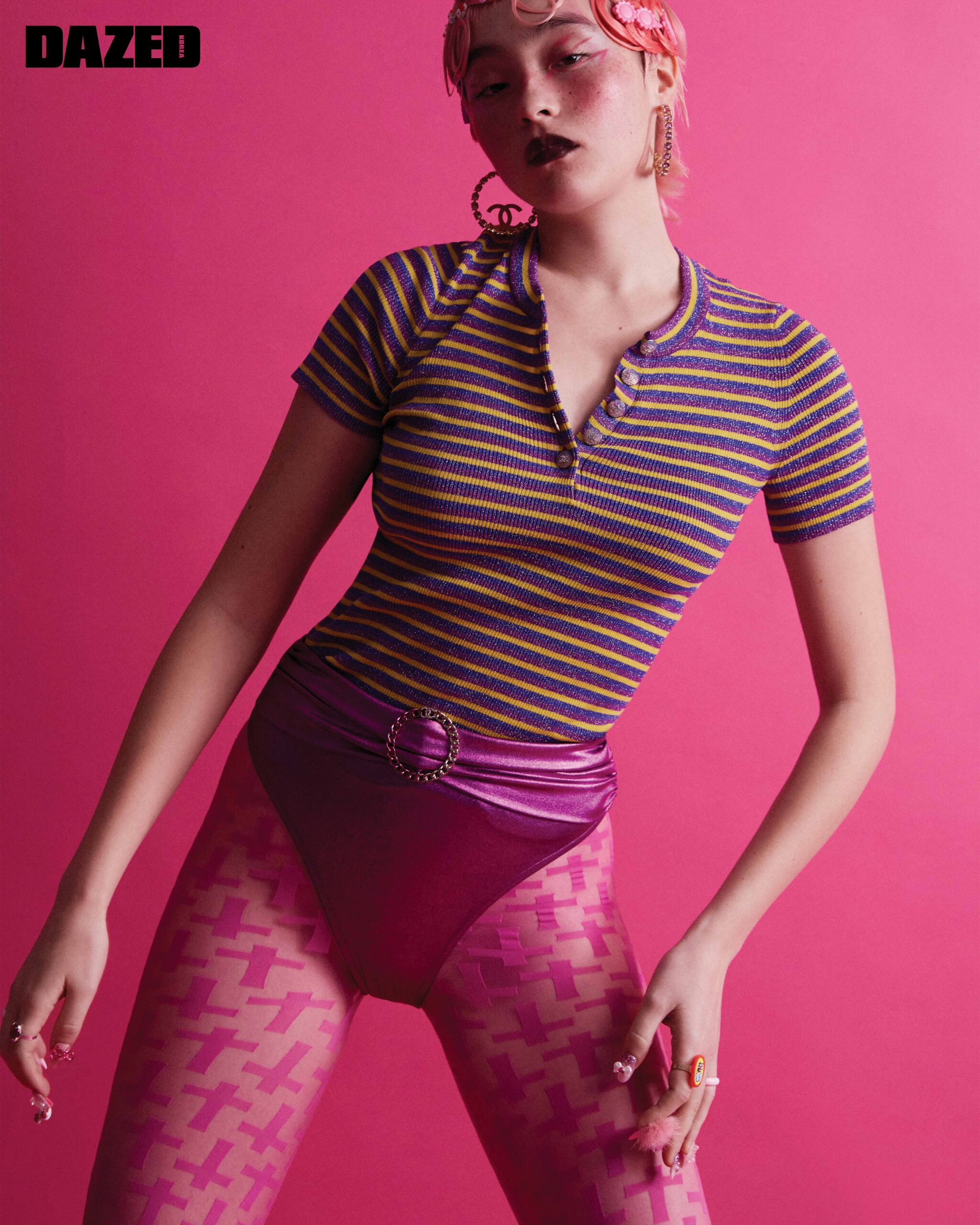 하프 슬리브 니트 톱과 스윔슈트 브리프, 메탈과 스트라스 소재의 이어링은 모두 샤넬(Chanel), 헤어핀과 링, 타이츠는 모두 디렉터의 것.