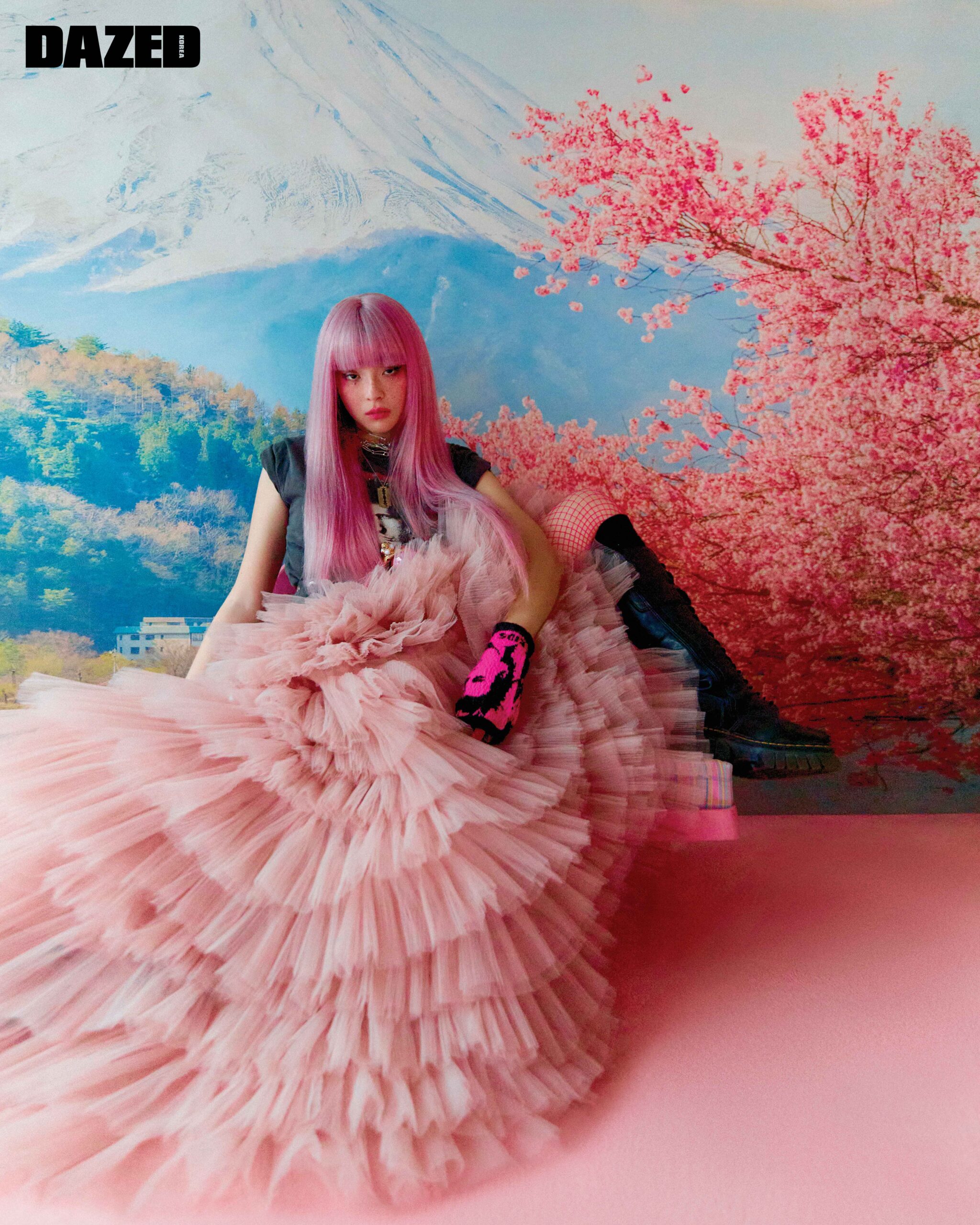 시스루 튈 해트는 메종 마르지엘라(Maison Margiela), 허리에 두른 리본은 핑크공 by 브라이덜공(Pinkong by Bridalkong), 드레스와 플랫폼 펌프스, 타이츠는 모두 디렉터의 것.
