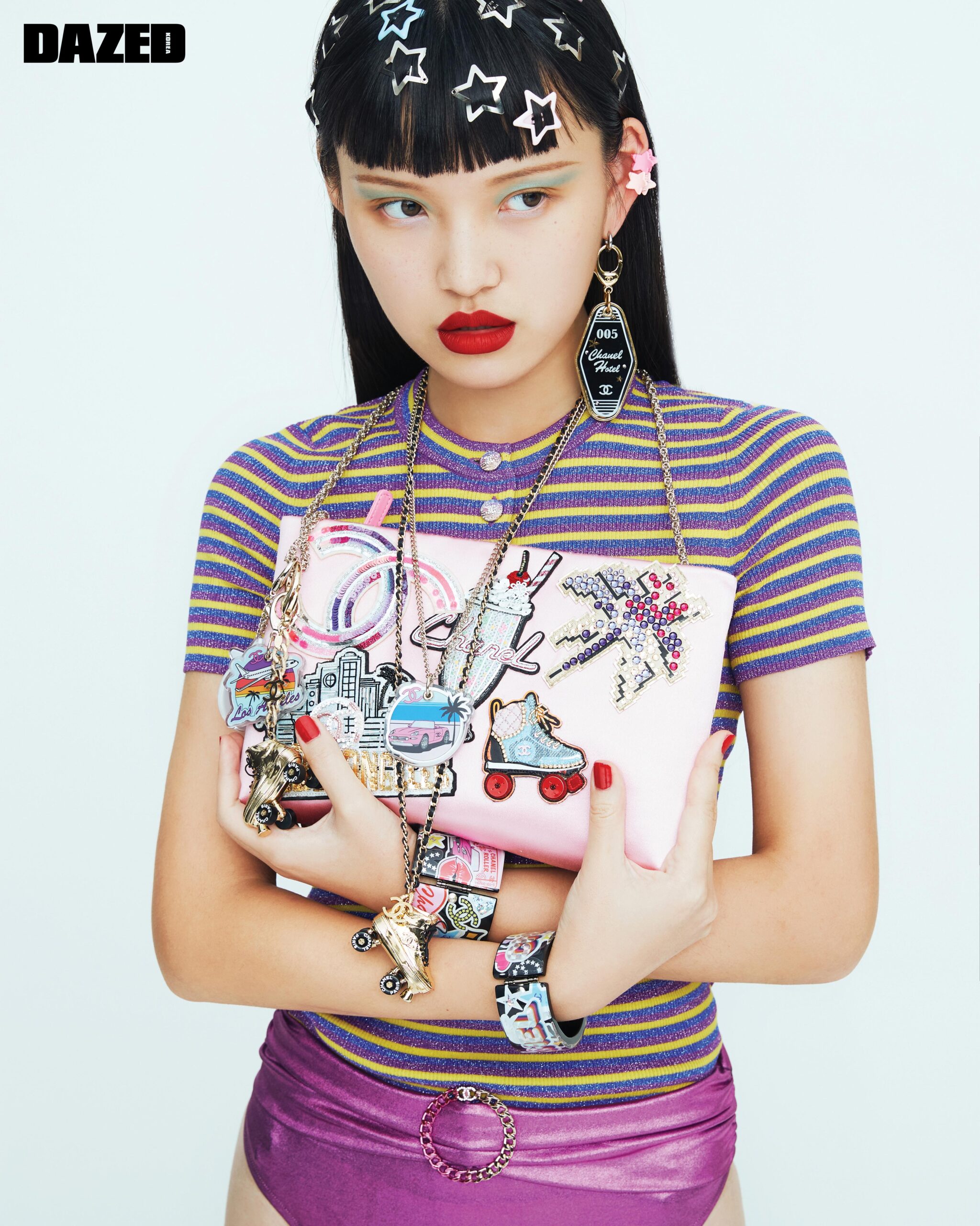 스트라이프 니트 톱과 저지 스위밍 트렁크, 이어링으로 연출한 키링, 레진 펜던트 네크리스, 롤러스케이트 펜던트 네크리스, 패치 디테일 클러치, 클러치에 연출한 레진 키링, 롤러스케이트 키링, 오른손과 왼손에 착용한 레진 브레이슬릿은 모두 샤넬(Chanel), 헤어핀과 이어 커프는 에디터의 것.