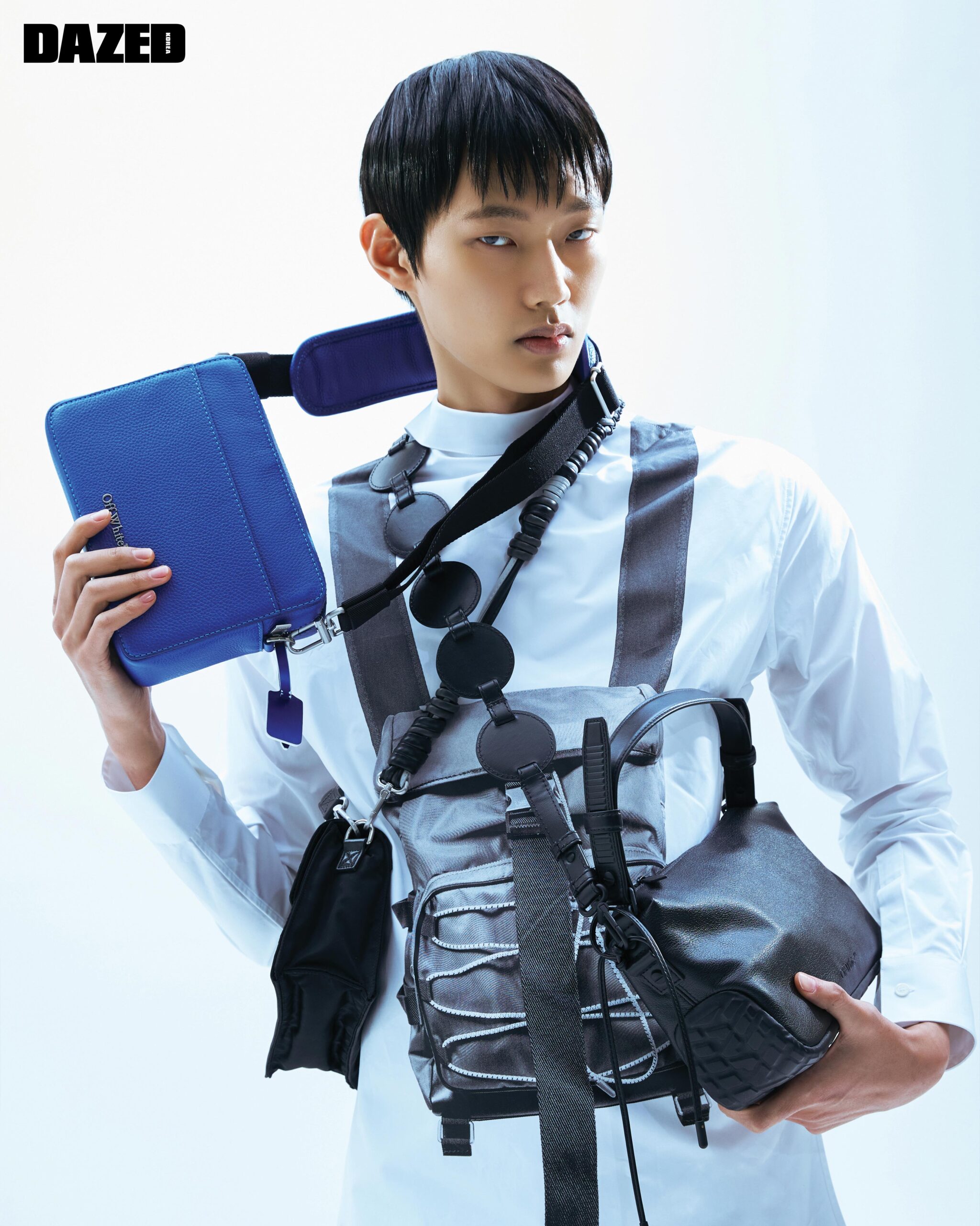 더블브레스트 코트와 팬츠, 브리크 사피아노 레더 백, 브리크 브러시드 레더 백, 슈즈는 모두 프라다(Prada), 이너 톱과 백에 연출한 재킷과 팬츠, 레더 팬츠, 타이, 스카프, 벨트, 서스펜더, 레더 글러브, 삭스는 모두 에디터의 것.