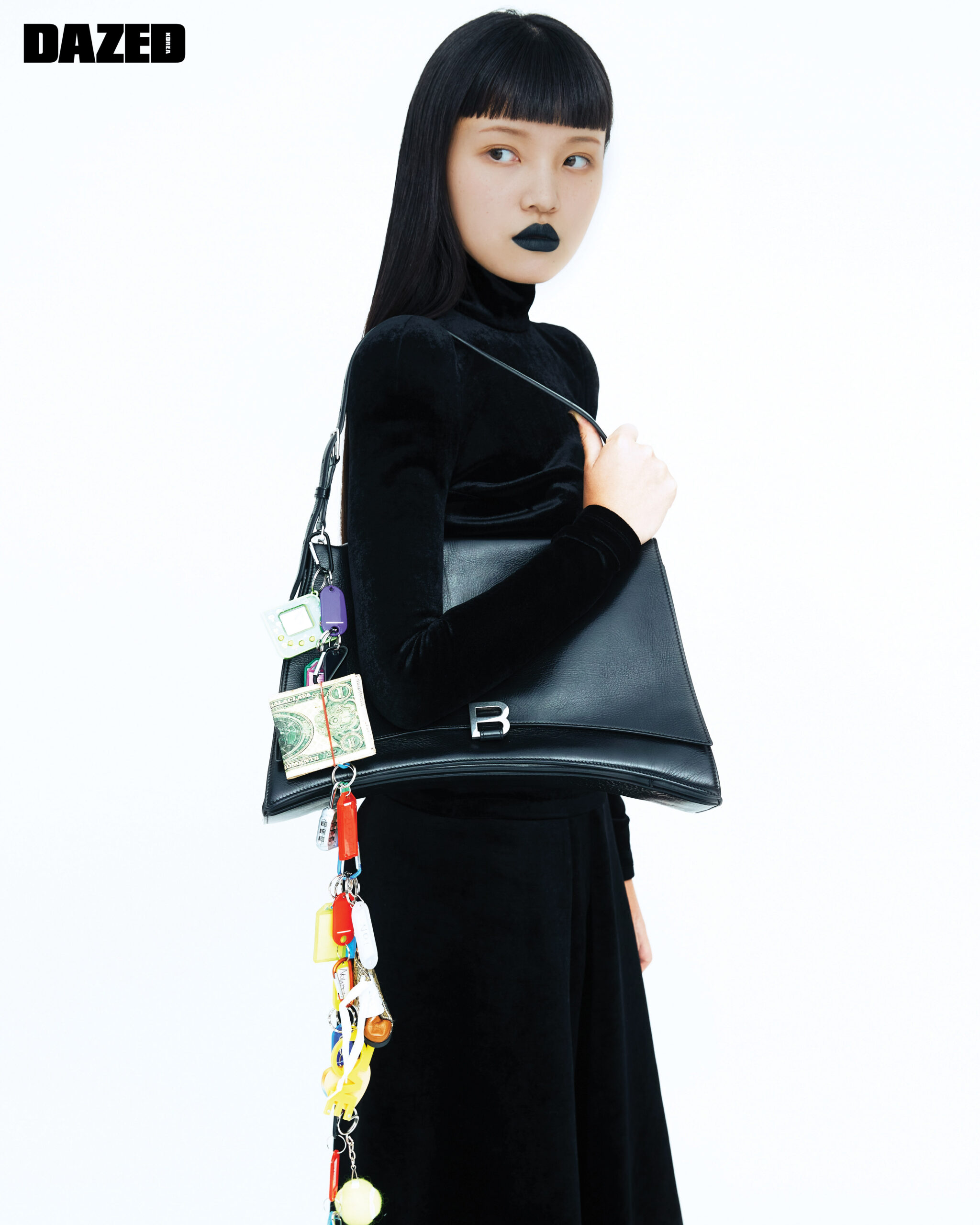 벨벳 라운드 숄더 톱과 벨벳 스커트, 아워글라스 백은 모두 발렌시아가(Balenciaga), 백에 연출한 키링은 모두 에디터의 것.