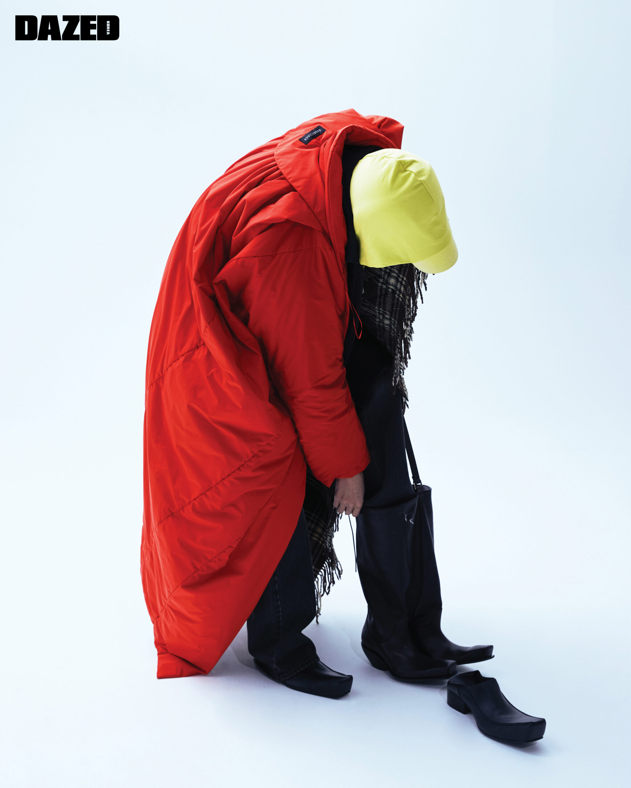 레드 스윙 CB 코트와 레이어링한 체크 레이어드 파카, 옐로 레이어드 후디, 블랙 슬림 핏 후디, 톱, 데님 팬츠, 팬츠와 레이어링한 타월 스커트, 뮬, 로데오 부츠 백은 모두 발렌시아가(Balenciaga).