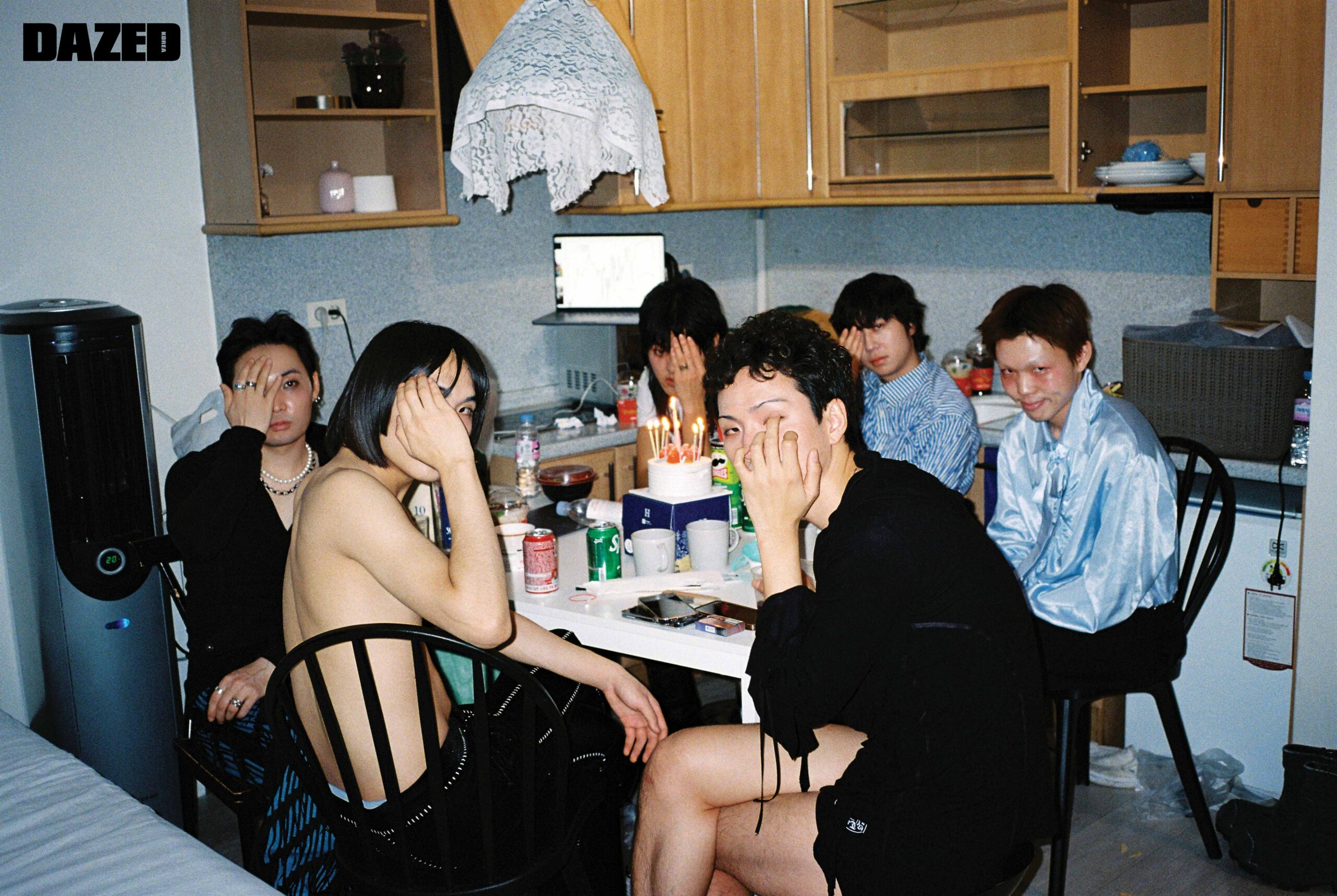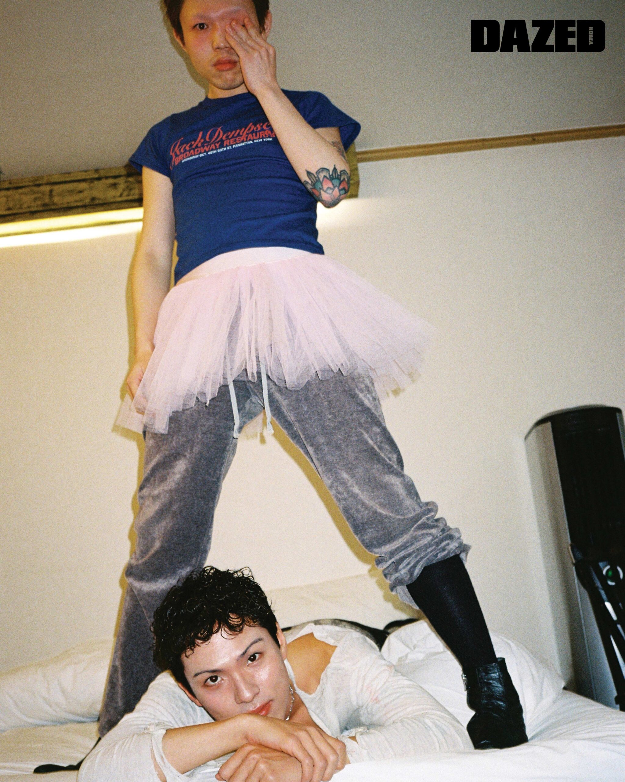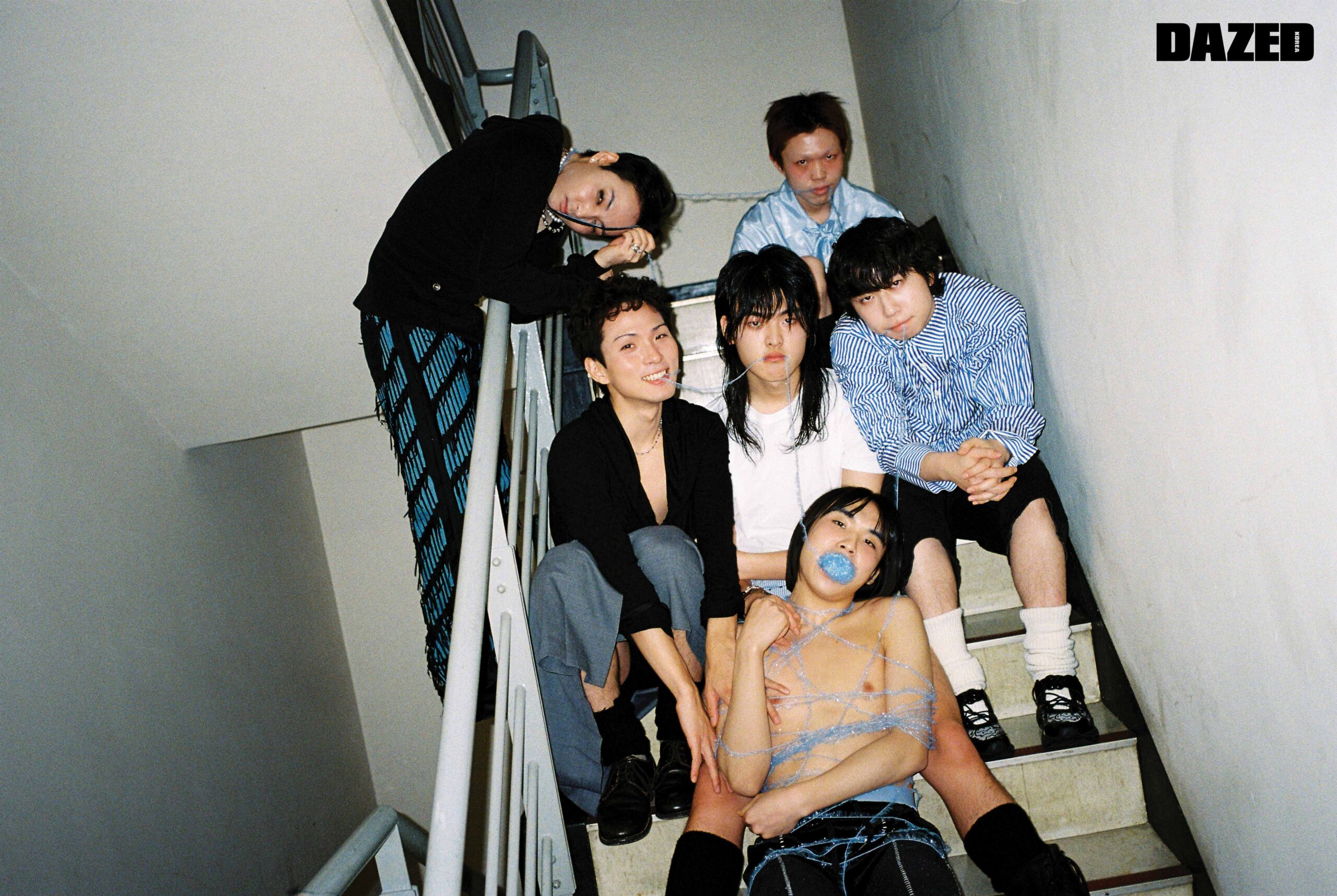 장재민이 입은 후드 톱은 에이시네틱스(Aesynctx), 컷아웃 디테일 데님 팬츠는 한킴(Hankim), 실버 링은 모두 블레스드 뷸렛(Blessed Bullet), 이어링과 네크리스는 장재민의 것. 정후가 입은 리본 타이 장식 실크 셔츠는 프롬 아를(From Arles), 플리츠스커트는 앤더슨벨(Andersson Bell). 지현우가 입은 블루 게더 디테일 셔츠는 텐더 퍼슨 by 엠프티(Tender Person by E( )PTY), 데님 쇼츠는 리바이스(Levi’s), 블랙 스니커즈는 아식스 × 세실리에 반센(ASICS × Cecilie Bahnsen), 레그 워머는 에디터의 것. 현이 입은 복서 쇼츠는 제이디드 런던(Jaded London), 실버 링은 현의 것, 톱과 부츠, 레그 워머는 모두 에디터의 것. 김성회가 입은 벨루어 팬츠는 텐더 퍼슨 by 엠프티(Tender Person by E( )PTY), 드로즈는 캘빈클라인 언더웨어(Calvin Klein Underwear). 존 케이브가 입은 러플 장식 후드 셔츠는 나체(Nache), 그레이 플리츠스커트는 비뮈에트(Bmuet(te)), 드로즈는 크롬하츠(Chrome Hearts), 실버 네크리스는 블레스드 뷸렛(Blessed Bullet), 슈즈는 존 케이브의 것, 레그 워머는 에디터의 것.