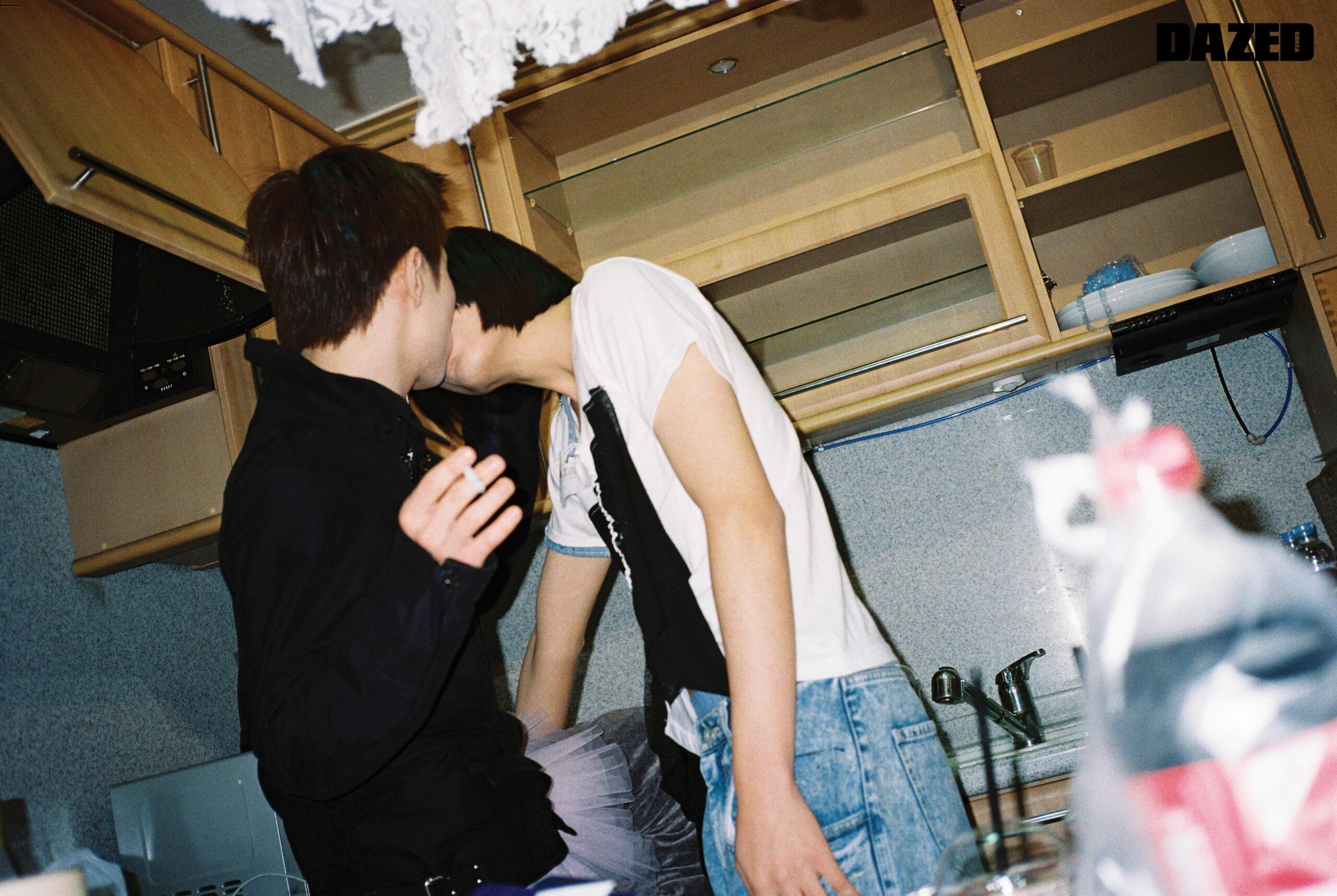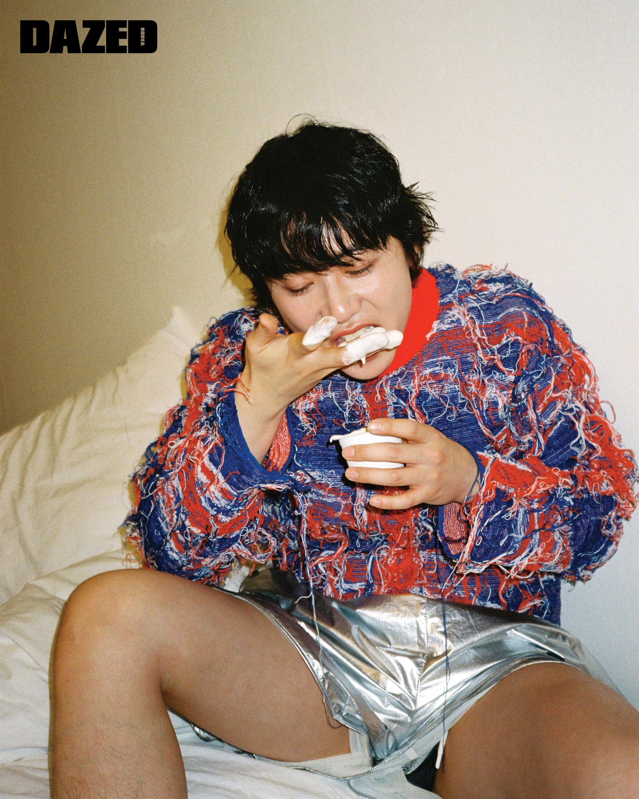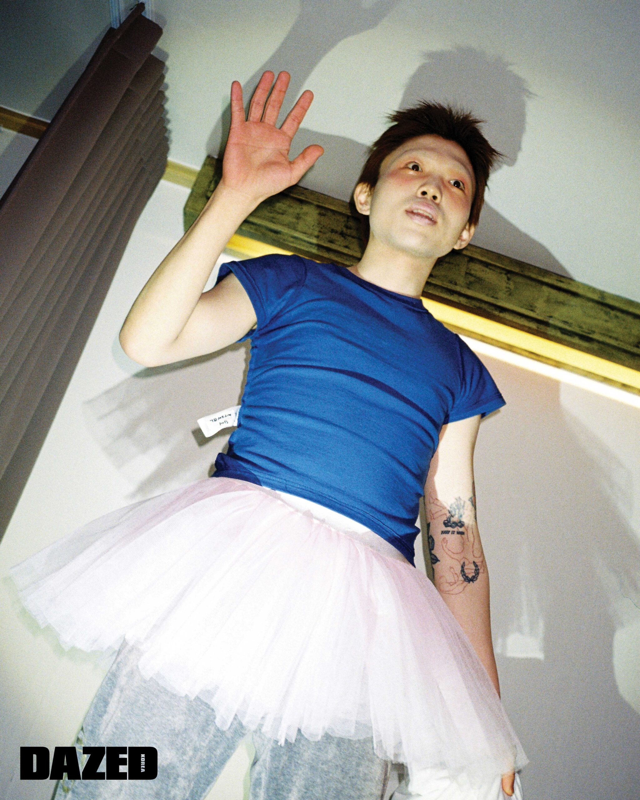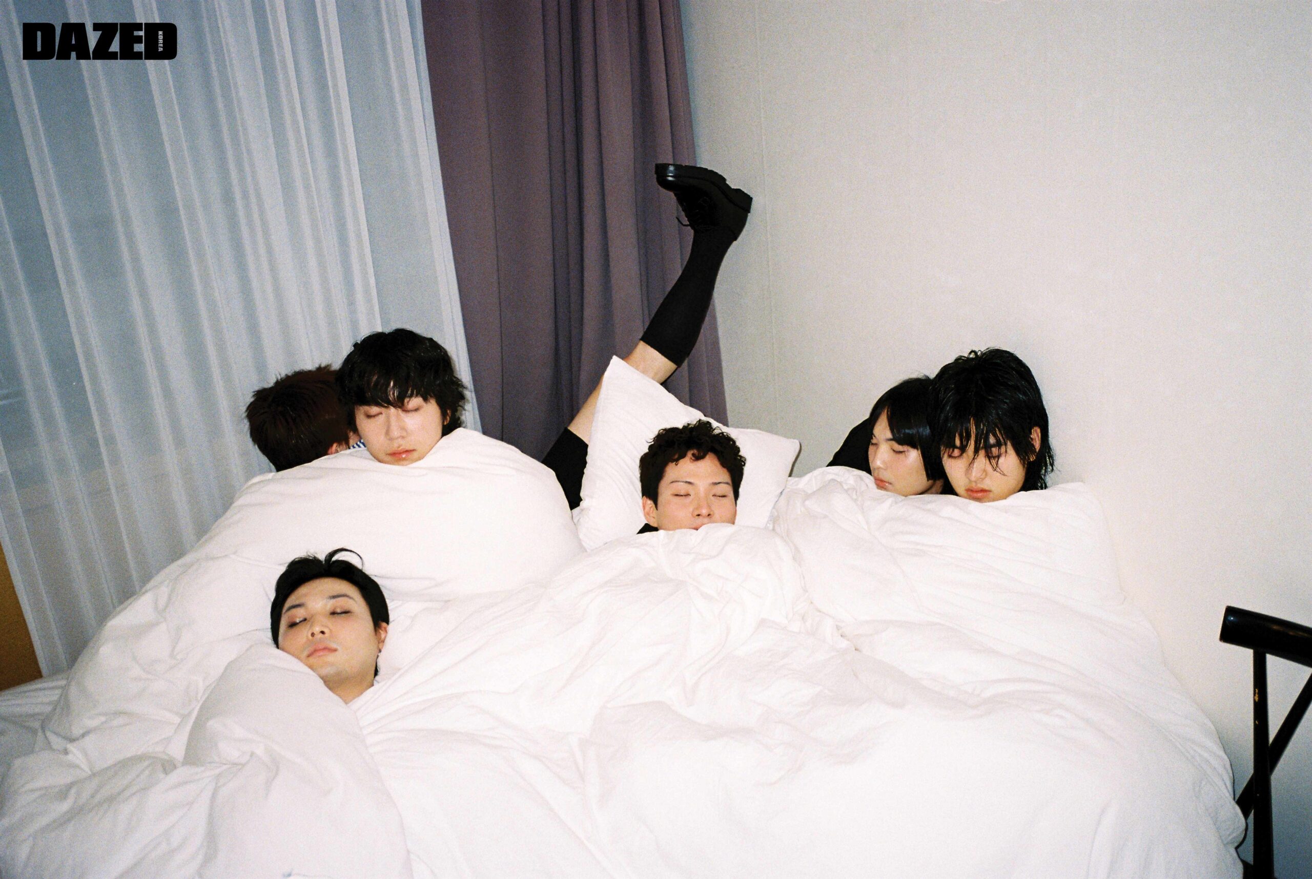 장재민이 입은 후드 톱은 에이시네틱스(Aesynctx), 컷아웃 디테일 데님 팬츠는 한킴(Hankim), 실버 링은 모두 블레스드 뷸렛(Blessed Bullet), 이어링과 네크리스는 장재민의 것. 정후가 입은 리본 타이 장식 실크 셔츠는 프롬 아를(From Arles), 플리츠스커트는 앤더슨벨(Andersson Bell). 지현우가 입은 블루 게더 디테일 셔츠는 텐더 퍼슨 by 엠프티(Tender Person by E( )PTY), 데님 쇼츠는 리바이스(Levi’s), 블랙 스니커즈는 아식스 × 세실리에 반센(ASICS × Cecilie Bahnsen), 레그 워머는 에디터의 것. 현이 입은 복서 쇼츠는 제이디드 런던(Jaded London), 실버 링은 현의 것, 톱과 부츠, 레그 워머는 모두 에디터의 것. 김성회가 입은 벨루어 팬츠는 텐더 퍼슨 by 엠프티(Tender Person by E( )PTY), 드로즈는 캘빈클라인 언더웨어(Calvin Klein Underwear). 존 케이브가 입은 러플 장식 후드 셔츠는 나체(Nache), 그레이 플리츠스커트는 비뮈에트(Bmuet(te)), 드로즈는 크롬하츠(Chrome Hearts), 실버 네크리스는 블레스드 뷸렛(Blessed Bullet), 슈즈는 존 케이브의 것, 레그 워머는 에디터의 것.