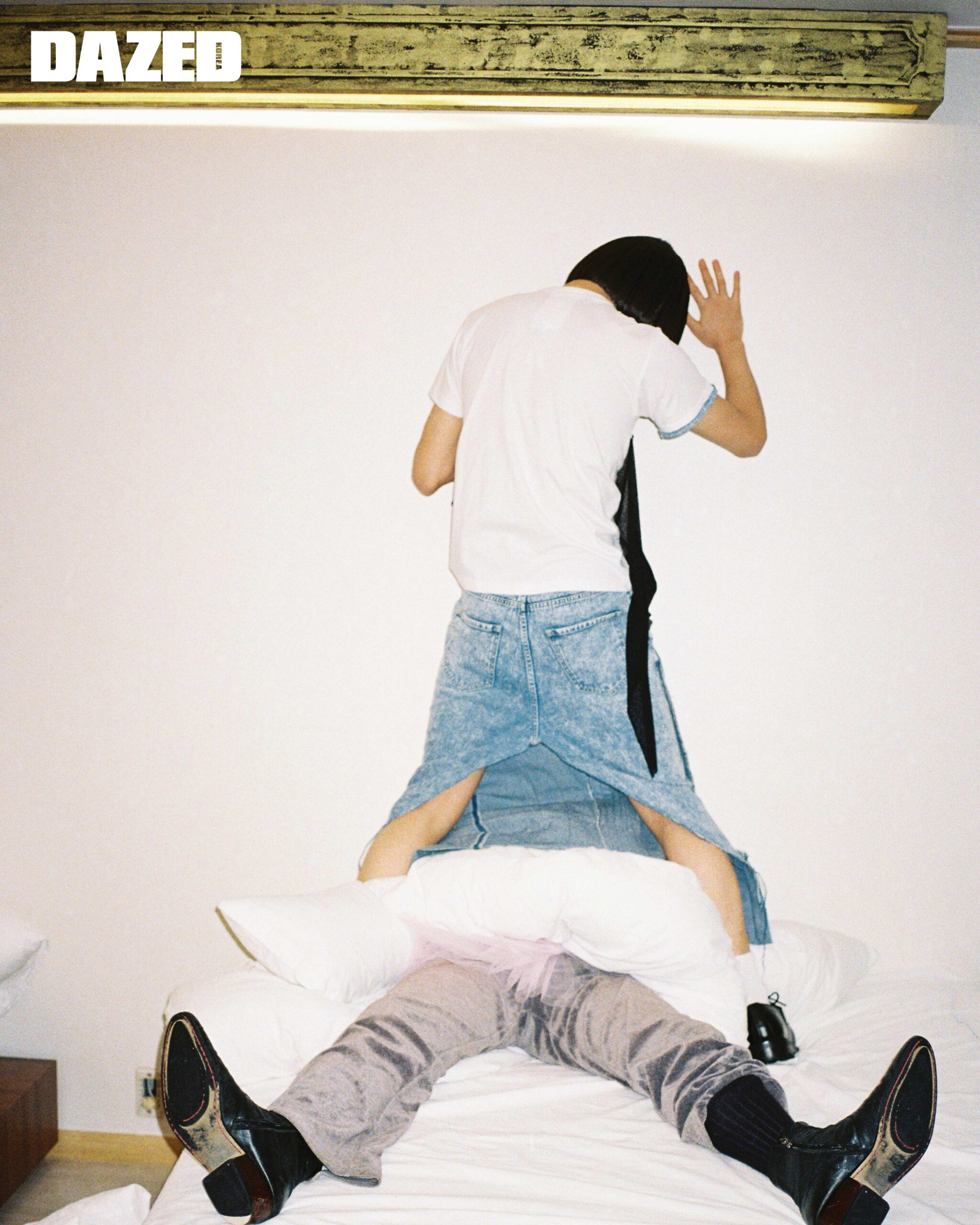 정후가 입은 코트와 팬츠는 정후의 것, 튀튀는 에디터의 것. 김성회가 입은 랩 디테일 톱과 데님 스커트는 PAX00100 by 엠프티(PAX00100 by E( )PTY), 드로즈는 캘빈클라인 언더웨어(Calvin Klein Underwear).