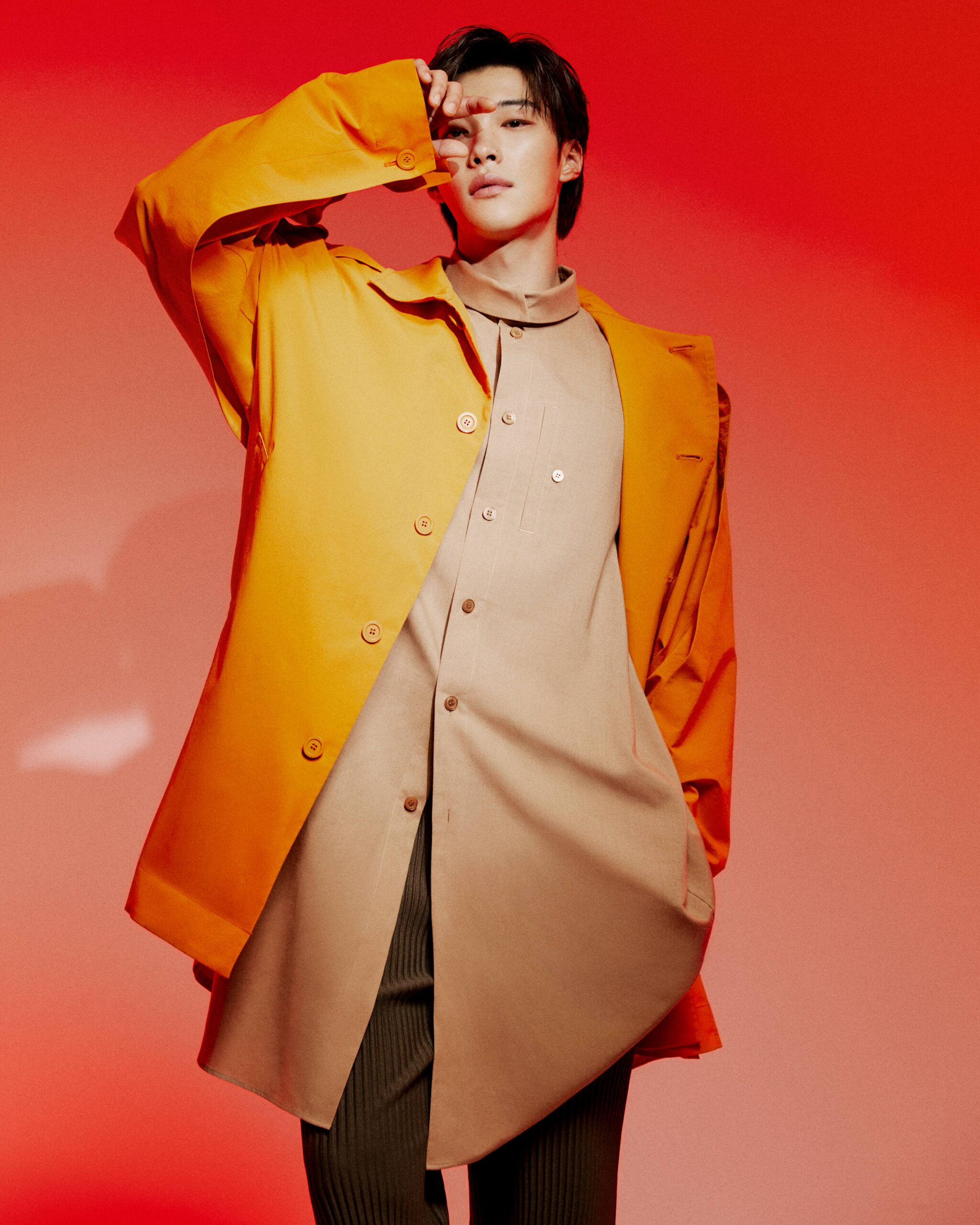 엣지 코트와 PL 라미 튜닉 셔츠, 테일러드 플리츠 스트레이트 팬츠는 모두 옴므 플리세(HOMME PLISSÉ).