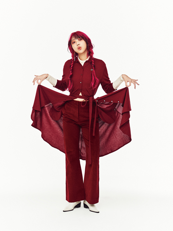 레드 니트 톱은 자크뮈스(Jacquemus), 팬츠는 르메르(Lemaire), 슈즈는 에디터의 것.