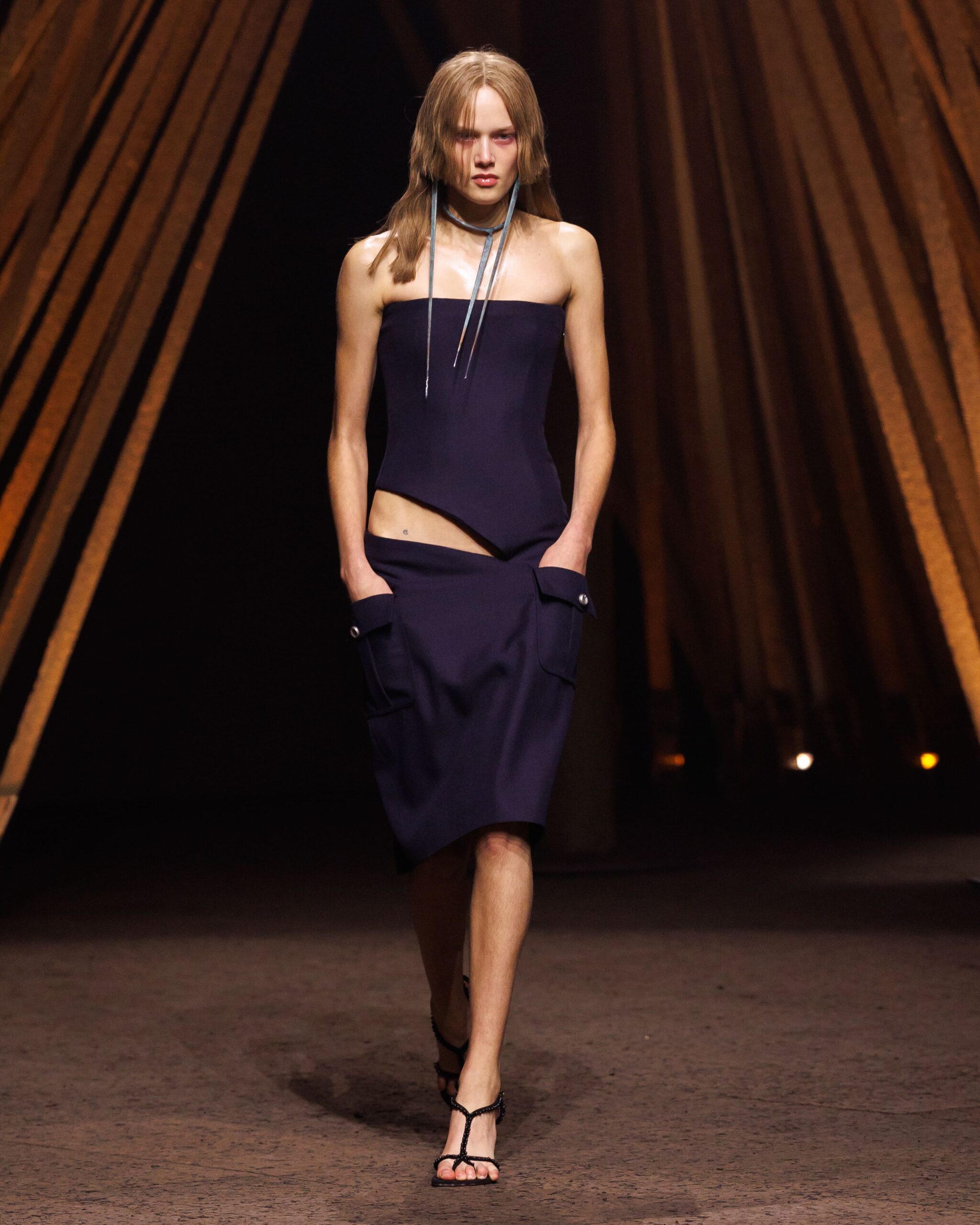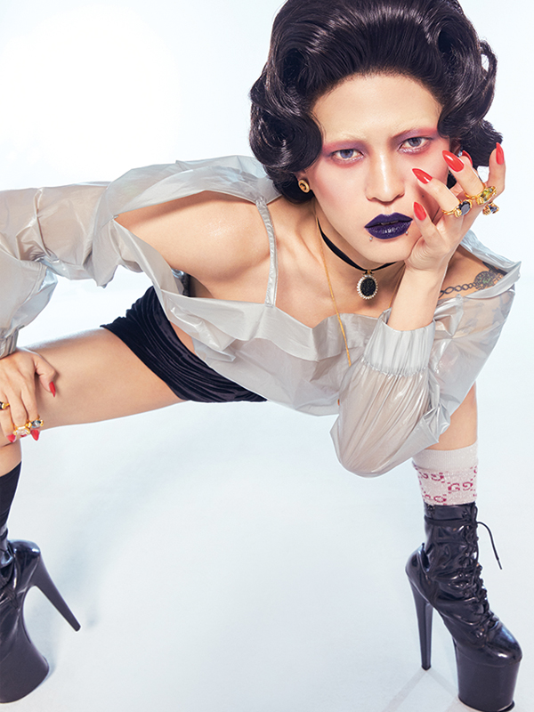 레더 코트와 팬츠는 살바토레 산토로(Salvatore Santoro), 프릴 디테일 시스루 톱은 MM6 메종 마르지엘라 by 육스(MM6 Maison Margiela by YOOX), 스틸레토 힐은 지안비토 로시(Gianvito Rossi).