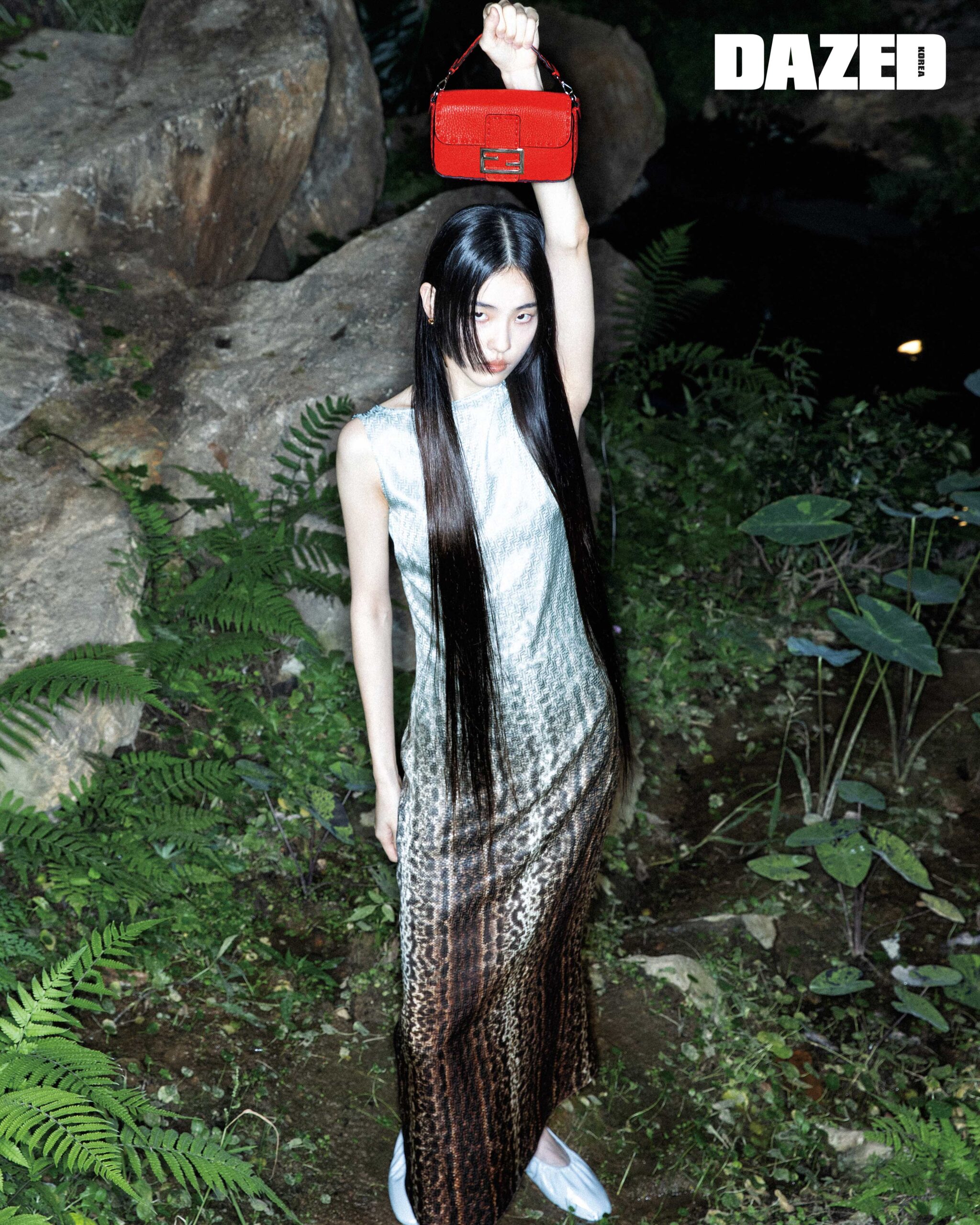 스네이크 패턴이 돋보이는 실크 드레스와 블루 발레리나 플랫 슈즈, F 로고가 특징인 빅 골드 이어링, 카프레더 소재의 바게트 미니 레드 백은 모두 펜디(Fendi).