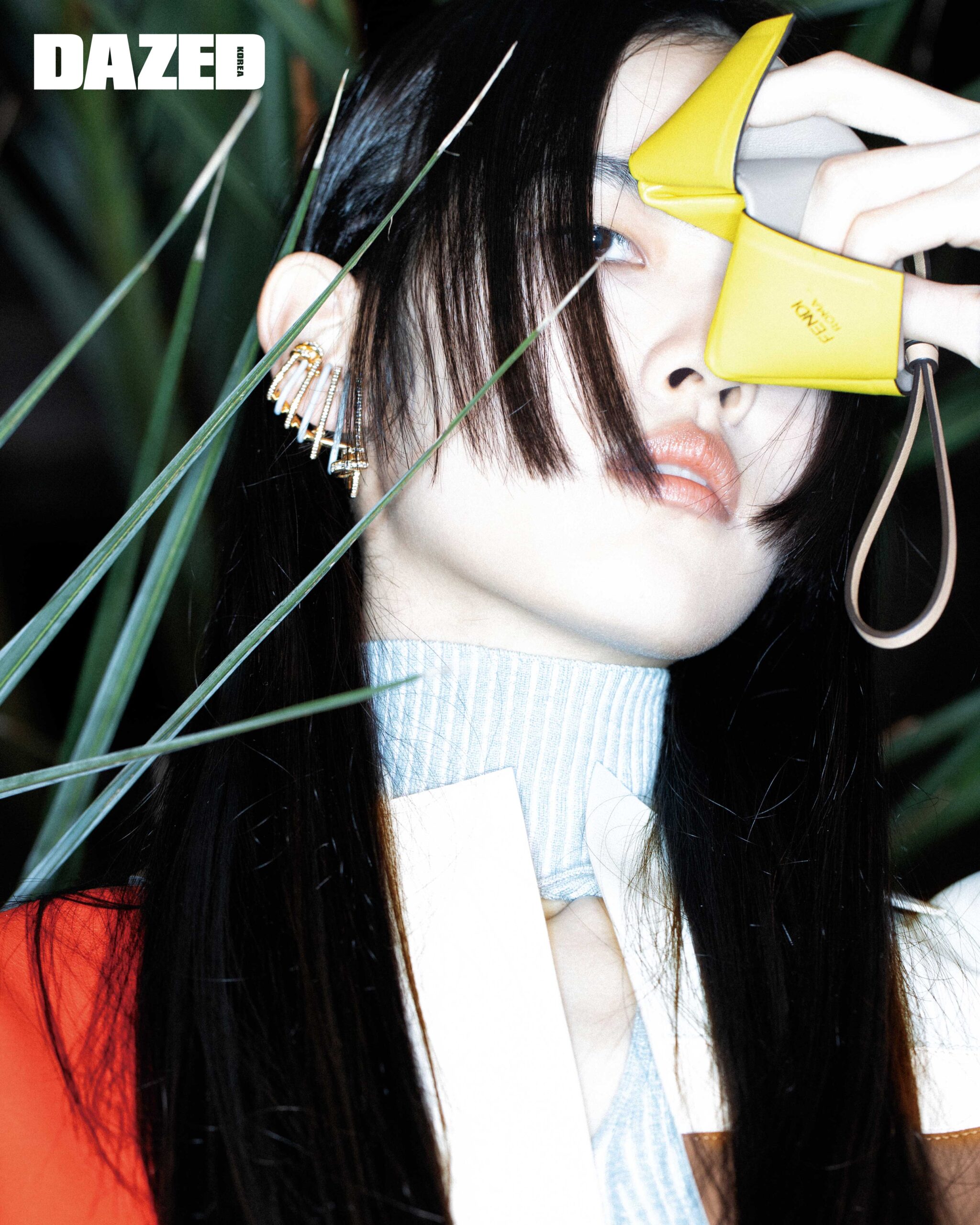 컬러 블록이 특징인 레더 재킷과 니트 톱, 골드 이어 커프, 카프레더 소재의 펜디 오리가미 옐로 참은 모두 펜디(Fendi).
