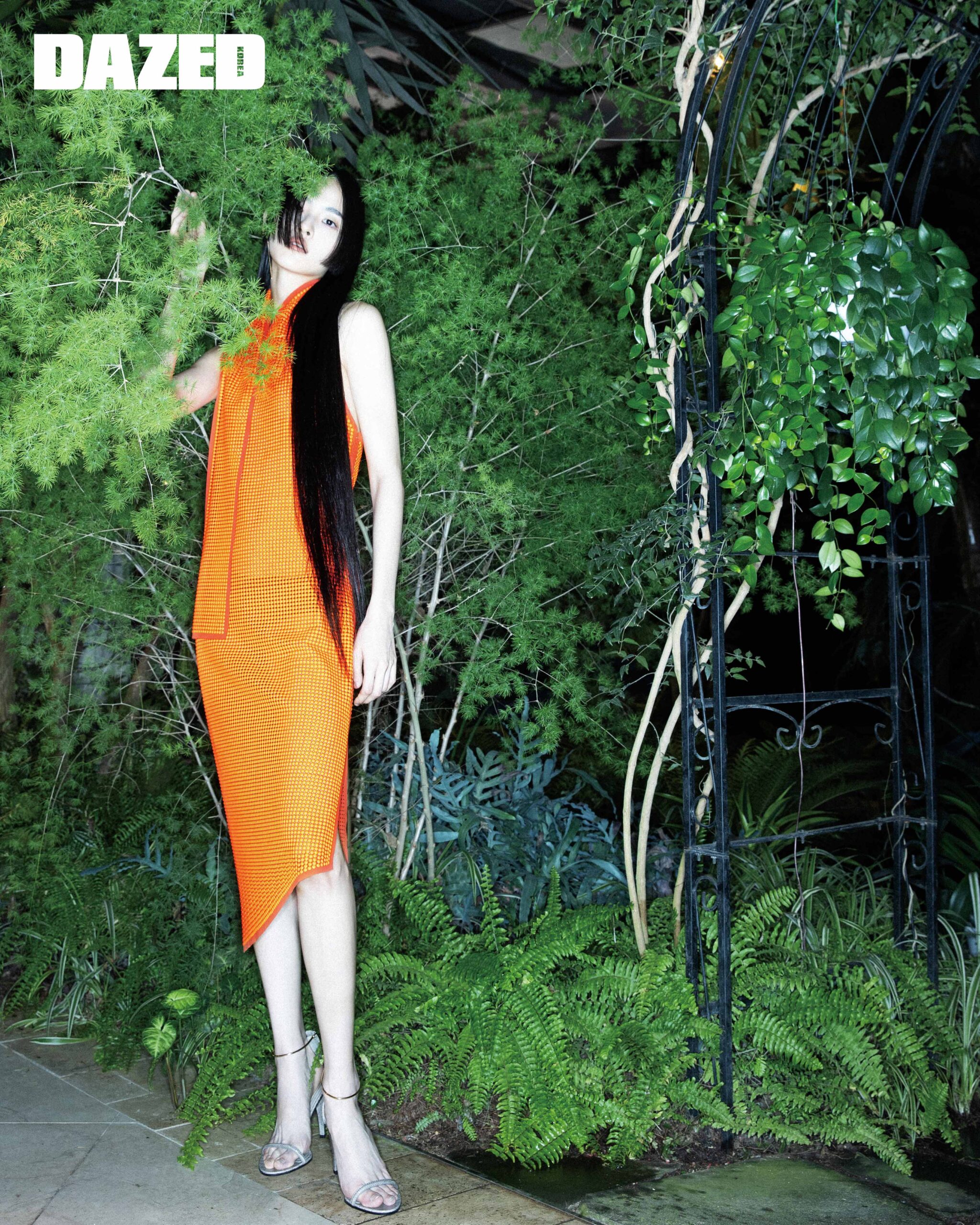 폴리에스테르 소재의 오렌지 드레스와 베이지 컬러의 펜디 필로 샌들 힐, F 로고가 특징인 빅 골드 이어링은 모두 펜디(Fendi).
