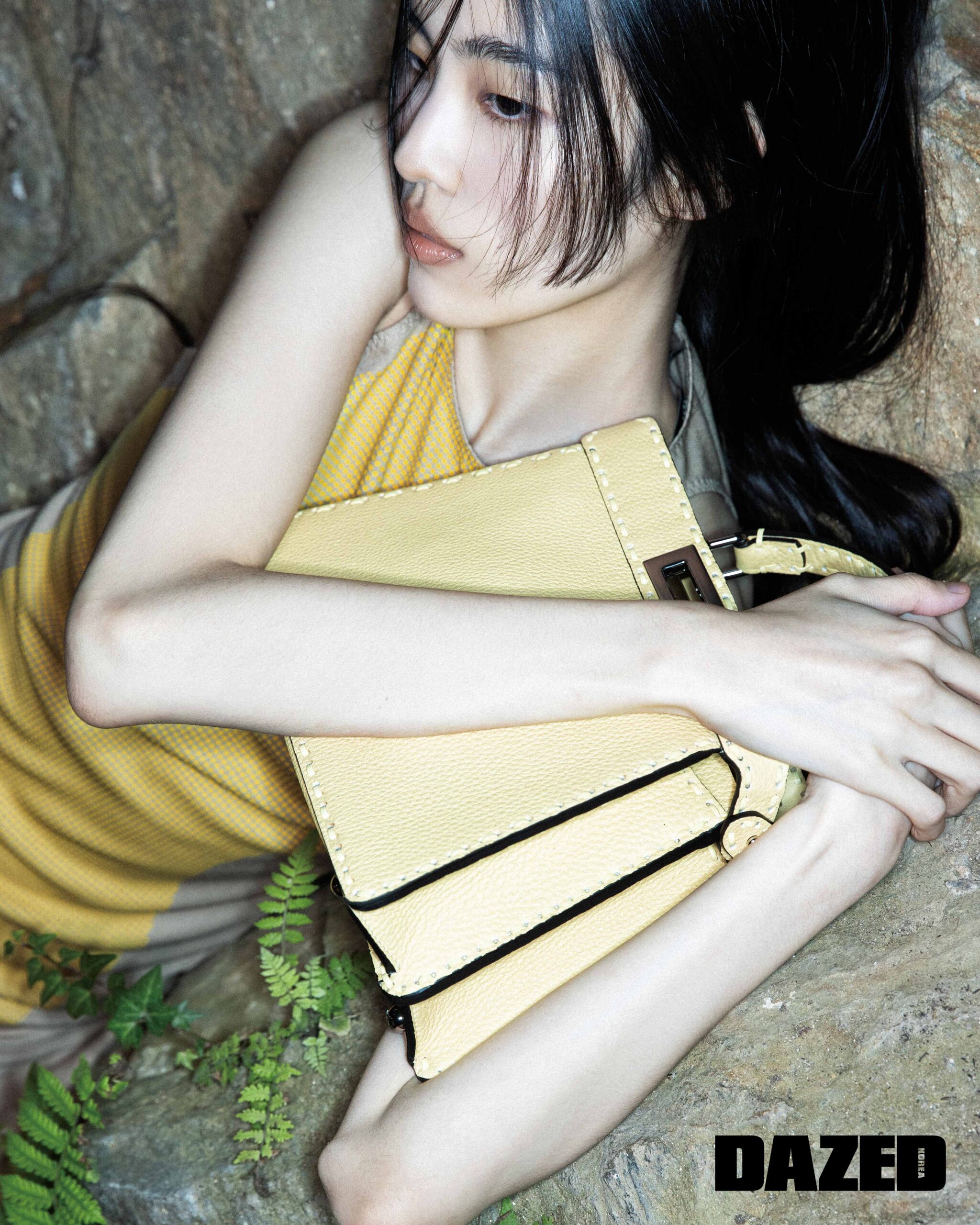 레이온 소재의 그레이 옐로 드레스와 카프레더 소재의 피카부 스몰 옐로 백은 펜디(Fendi).
