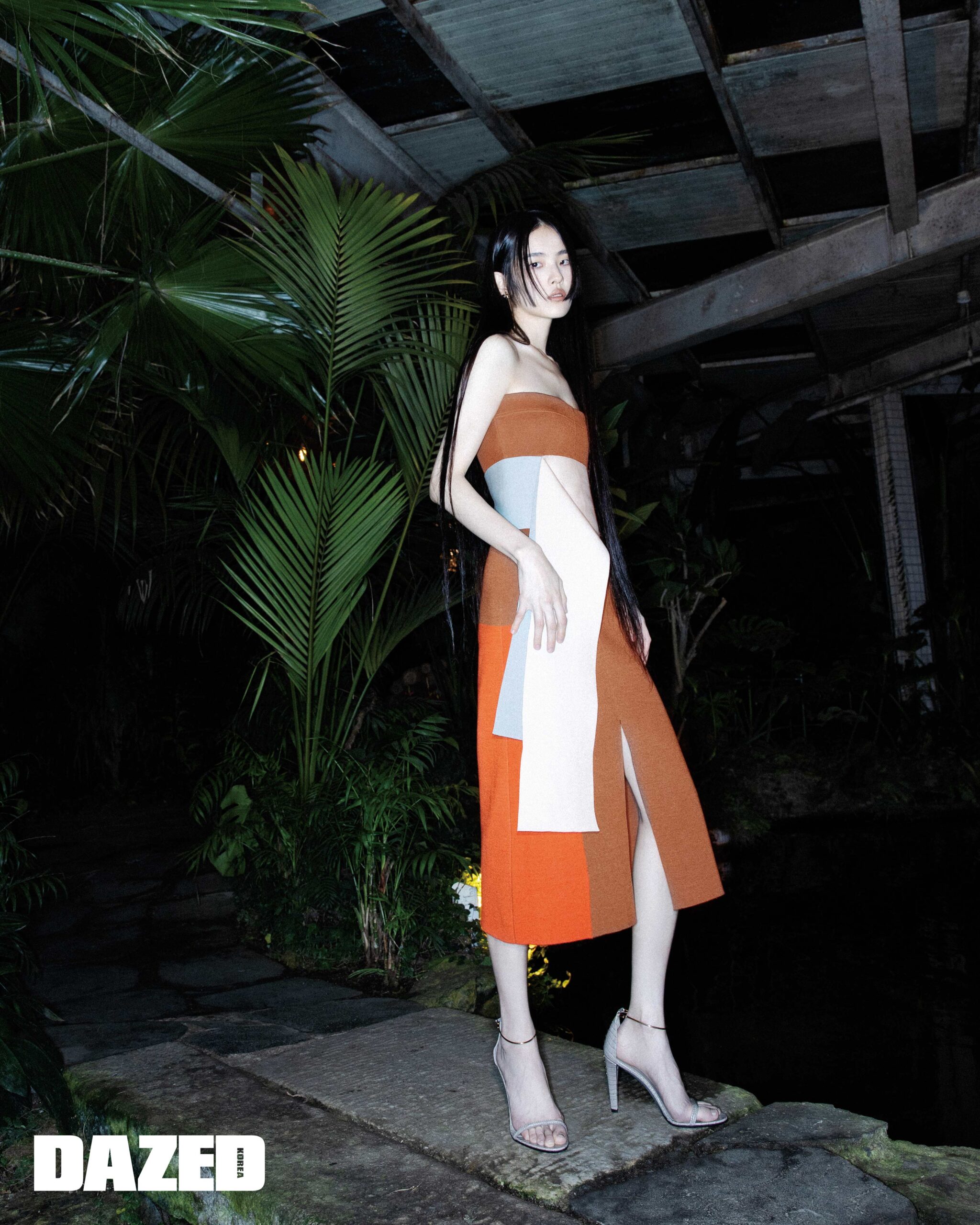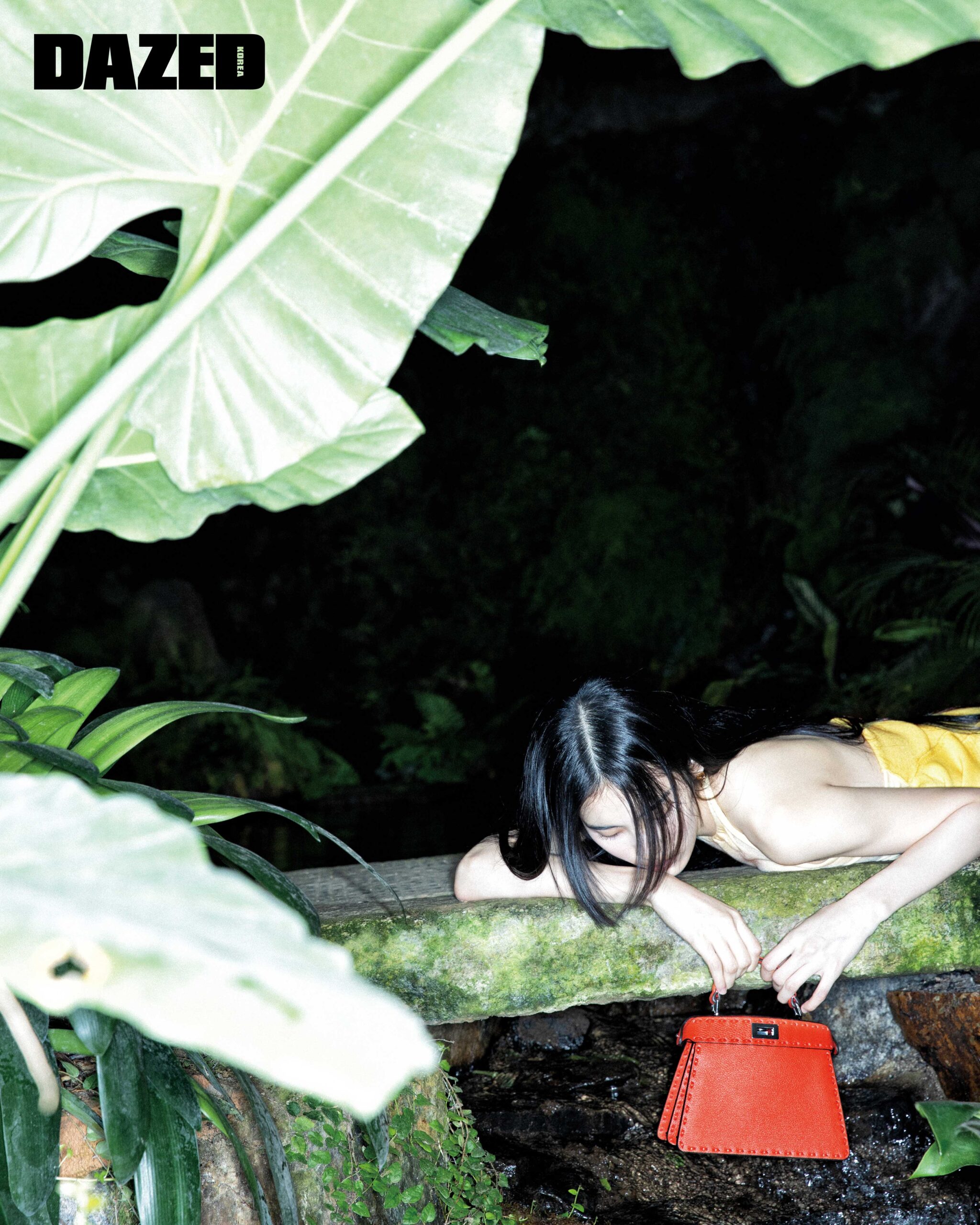 웨이스트 디테일이 독특한 슬리브리스 톱과 골드 이어 커프, 카프레더 소재의 피카부 쁘띠 오렌지 백은 모두 펜디(Fendi).