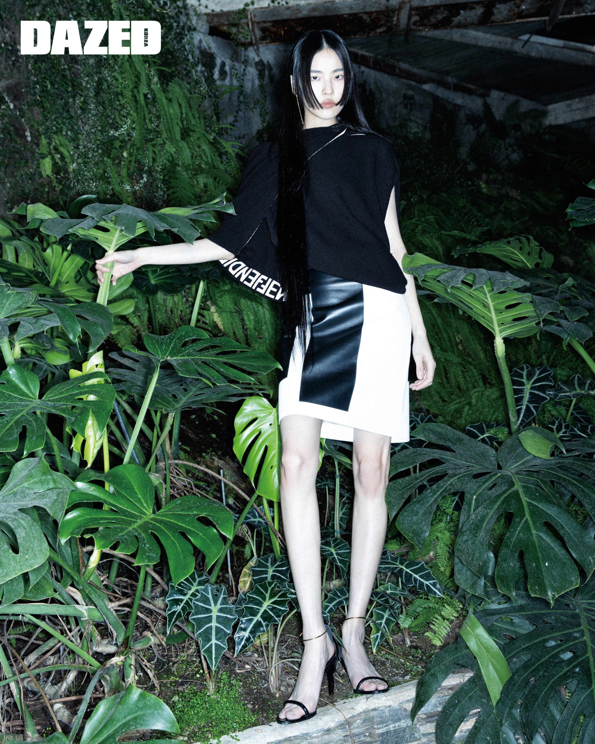 웨이스트 디테일이 독특한 슬리브리스 톱과 울 모헤어 팬츠, 카프레더 소재의 펌프 힐, 골드 이어 커프는 모두 펜디(Fendi).