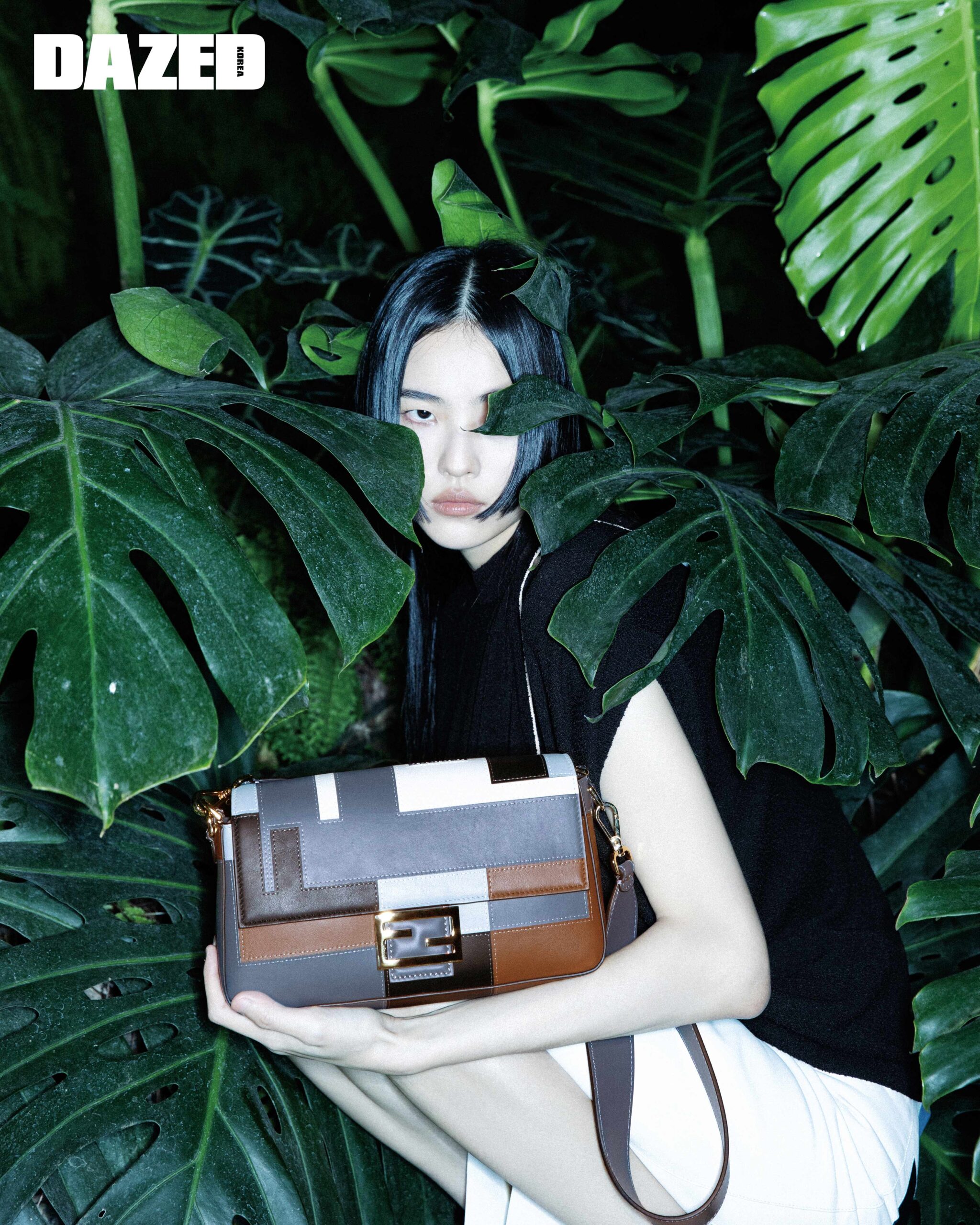 니트 카디건과 니트 톱, 컬러 블록이 특징인 레더 스커트, 카프레더 소재의 바게트 미디엄 컬러 블록 백은 모두 펜디(Fendi).
