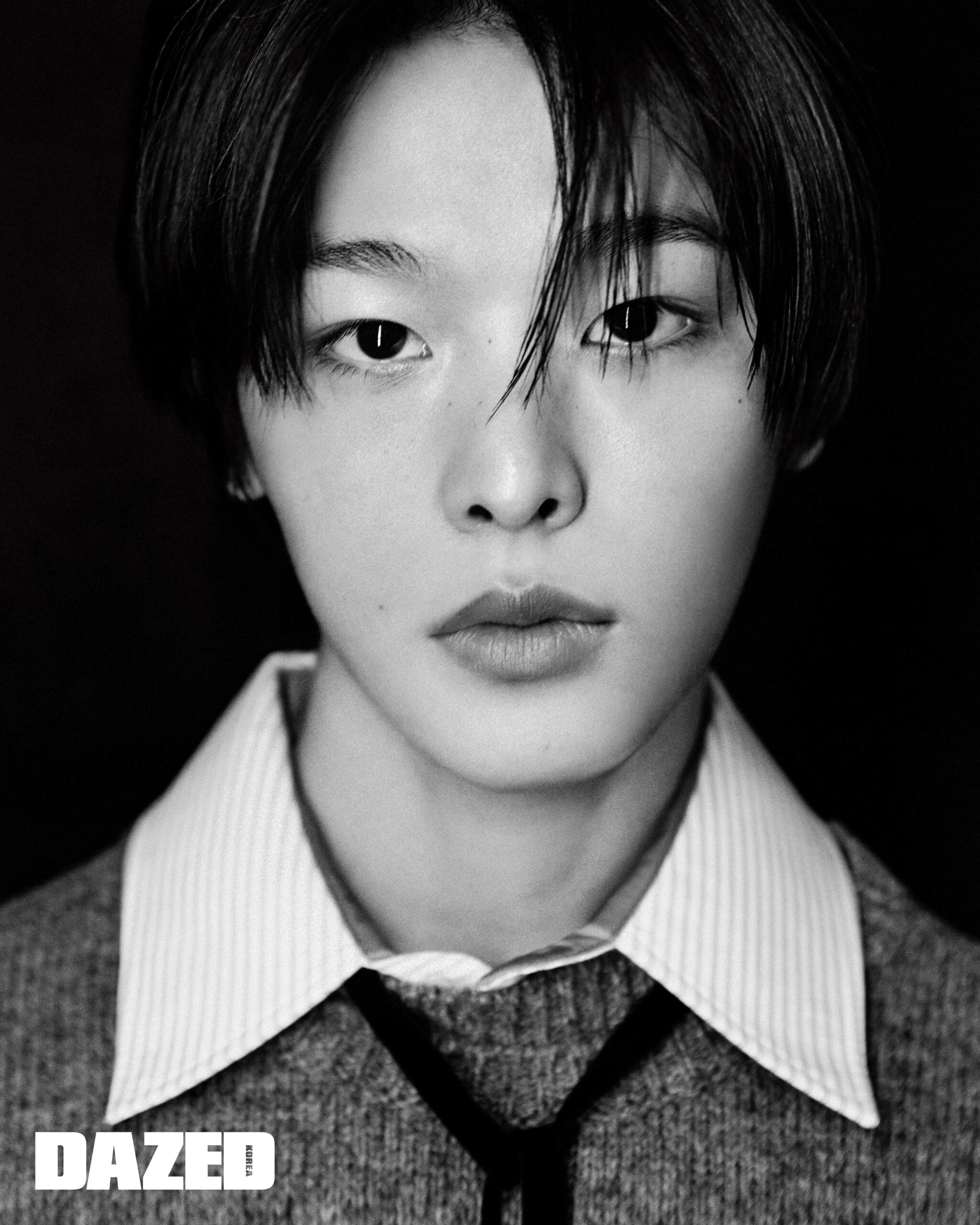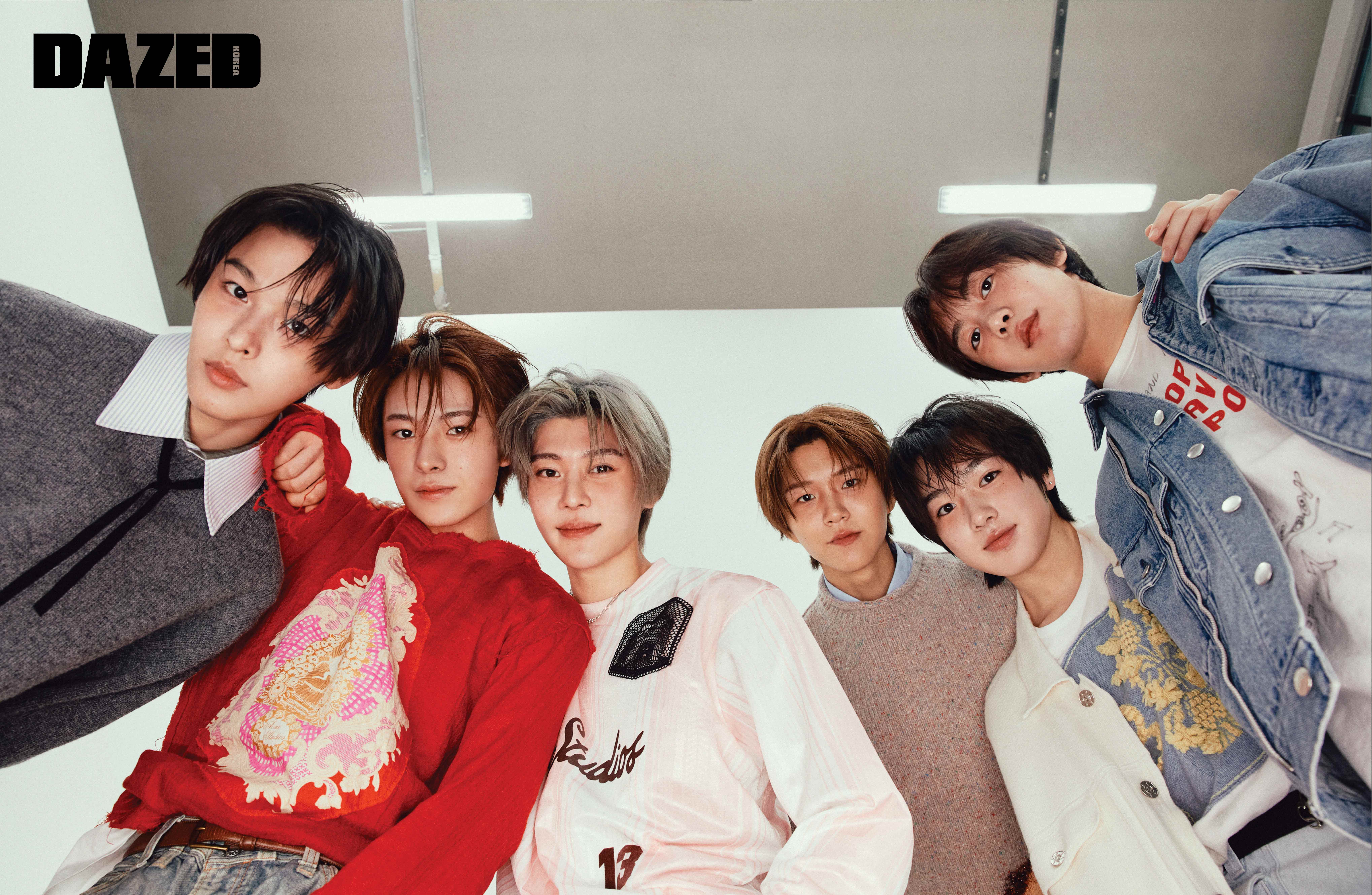 리쿠가 입은 그레이 니트와 셔츠, 타이는 모두 메종 마르지엘라(Maison Margiela). 유우시가 입은 니트와 팬츠는 아크네 스튜디오(Acne Studios), 벨트는 폴로 랄프 로렌(Polo Ralph Lauren), 화이트 슬리브는 스타일리스트의 것. 시온이 입은 슬리브 톱은 아크네 스튜디오(Acne Studios), 네크리스는 마티네알리(Martineali). 재희가 입은 니트는 아크네 스튜디오(Acne Studios), 셔츠는 스튜디오 니콜슨(Studio Nicholson). 사쿠야가 입은 재킷과 자수 디테일 슬리브는 배리(Barrie), 벨트는 아크네 스튜디오(Acne Studios), 팬츠는 베르사체(Versace), 이어링은 사쿠야의 것. 료가 입은 데님 재킷은 엠부쉬(Ambush), 프린트 톱은 메종 미하라 야스히로(Maison Mihara Yasuhiro).