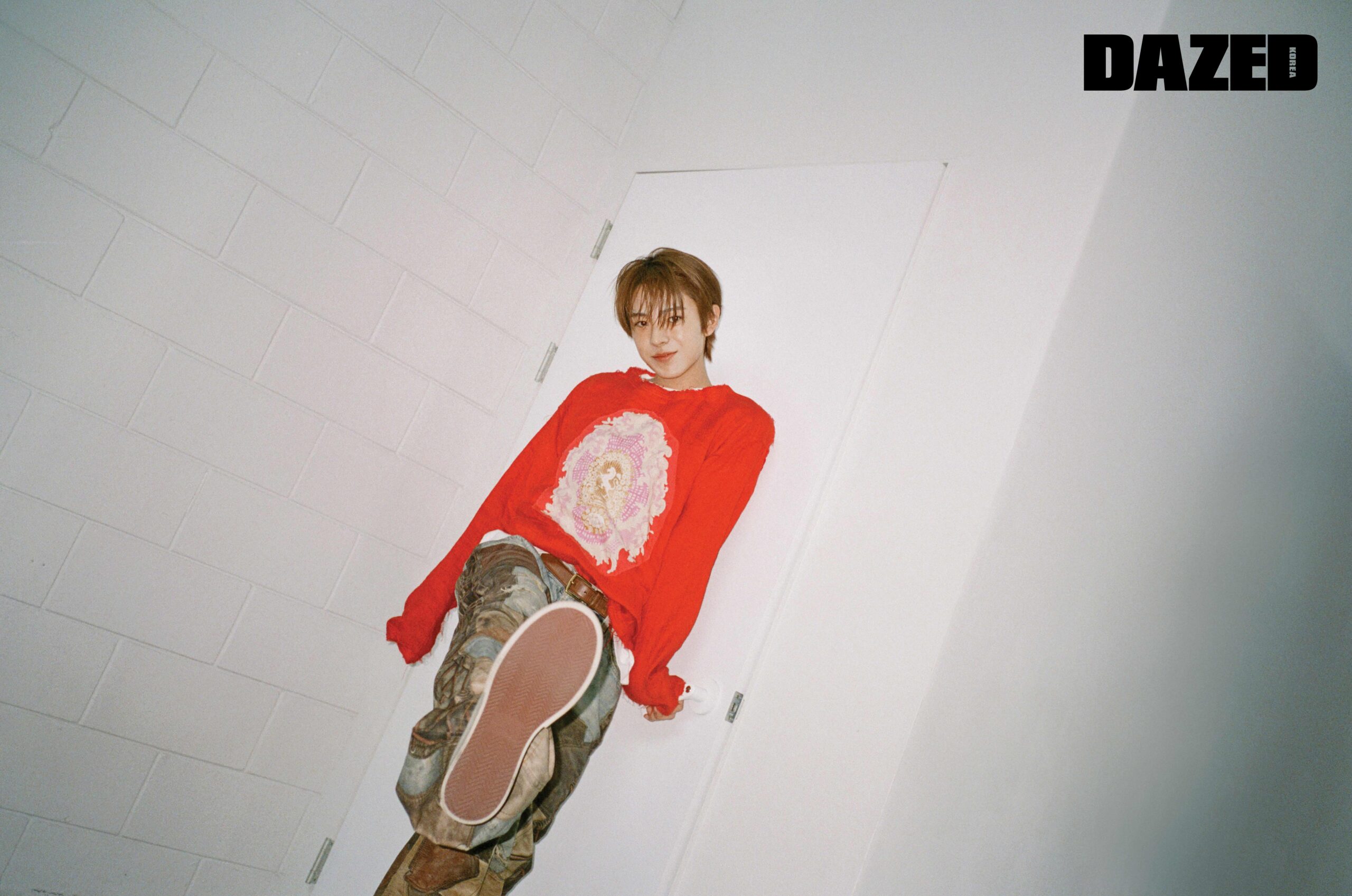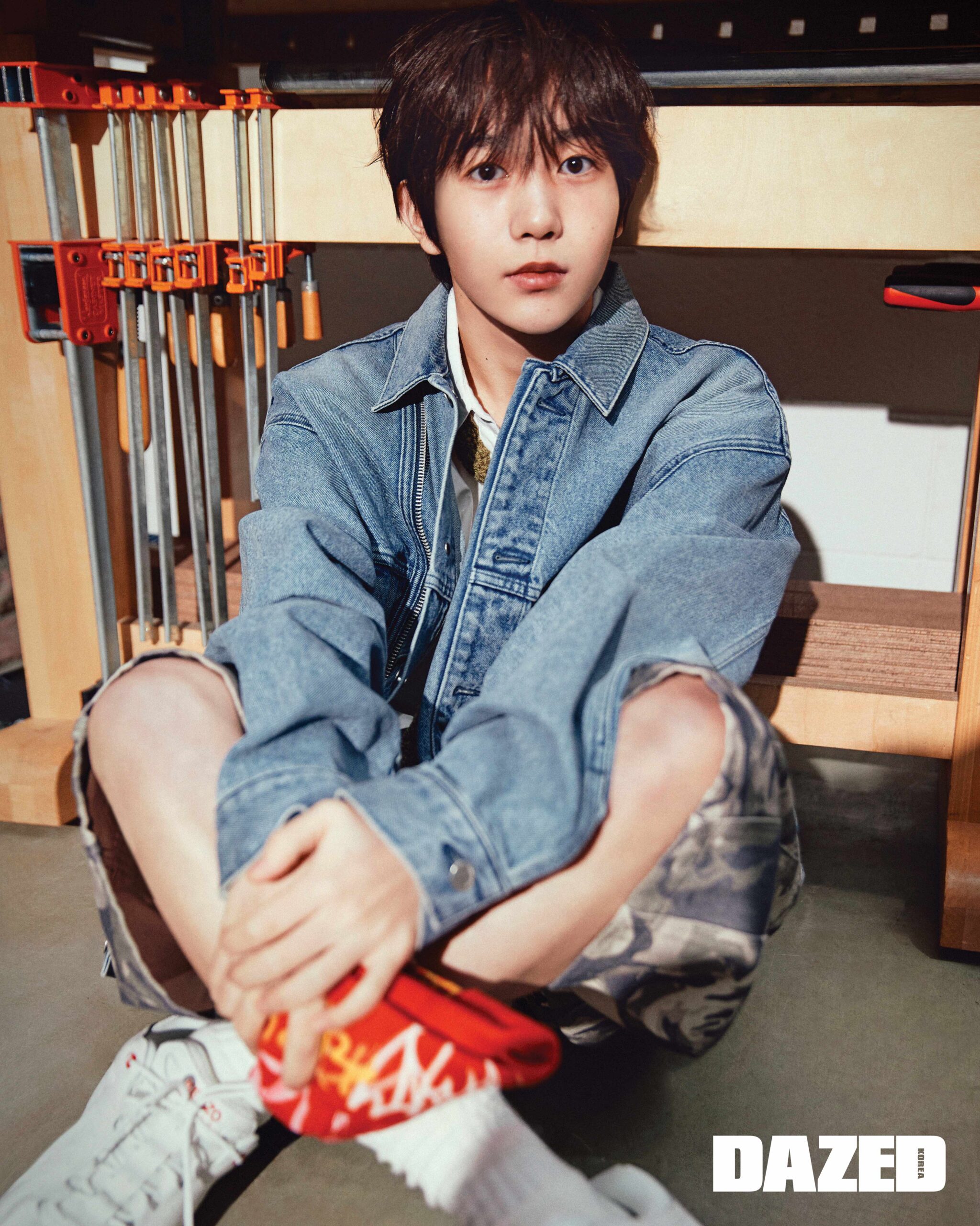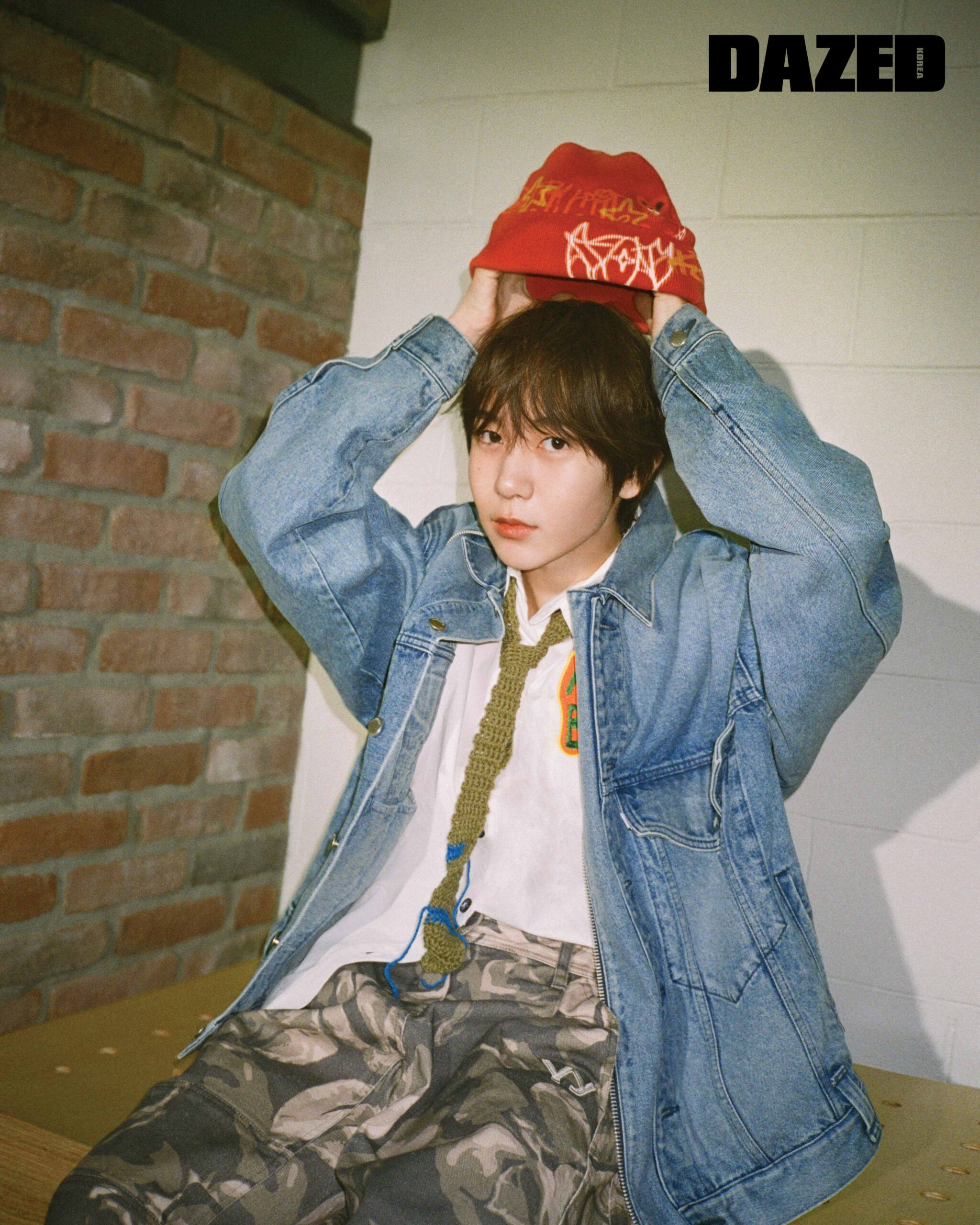 데님 재킷은 엠부쉬(Ambush), 화이트 셔츠는 라팜(Lafam), 팬츠는 오픈와이와이(Open YY), 그래픽 비니는 산쿠안즈(Sankuanz), 스니커즈는 겐조(Kenzo), 니트 타이와 삭스는 스타일리스트의 것.