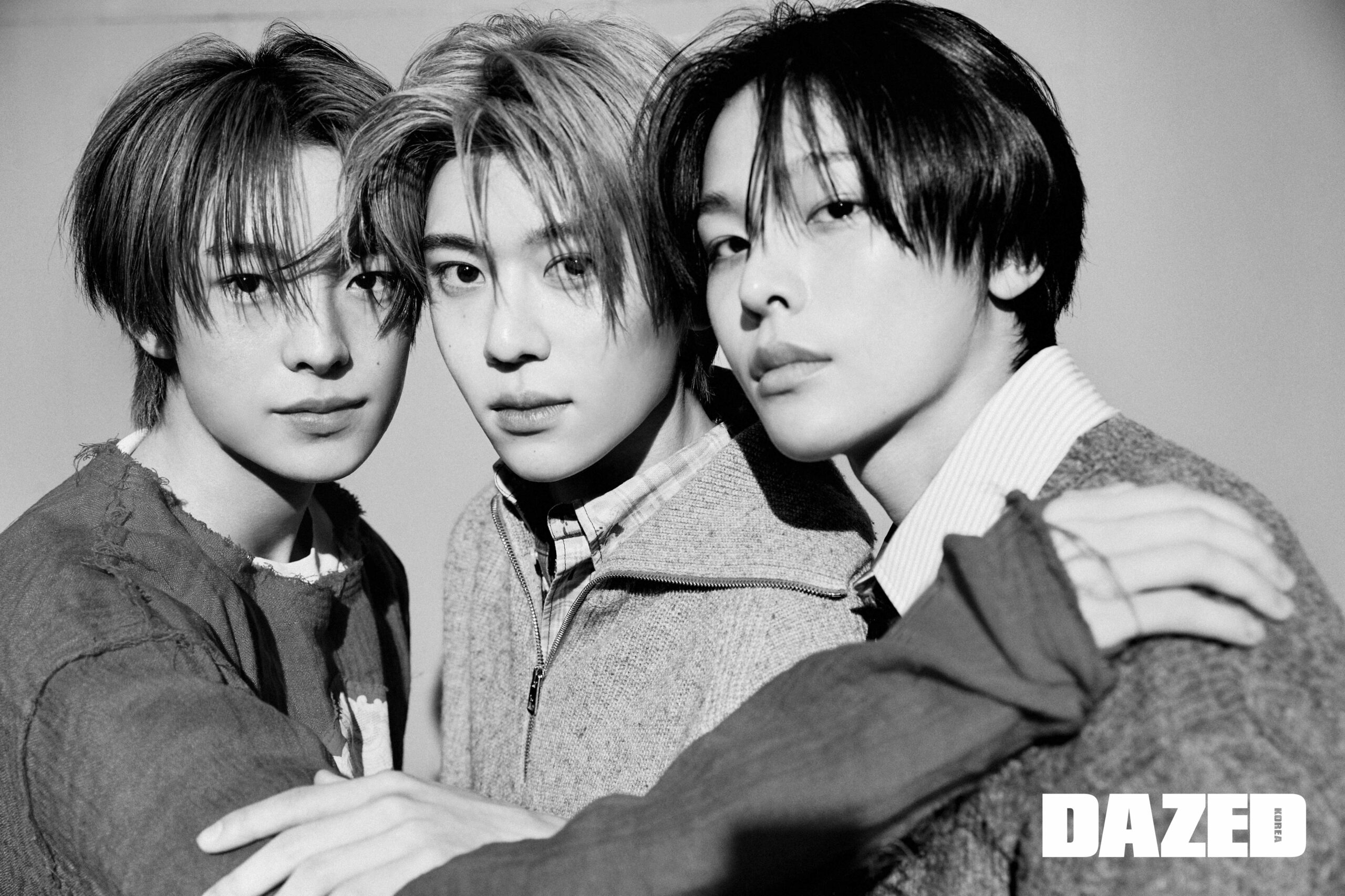 유우시가 입은 니트와 팬츠는 아크네 스튜디오(Acne Studios), 스니커즈는 마르니(Marni), 화이트 슬리브는 스타일리스트의 것. 시온이 입은 니트는 메종 키츠네(Maison Kitsune), 셔츠는 아크네 스튜디오(Acne Studios), 팬츠는 폴로 랄프 로렌(Polo Ralph Lauren), 네크리스는 마티네알리(Martineali). 리쿠가 입은 그레이 니트와 셔츠, 타이는 모두 메종 마르지엘라(Maison Margiela), 블랙 쇼츠는 메종 키츠네(Maison Kitsune).
