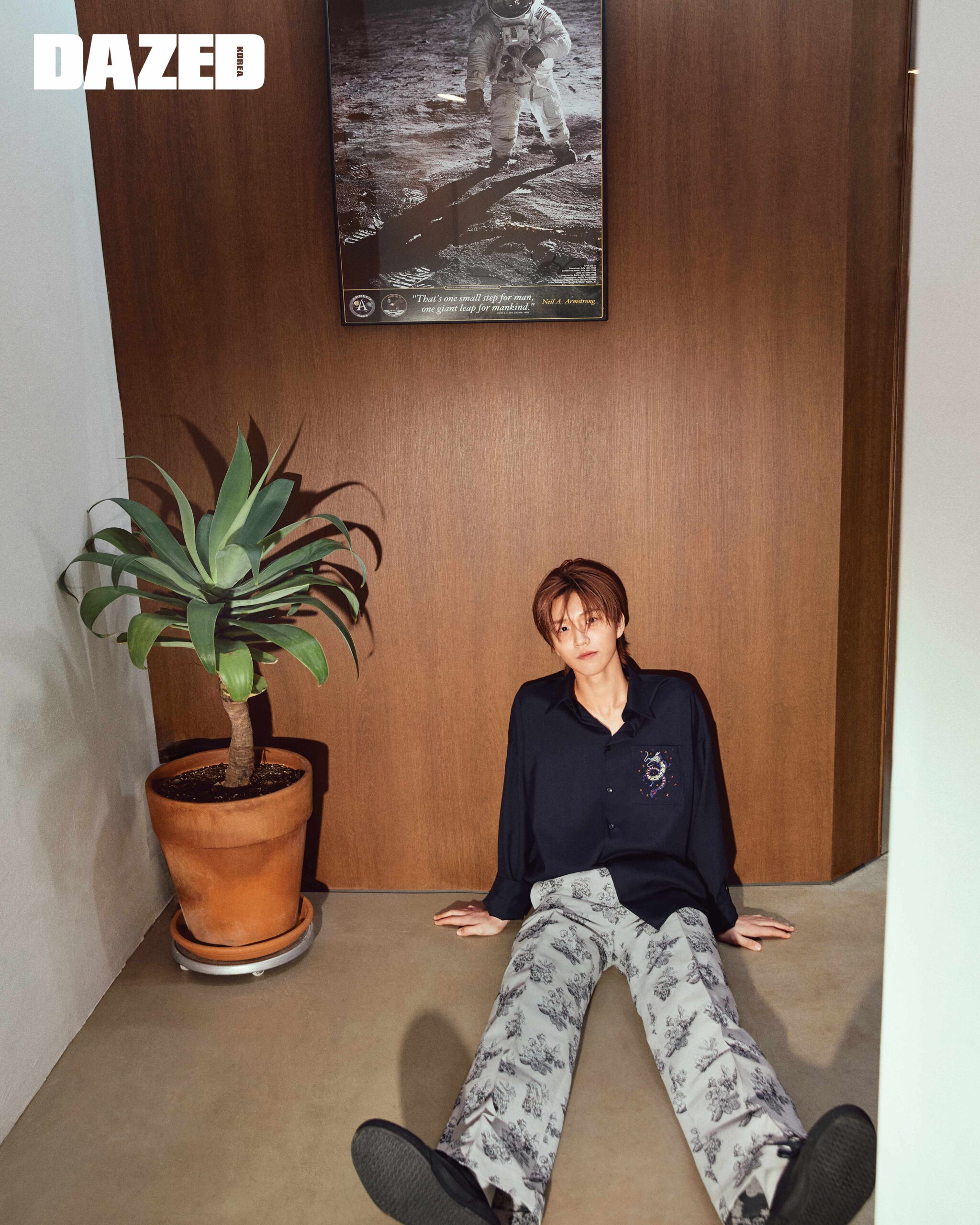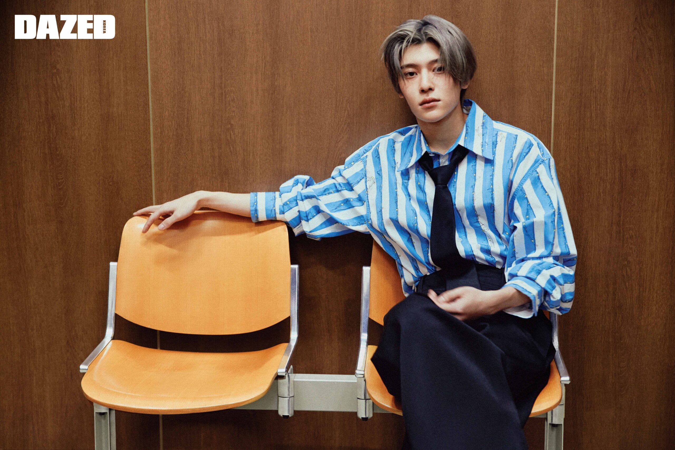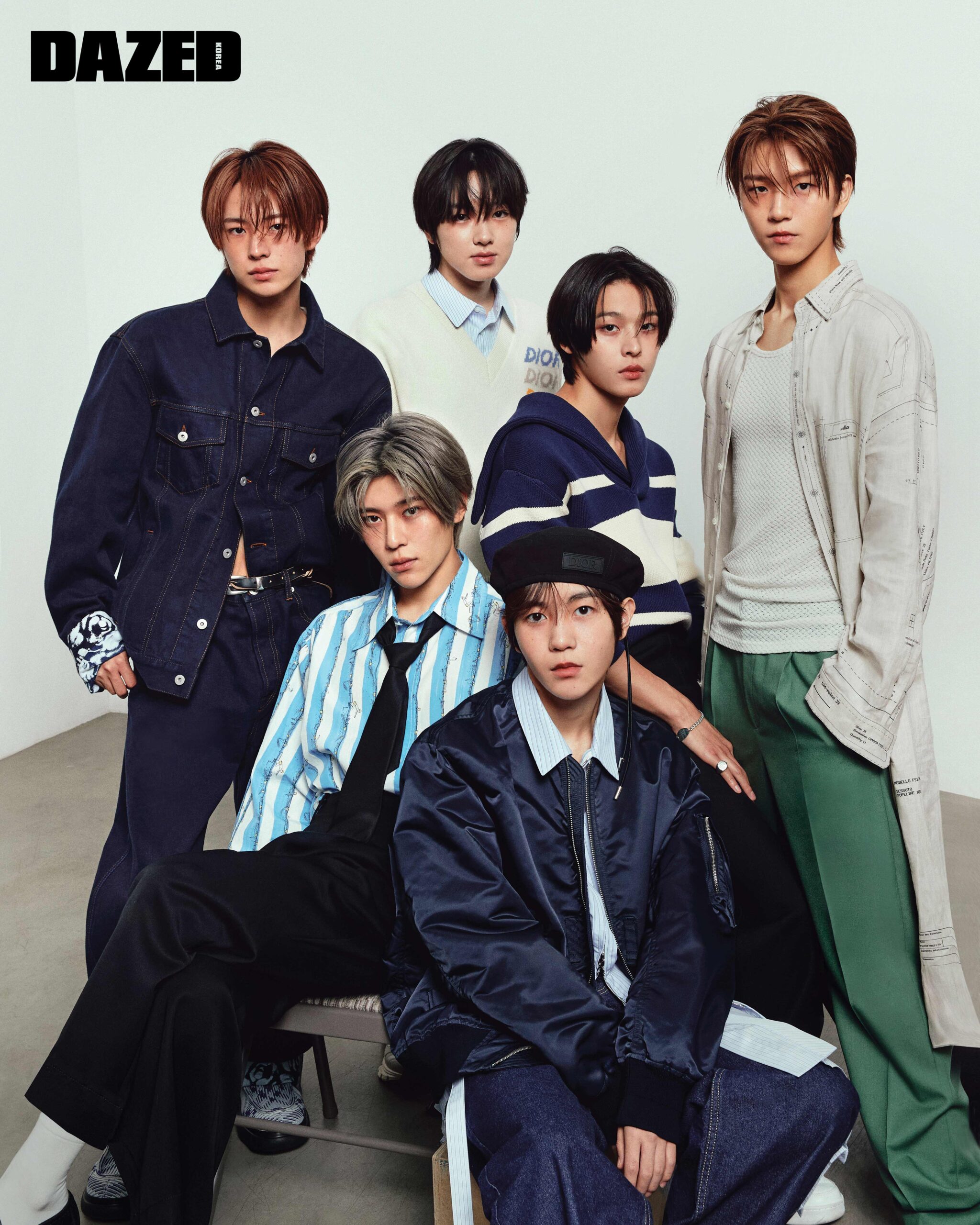 유우시가 입은 데님 재킷과 팬츠 셋업, 슈즈는 모두 버버리(Burberry), 벨트는 아워레가시(Our Legacy). 사쿠야가 착용한 니트 베스트와 셔츠는 디올 맨(Dior Men). 리쿠가 입은 배색 니트와 블랙 팬츠, 브레이슬릿과 링은 모두 구찌(Gucci), 스니커즈는 스타일리스트의 것. 재희가 입은 로브 셔츠와 그린 팬츠는 펜디(Fendi),이너로 입은 슬리브리스 톱은 스타일리스트의 것. 시온이 입은 스트라이프 셔츠와 블랙 팬츠, 타이는 모두 보테가 베네타(Bottega Veneta), 삭스는 스타일리스트의 것. 료가 입은 새틴 블루종과 스트라이프 셔츠, 스커트 벨트, 베레는 모두 디올 맨(Dior Men), 데님 팬츠는 스타일리스트의 것.