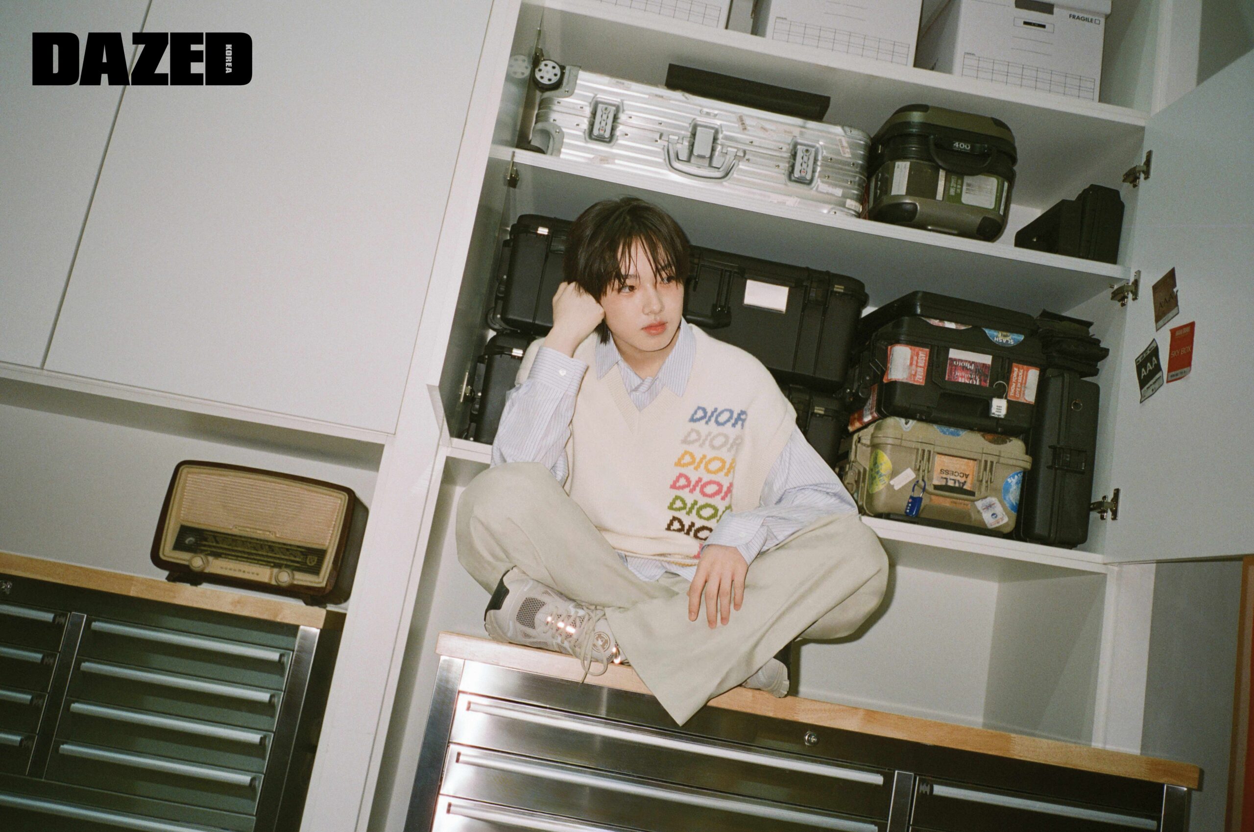 니트 베스트와 셔츠, 팬츠는 모두 디올 맨(Dior Men), 스니커즈는 악셀 아리가토(Axel Arigato).