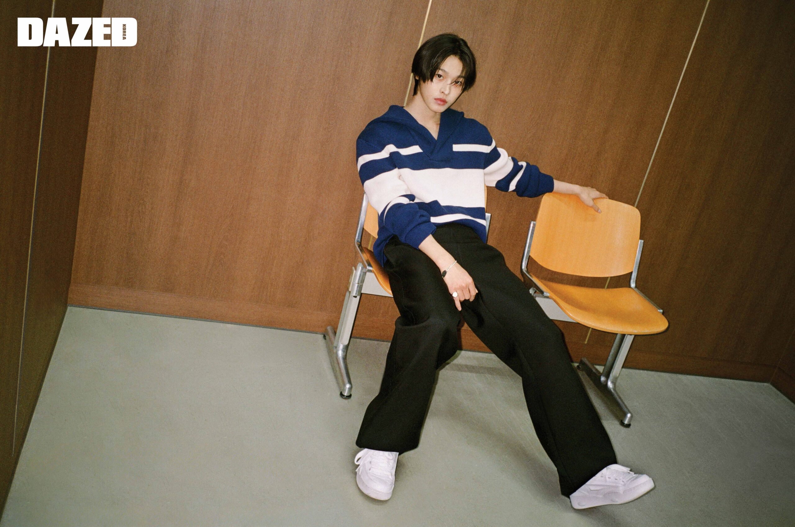 배색 니트 후디와 블랙 팬츠, 링, 브레이슬릿은 모두 구찌(Gucci), 스니커즈는 스타일리스트의 것.