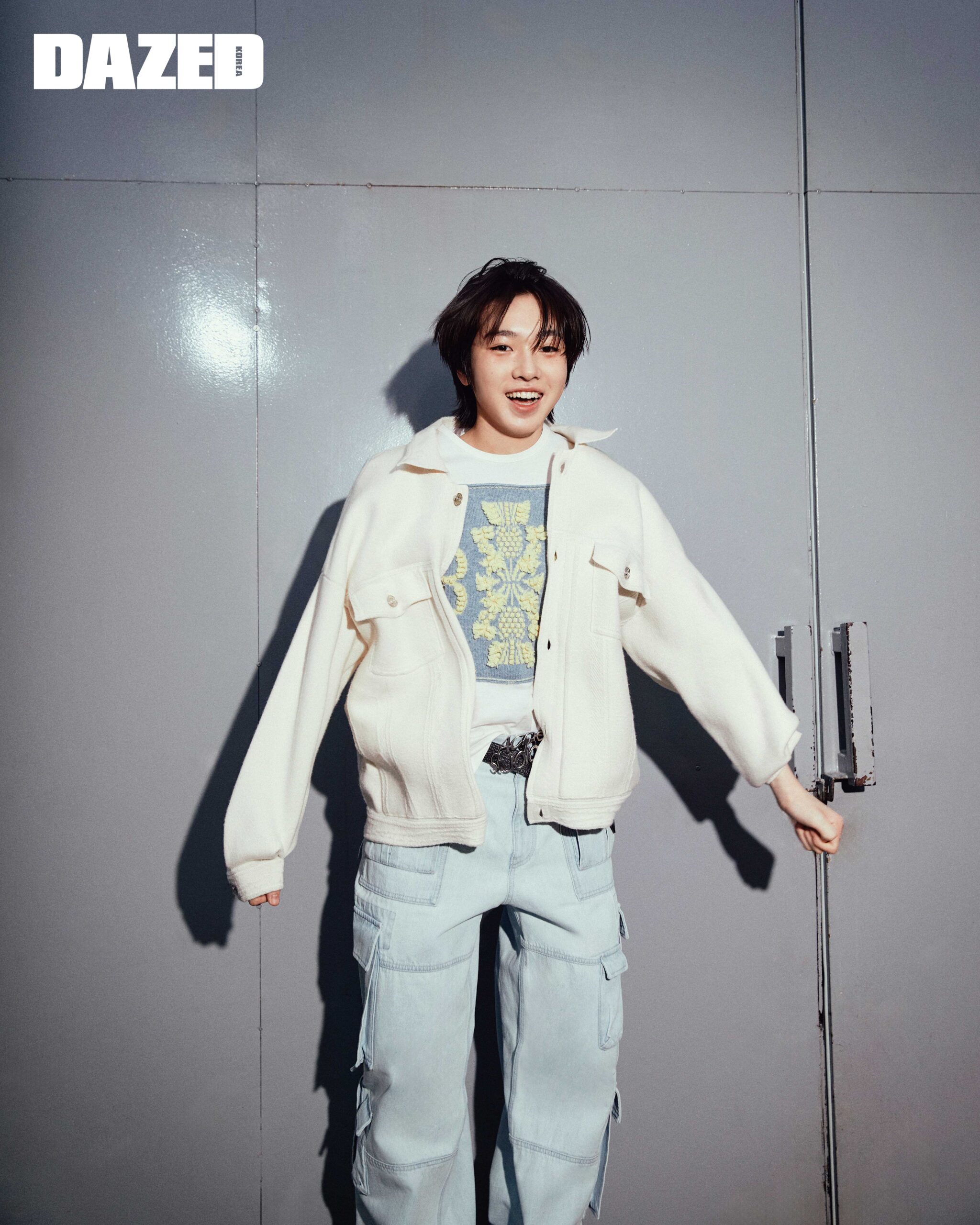 화이트 재킷과 자수 디테일 슬리브는 배리(Barrie), 데님 팬츠는 베르사체(Versace), 빅 버클 벨트는 아크네 스튜디오(Acne Studios).