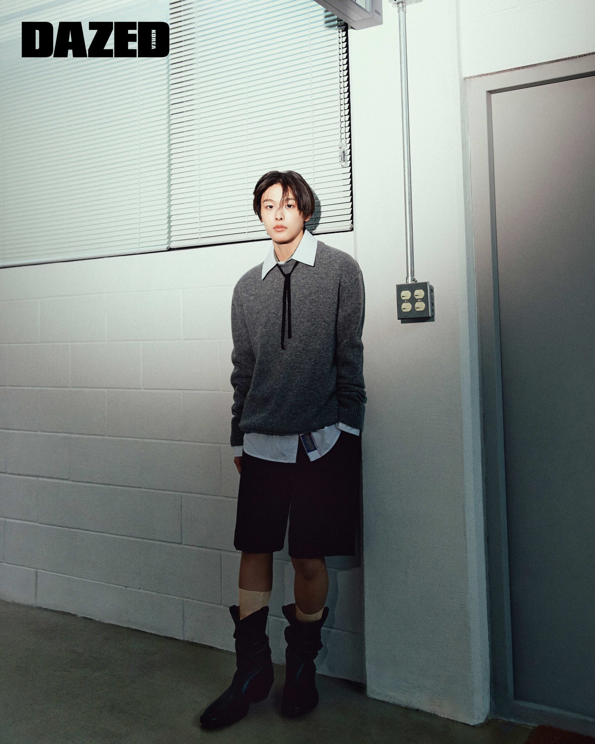 그레이 니트와 셔츠, 타이, 부츠는 모두 메종 마르지엘라(Maison Margiela), 블랙 쇼츠는 메종 키츠네(Maison Kitsune), 삭스는 아크네 스튜디오(Acne Studios).