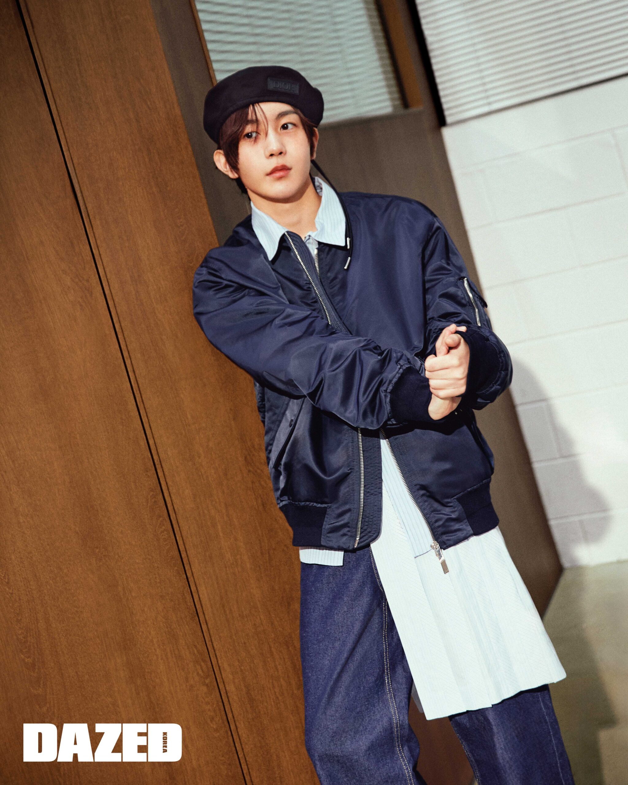 새틴 블루종과 스트라이프 셔츠, 스커트 벨트, 베레는 모두 디올 맨(Dior Men), 데님 팬츠는 스타일리스트의 것.