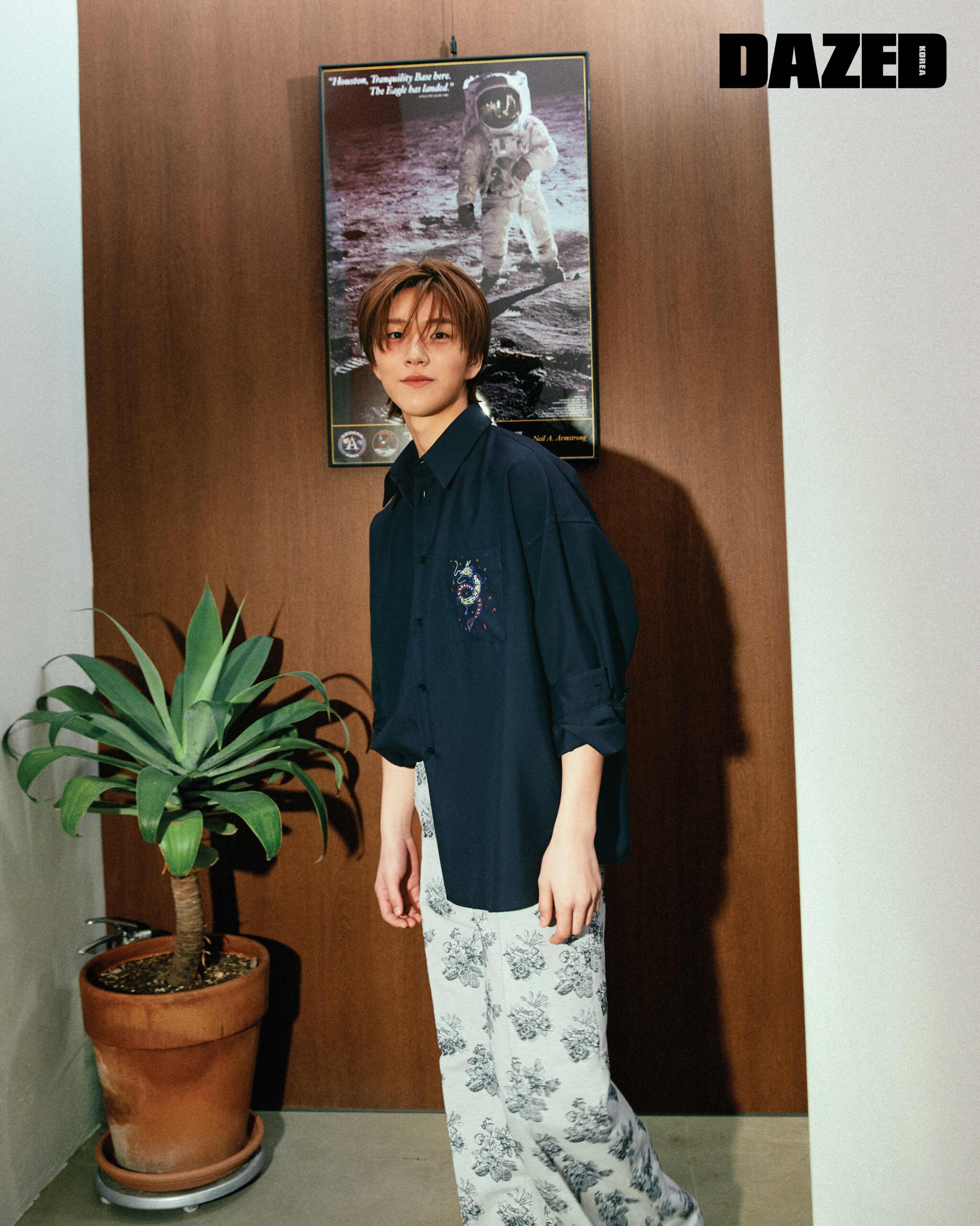 자수 디테일 셔츠는 마르니(Marni), 패턴 팬츠는 메종 키츠네(Maison Kitsune), 블랙 스니커즈는 앤더슨벨(Andersson Bell).