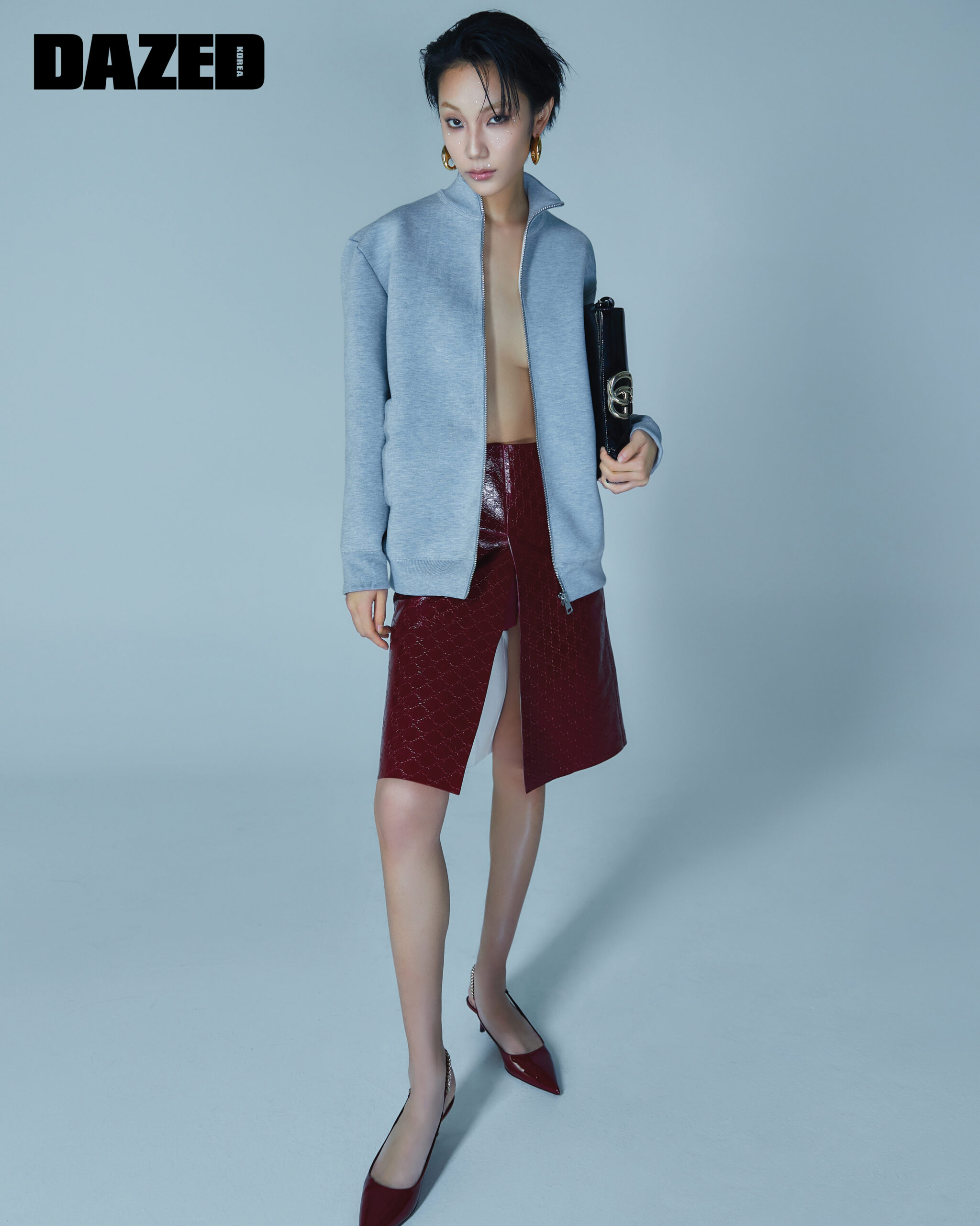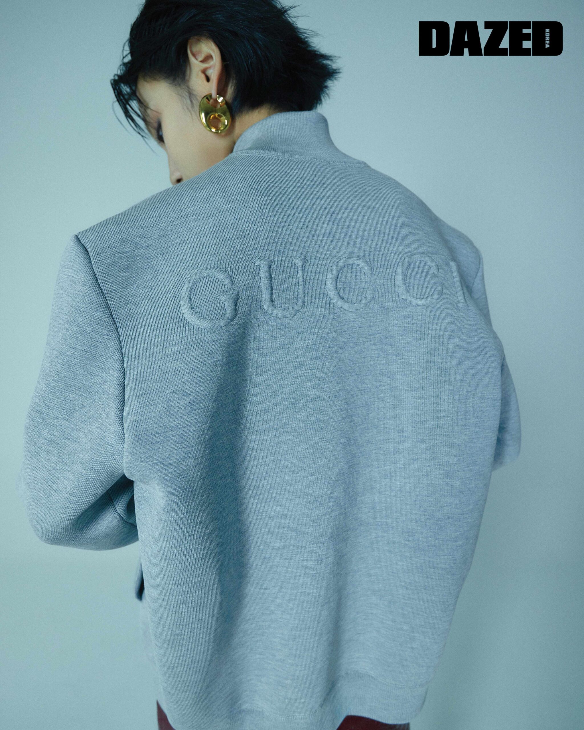 라이트 그레이 실크 울 스웨트셔츠와 슬릿 디테일의 올오버 GG 엠보스 로소 앙코라 레더 미디스커트, 마리나 체인 디테일의 골드 피니시 메탈 이어링은 모두 구찌(Gucci).
